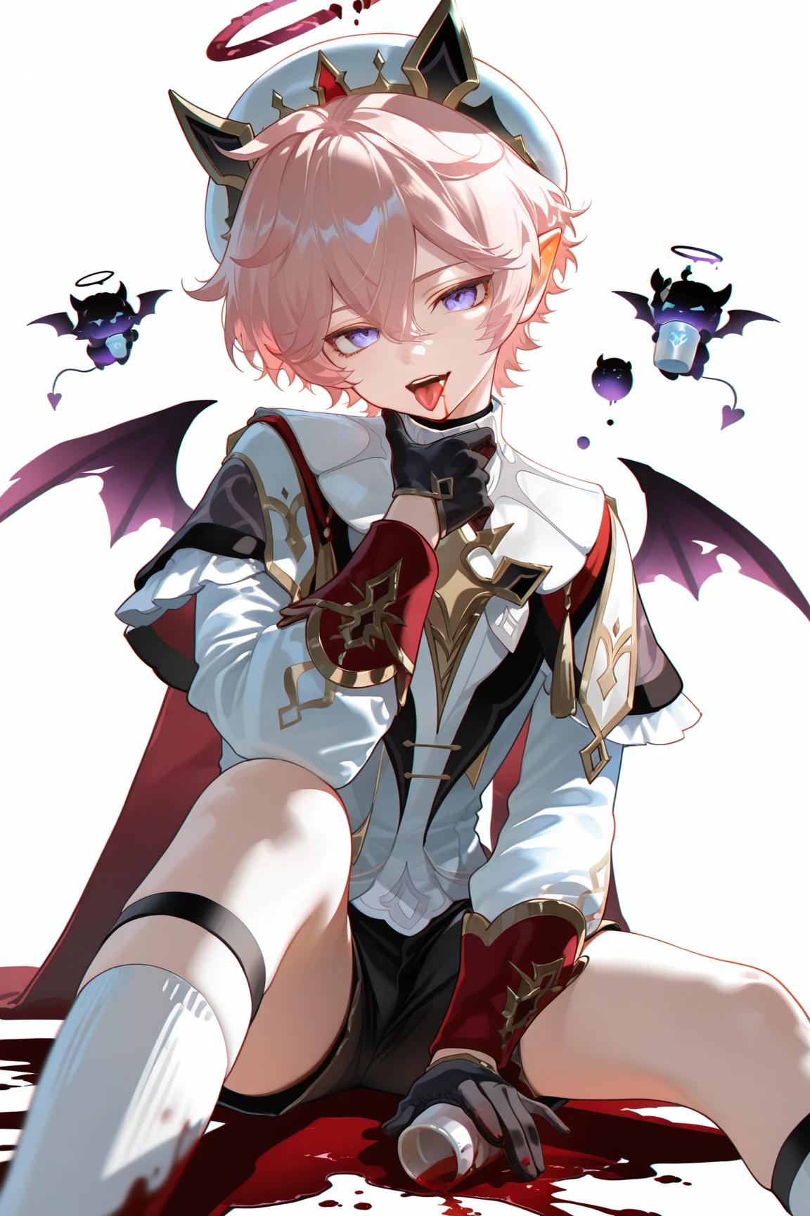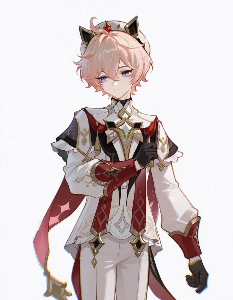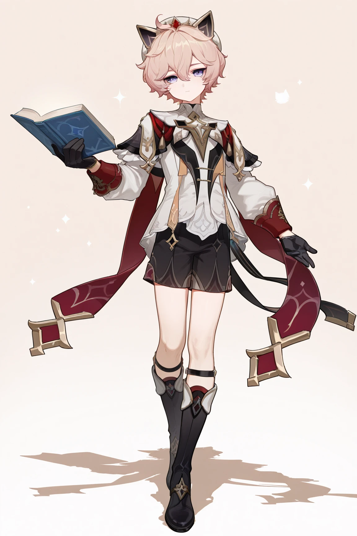 dahlia \(genshin impact\), 1boy, short hair, pink hair, purple eyes, whiet shirt, black gloves, shorts, hat, male focus, long sleeves, black shorts, hair between eyes