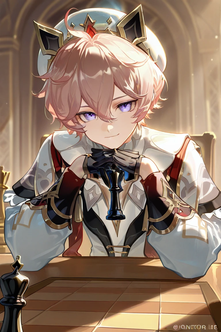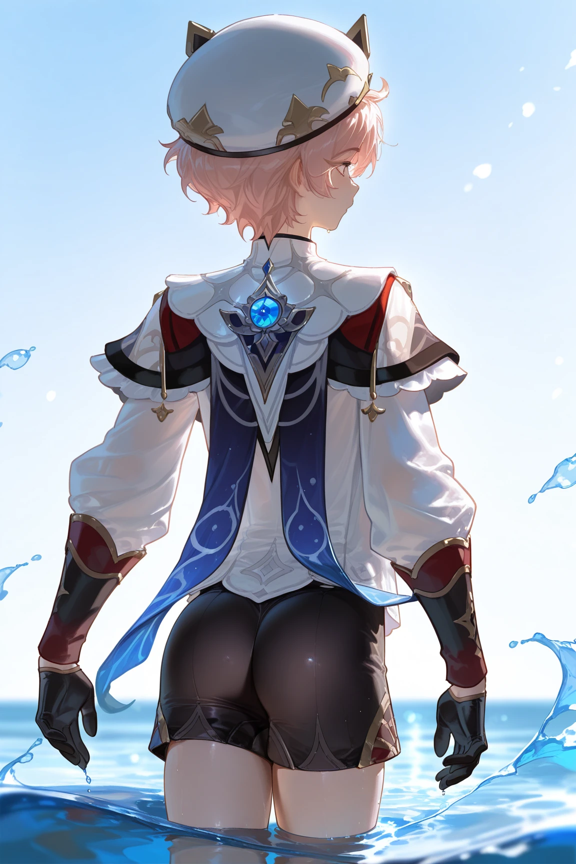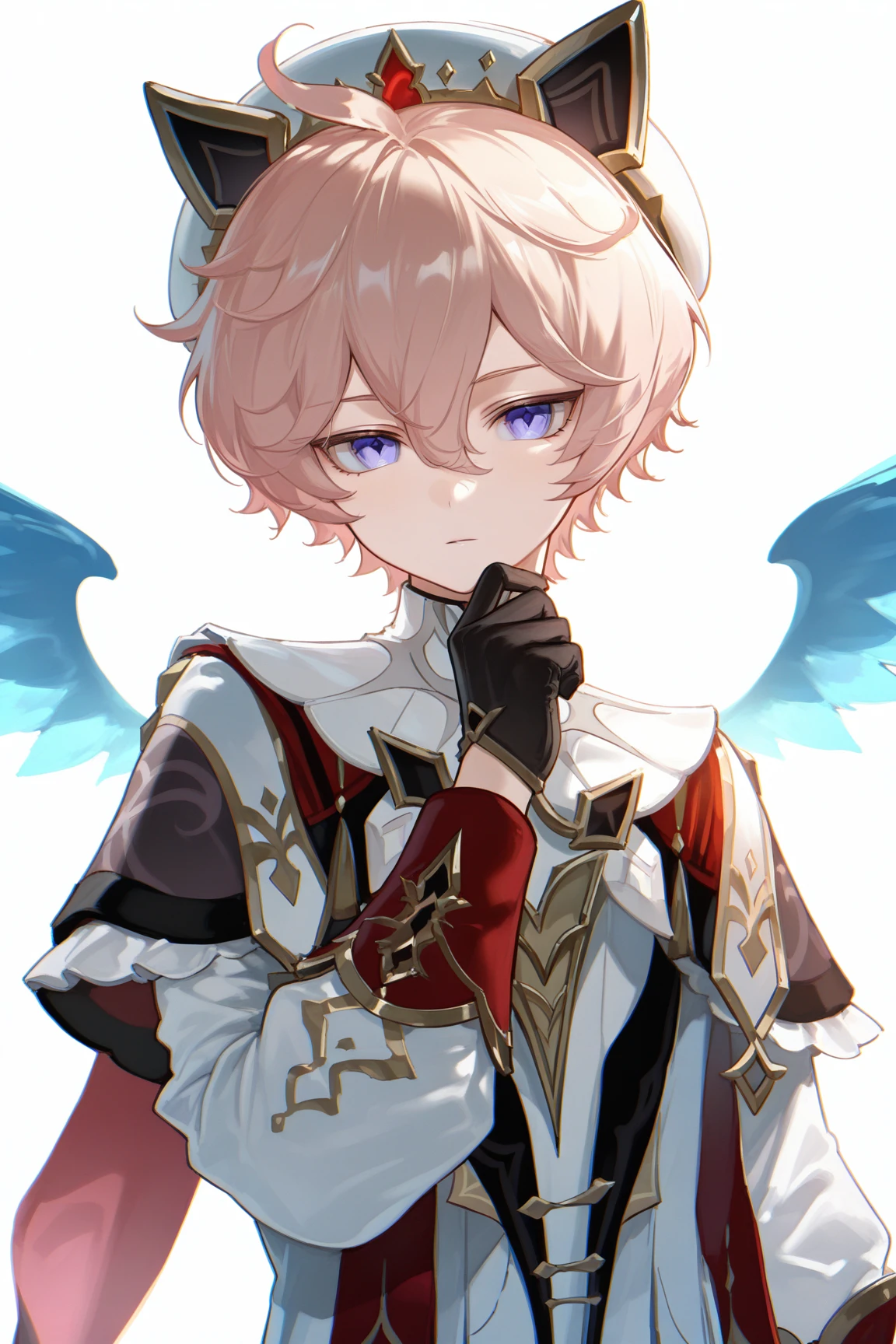 dahlia \(genshin impact\), 1boy, short hair, pink hair, purple eyes, whiet shirt, black gloves, shorts, hat, male focus, long sleeves, black shorts, hair between eyes