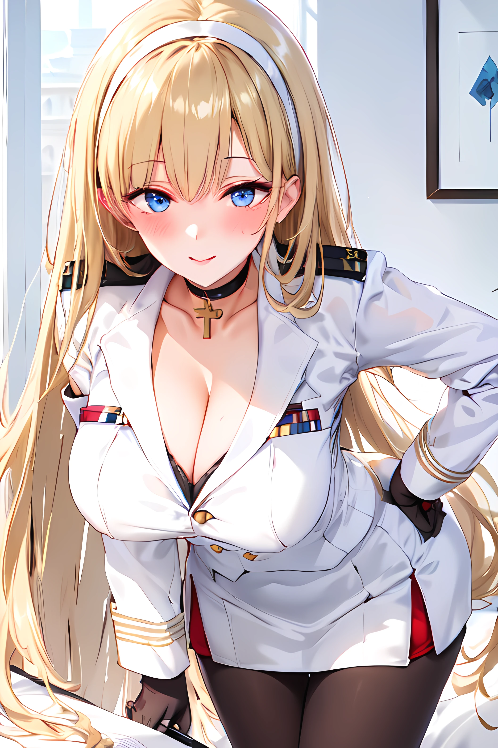 north carolina \(azur lane\),bangs,black_gloves, blonde_hair, blue_eyes,large breasts, choker, eyebrows_visible_through_hair, gloves, hairband, long_hair, long_sleeves, white military uniform,black pantyhose, white pencil_skirt,