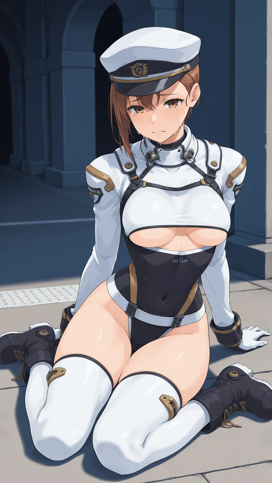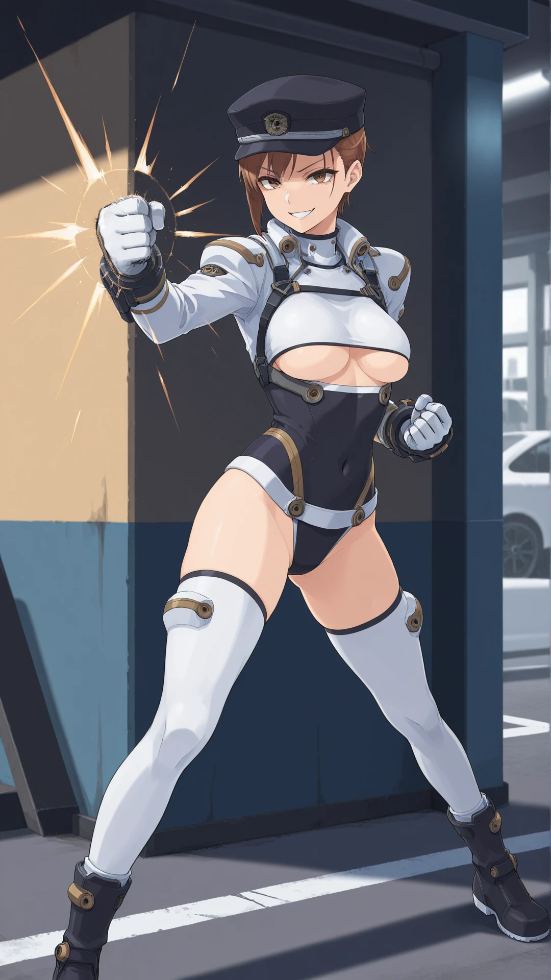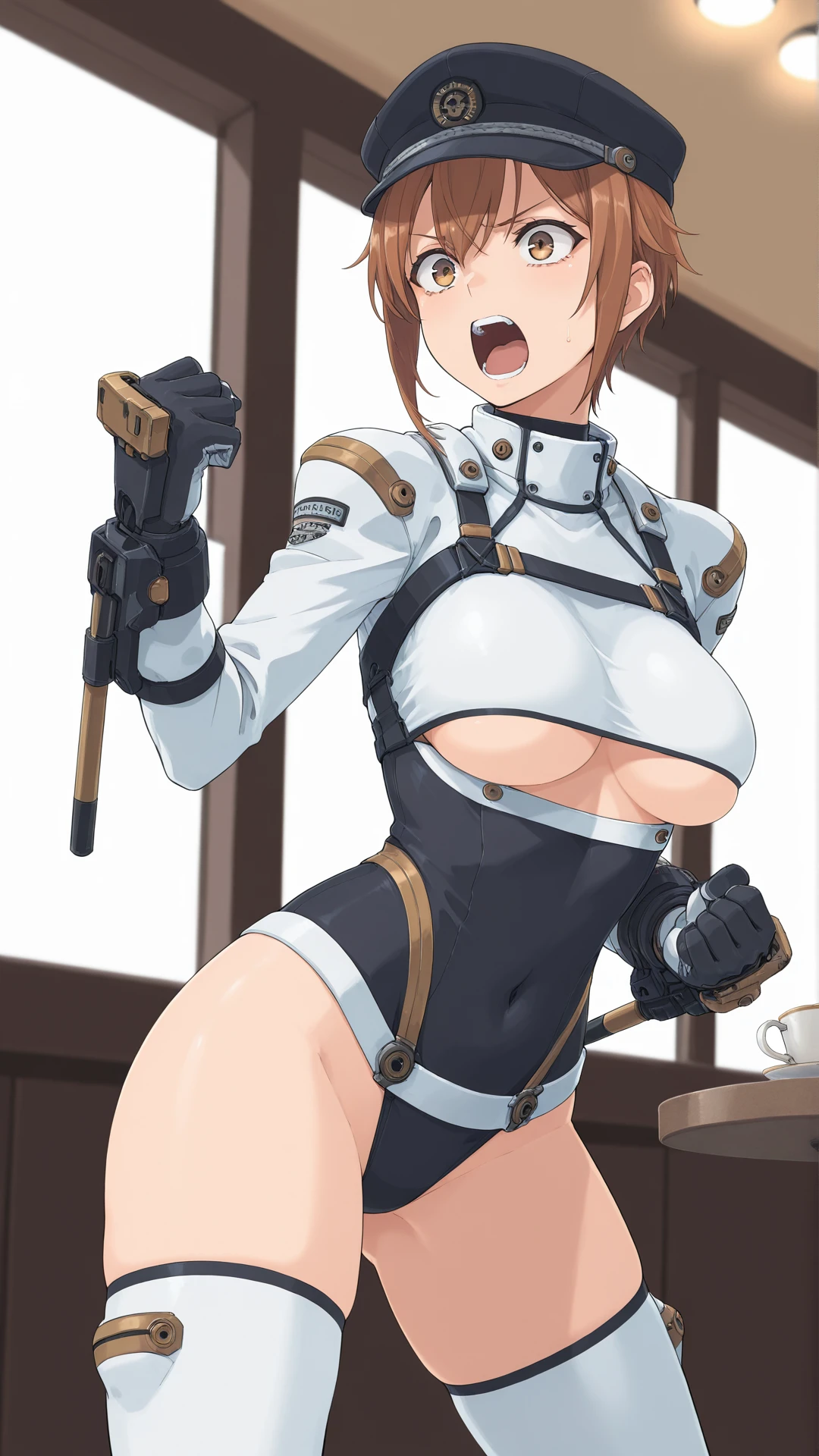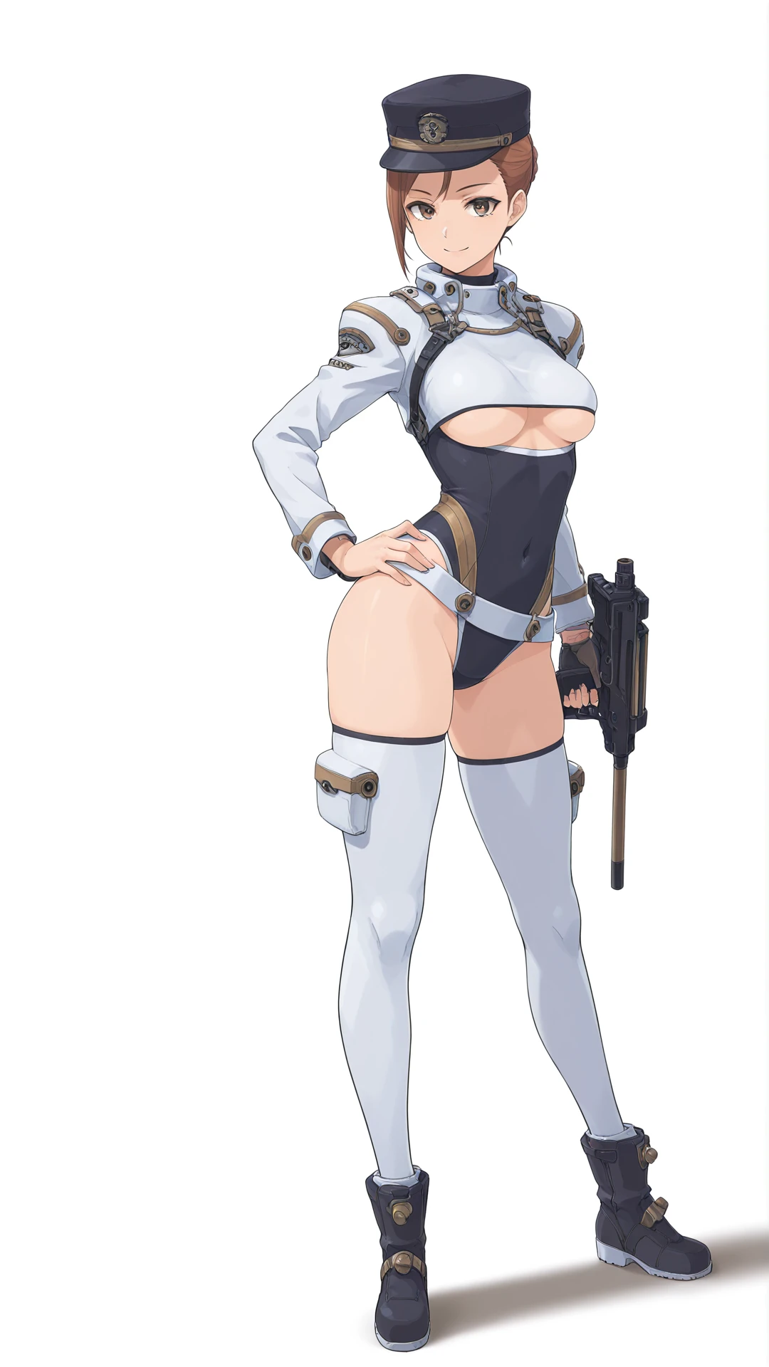 solis_r8000, brown_hair, short_hair, brown_eyes, medium_breasts, leotard, underboob, white_thighhighs, boots, covered_navel,hat
