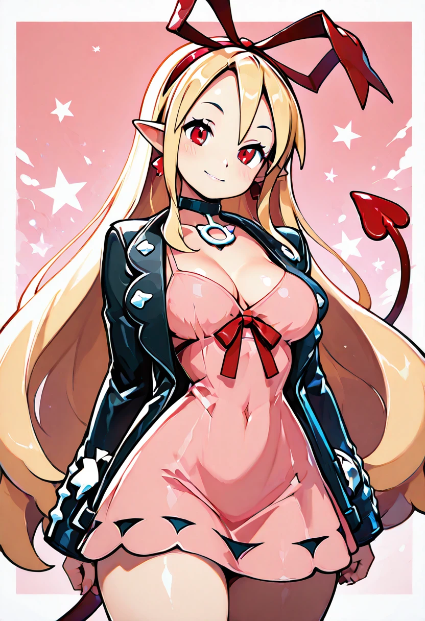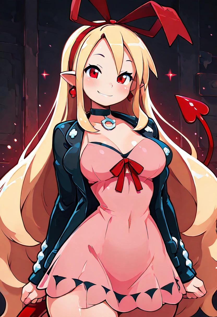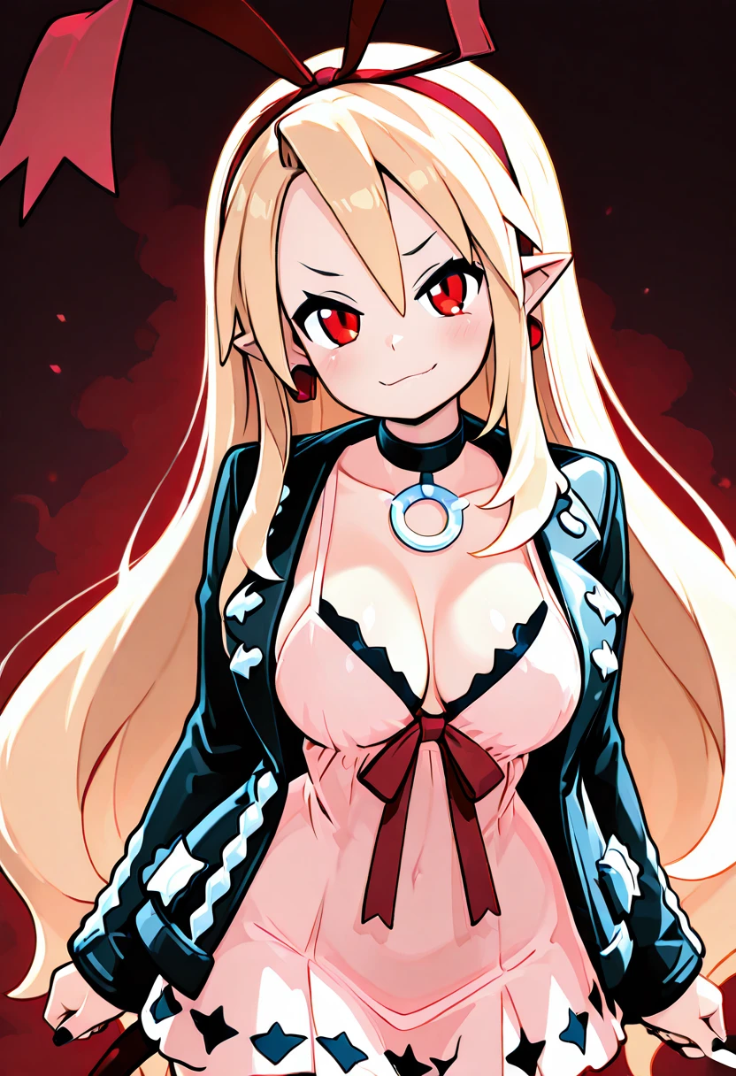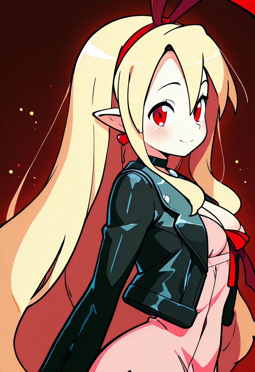zzMarFlon, red eyes, demon girl, pointy ears, red eyes, blonde hair, long hair, black choker, red hairband, red ribbon, black jacket, open jacket, pink dress,