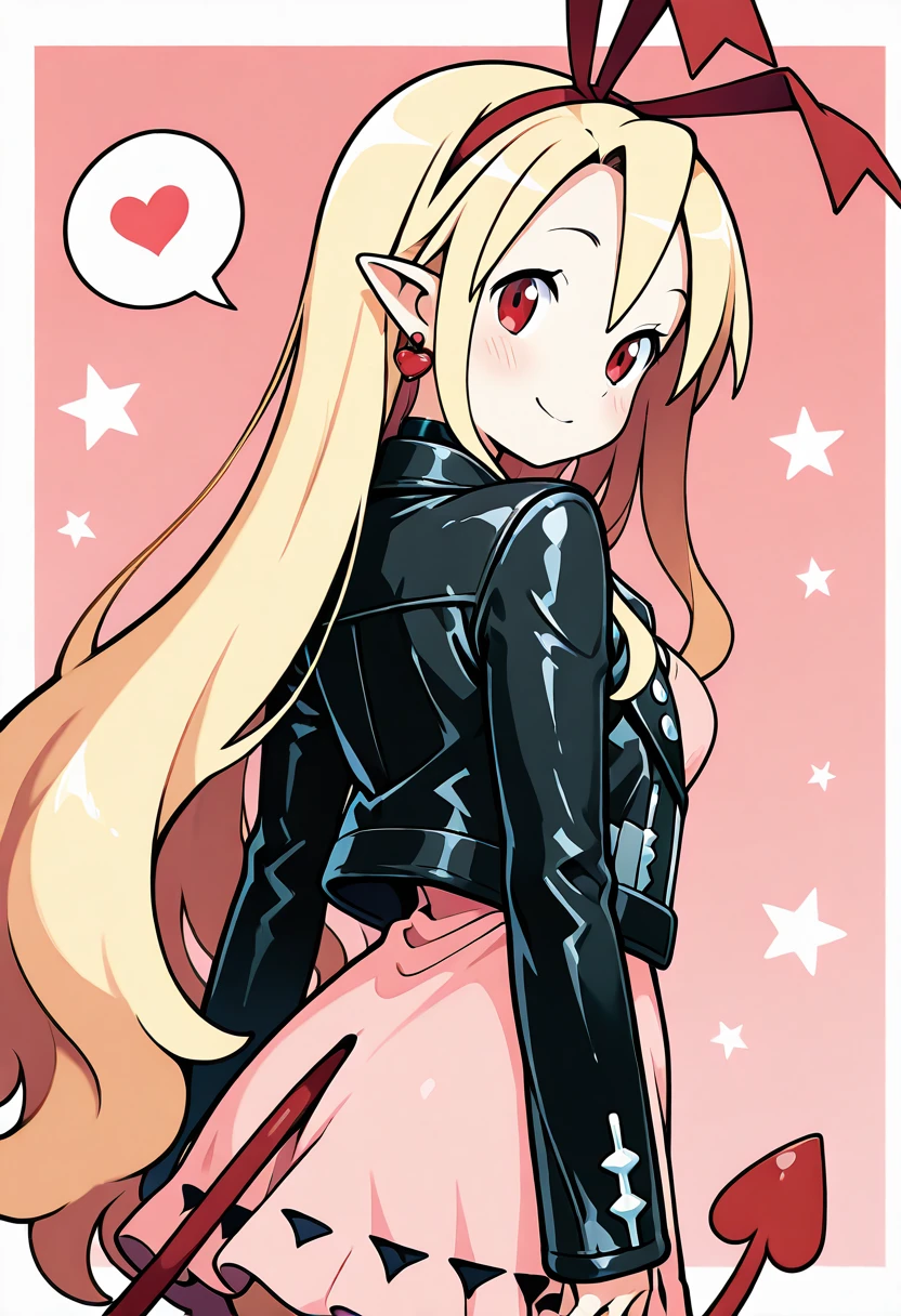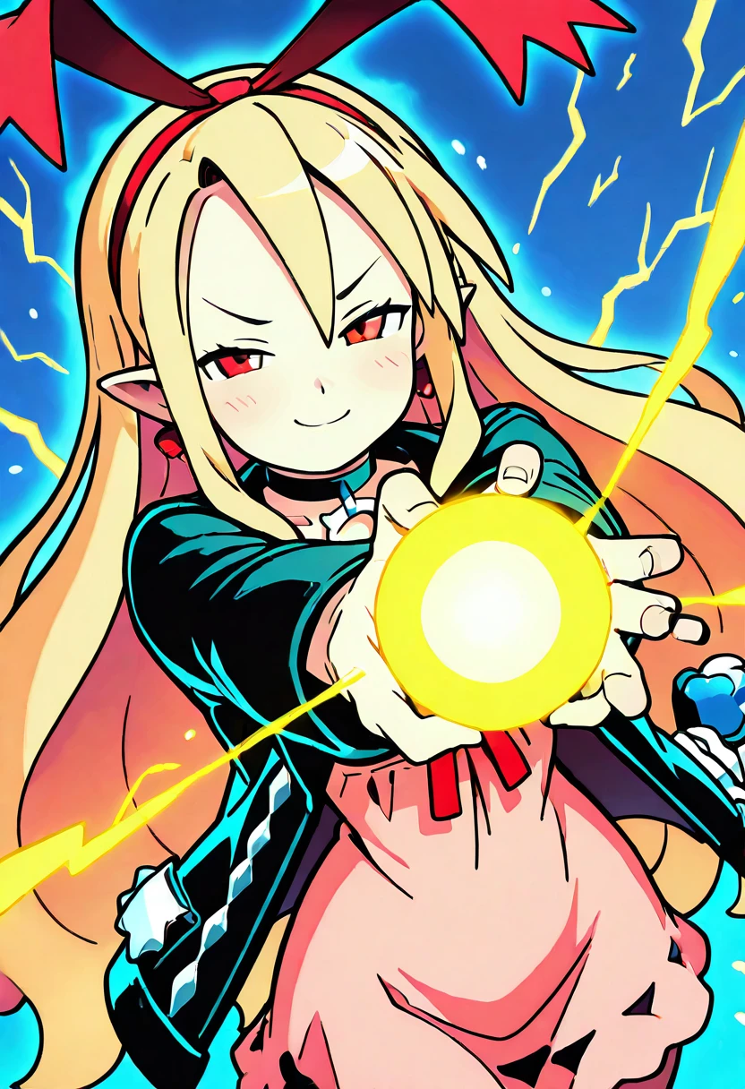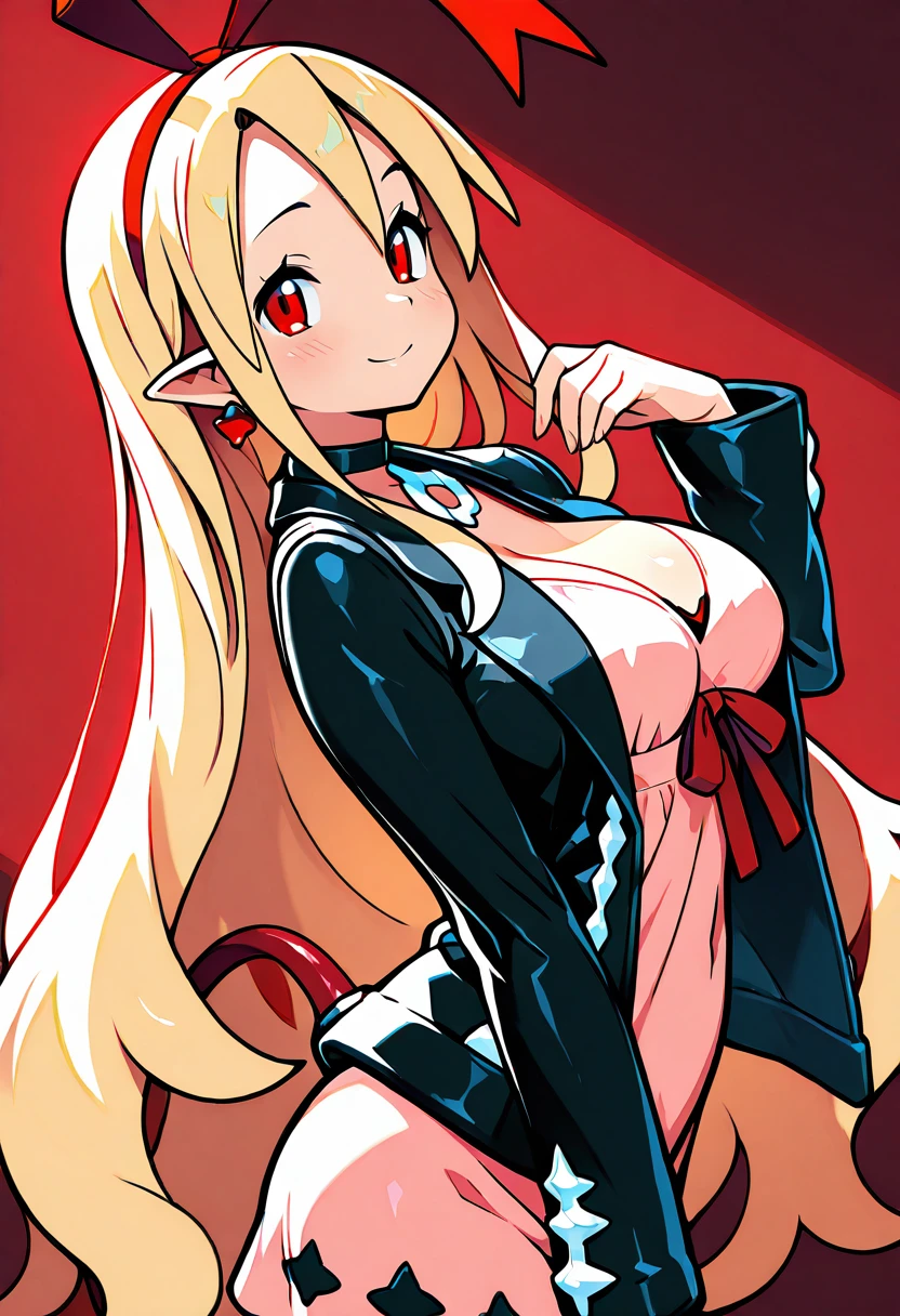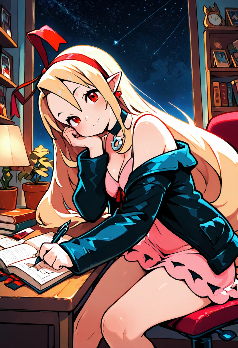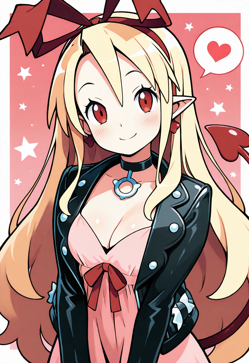 zzMarFlon, red eyes, demon girl, pointy ears, red eyes, blonde hair, long hair, black choker, red hairband, red ribbon, black jacket, open jacket, pink dress,