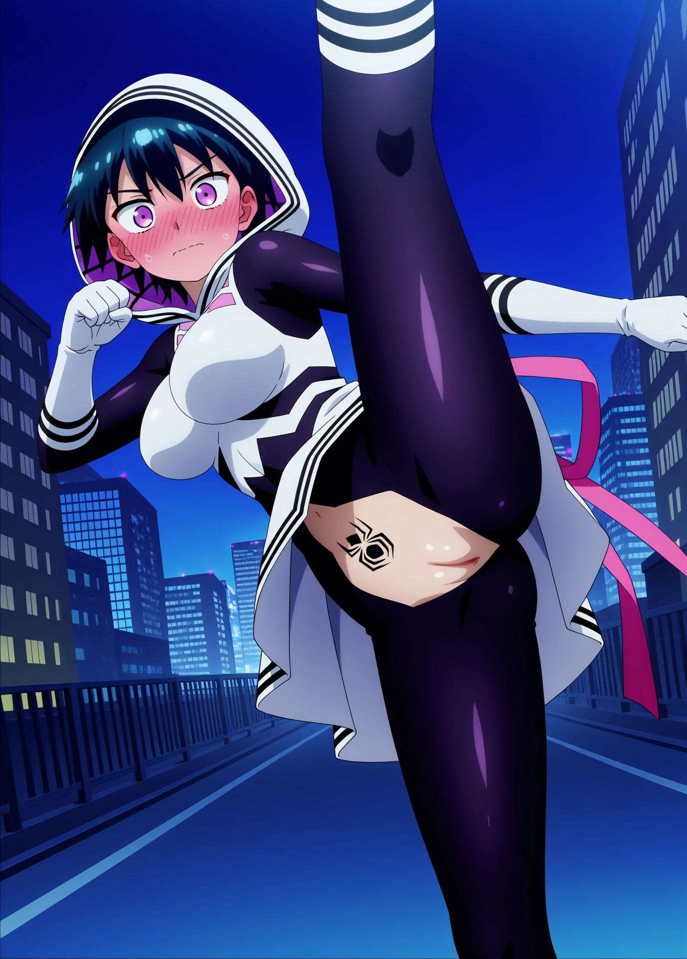 Hyuuga_Aoi, Mahou_Shoujo × Haiboku_Saiban, 1girl, purple_eyes, black_purple_hair, short_hair, tomboy, hair_between_eyes, hood, magical girl spider costume, crotchless_pants, purple pink and white clothes, pink ribbons, white boots, spider tattoo,
