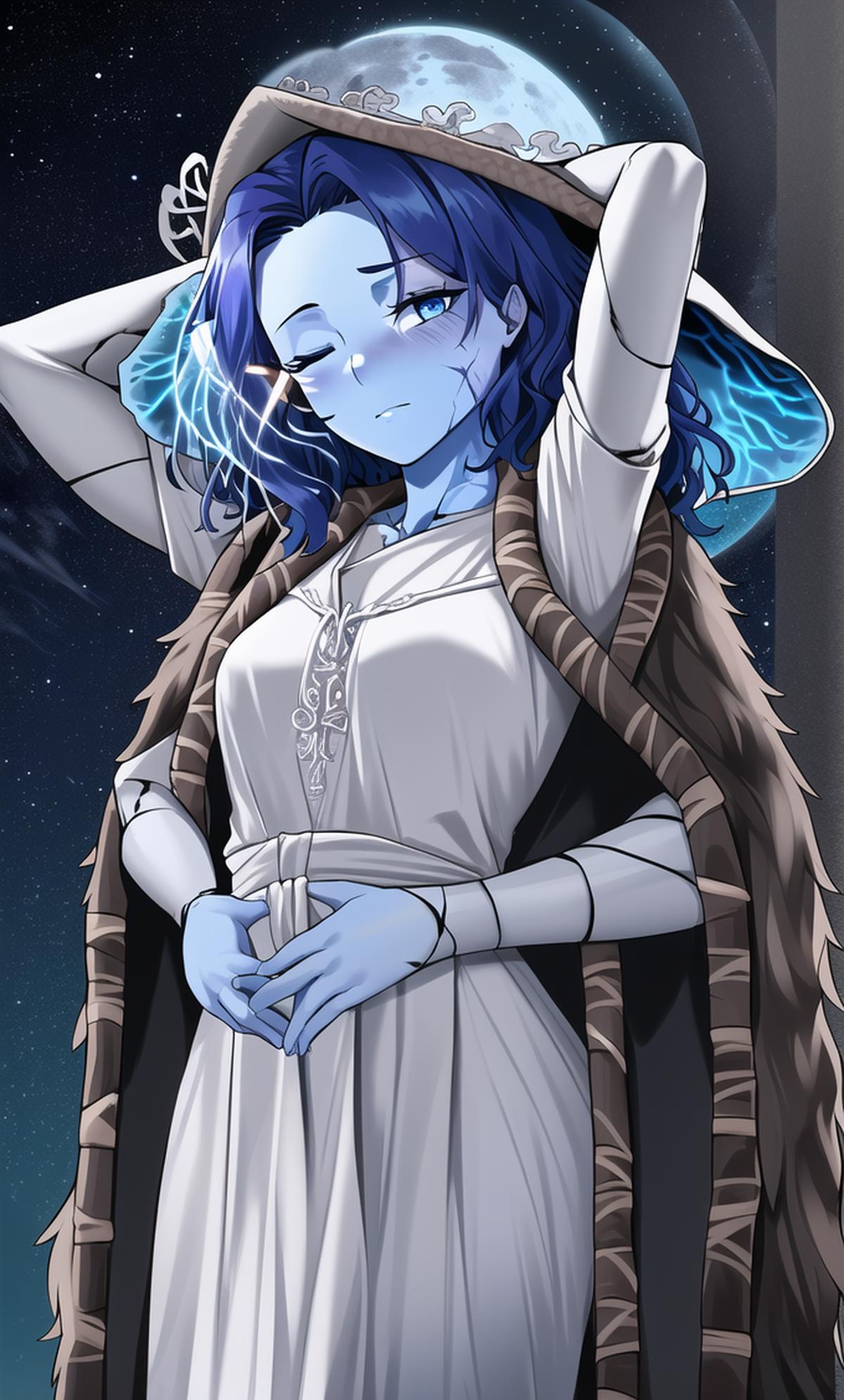 This was a fun challenge, and perhaps no surprise that SD doesn't really want to generate images with 4 arms. I'm still not sure if it helps but I think you should include extra_arms on your prompts using this (assuming you want to go for 4-armed accuracy). Also one_eye_closed if you're a real purist. cracked_skin and doll_joints should either go in the positive or negative prompt depending on if you want lore-accurate doll-body Ranni or a smooth human body.