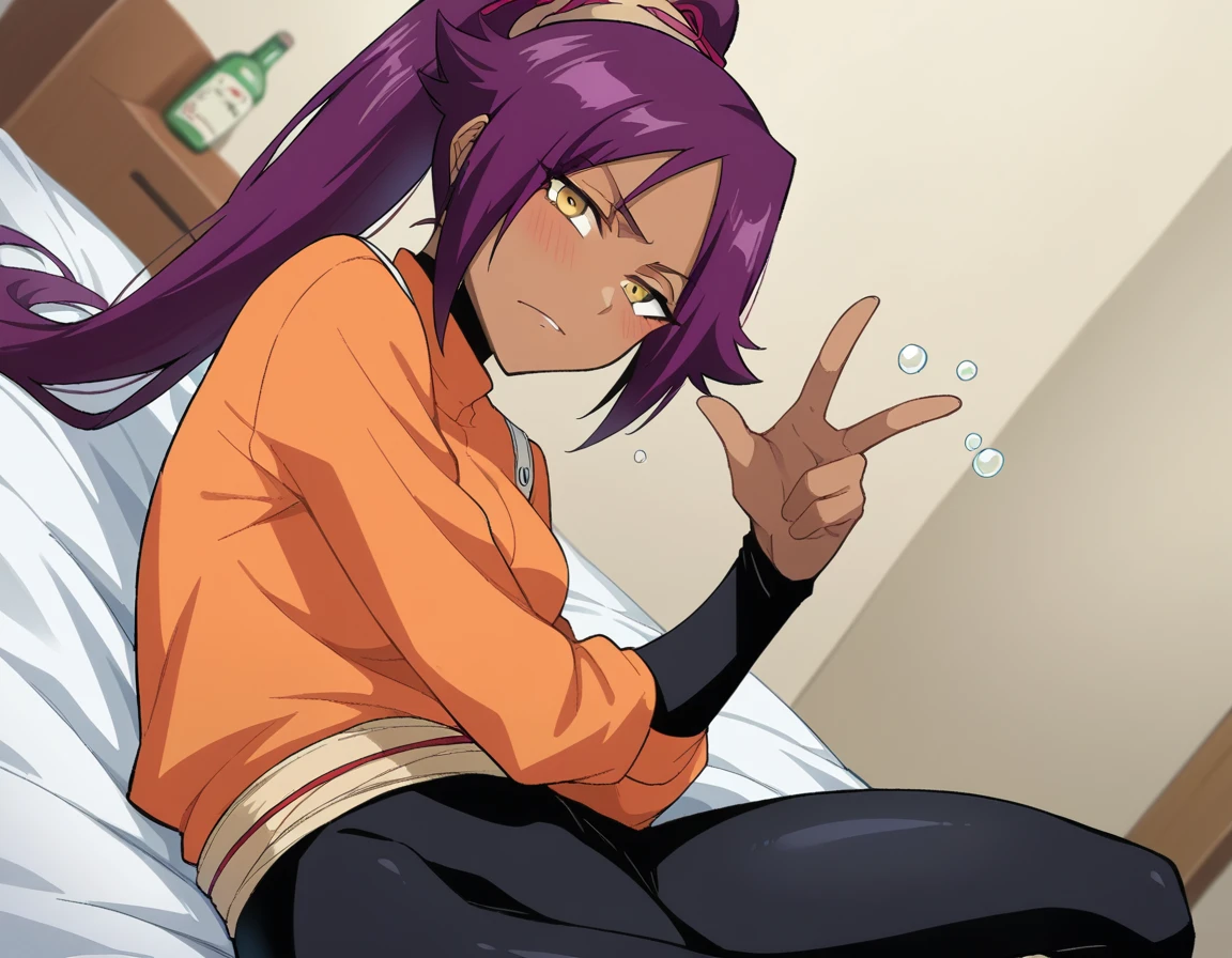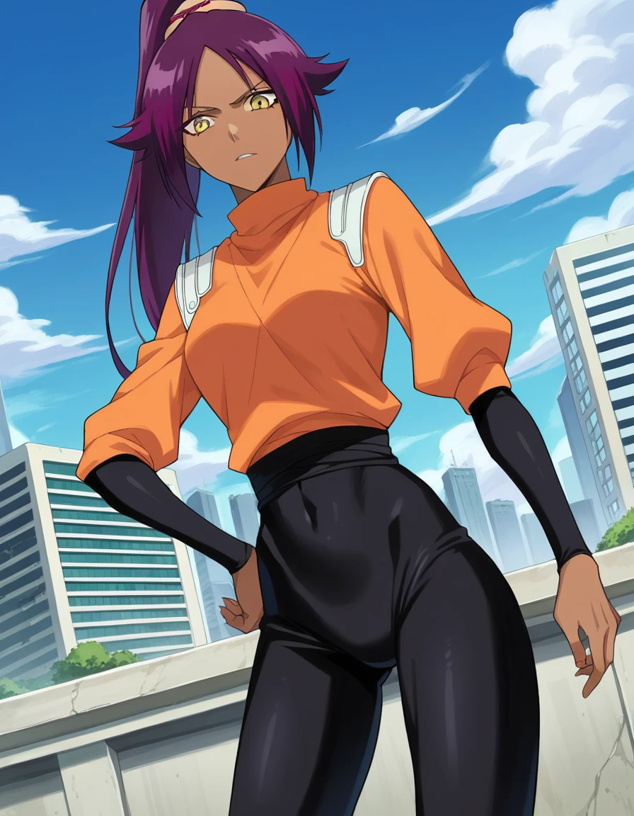 yoruichi shihouin, long hair, yellow eyes, ponytail, purple hair, dark skin, dark-skinned female,
