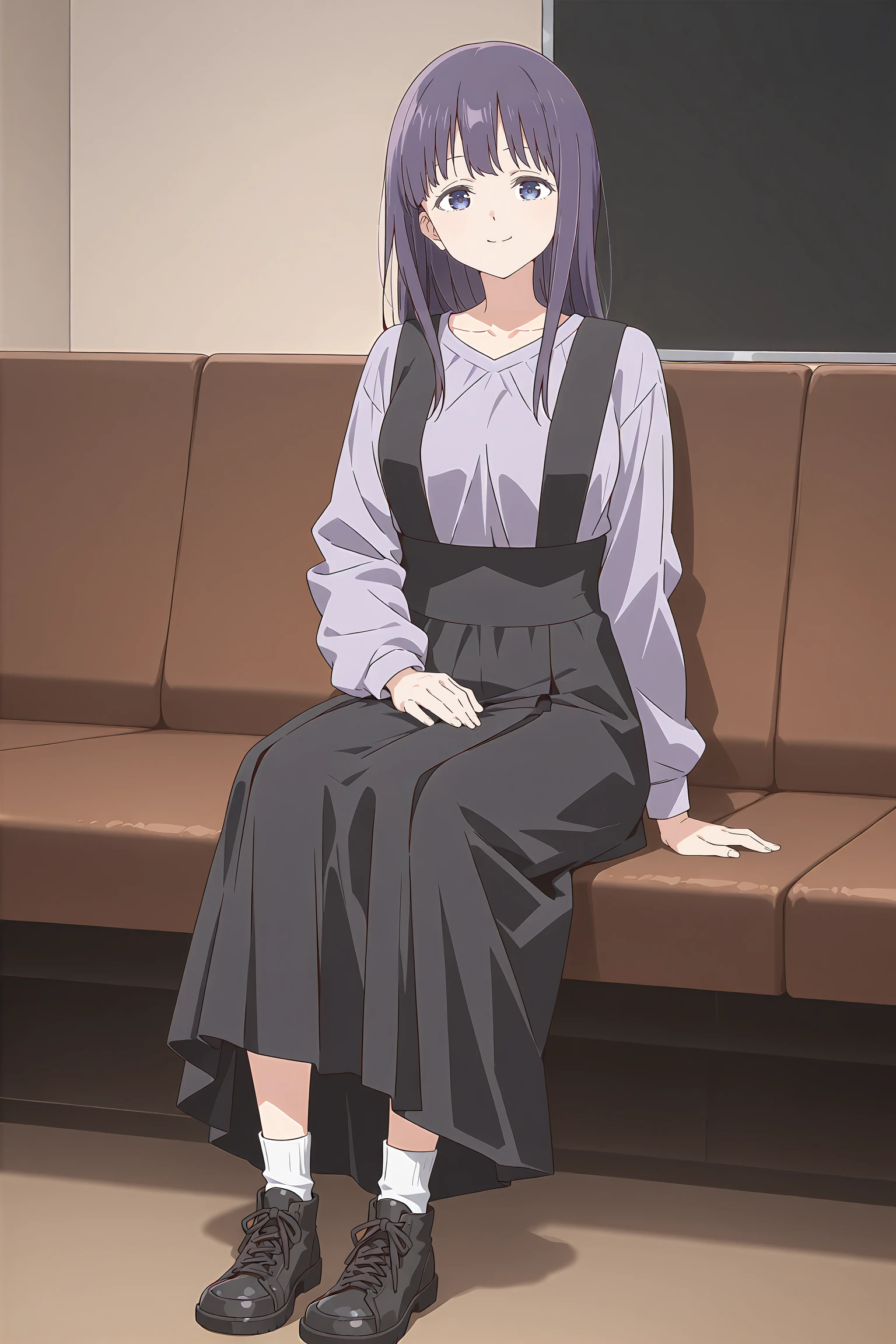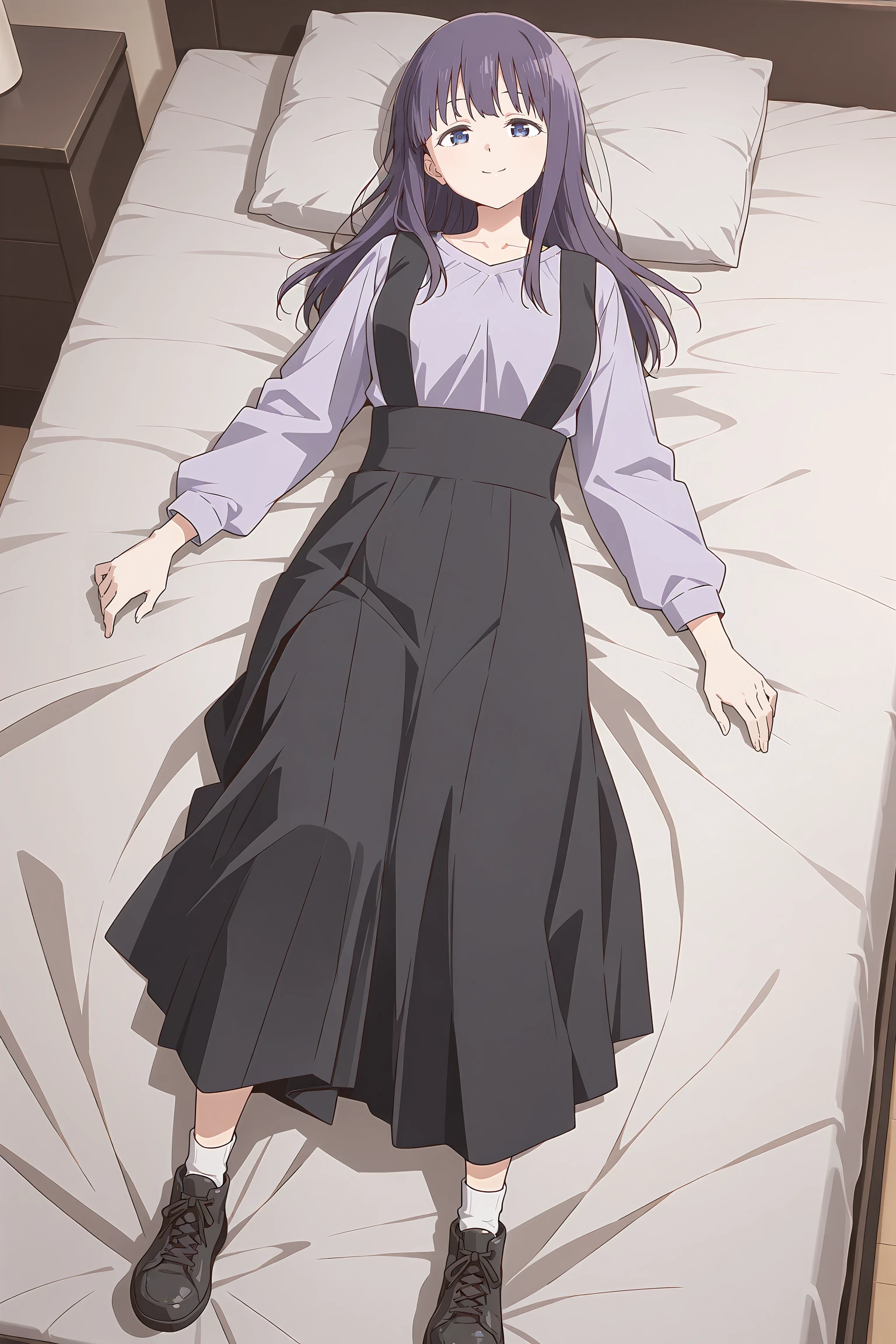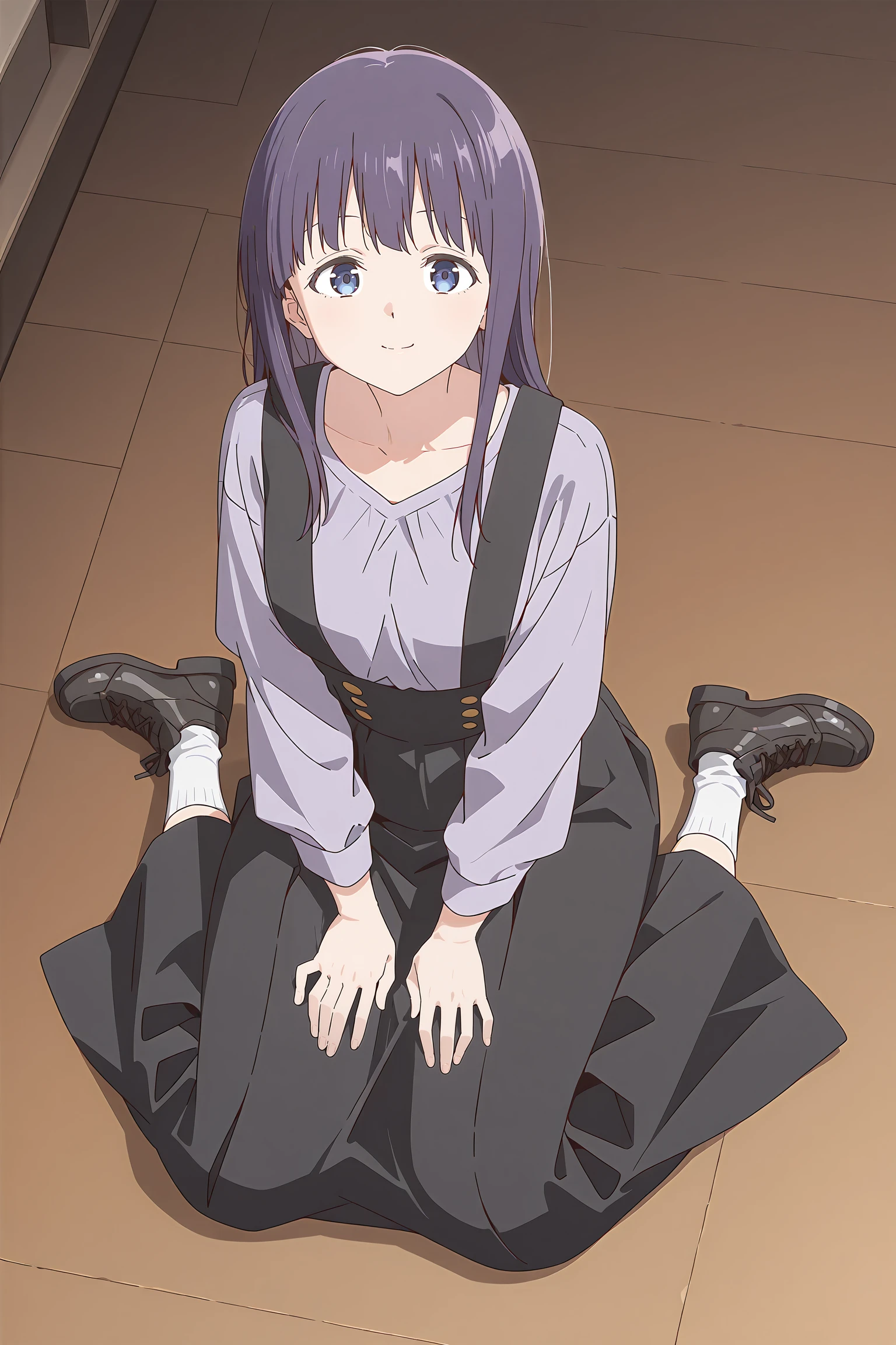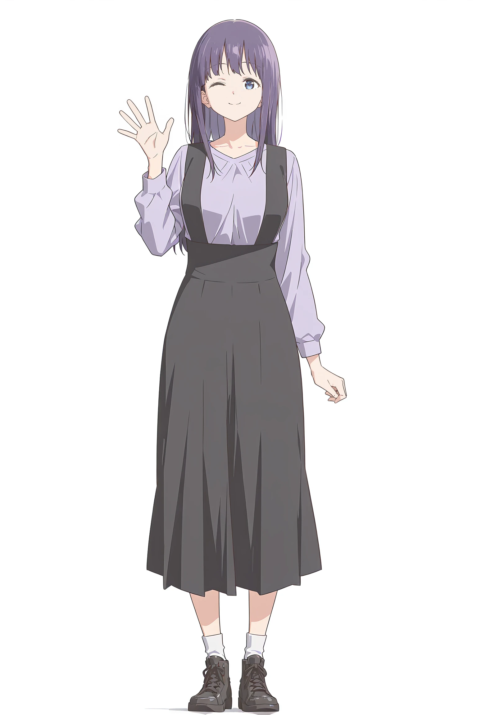 light purple shirt,collarbone,long skirt,suspender skirt,black skirt,long sleeves,white socks,shoes,---------------------->