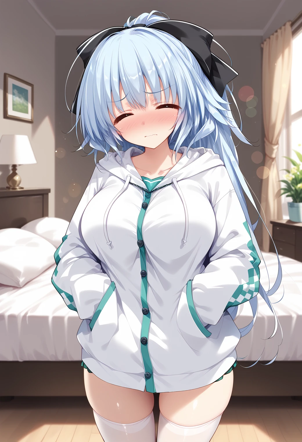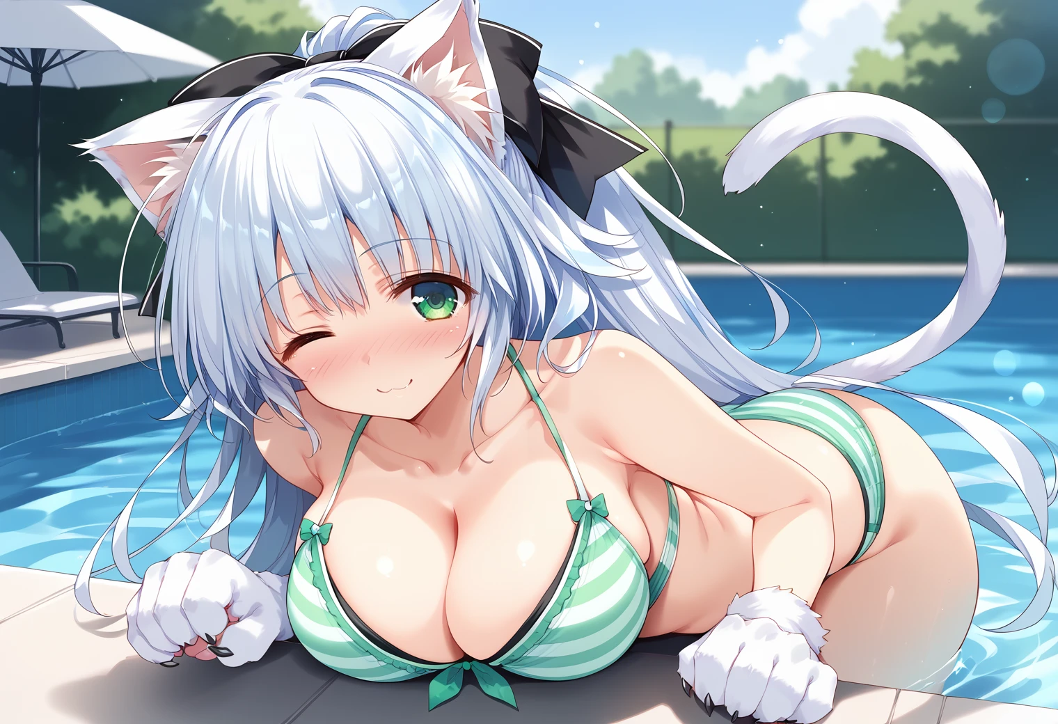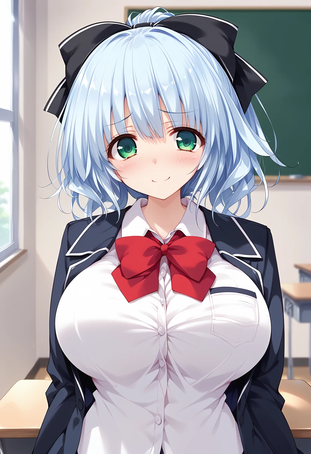 large breasts, green eyes, light blue hair,