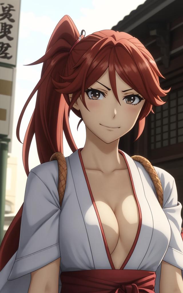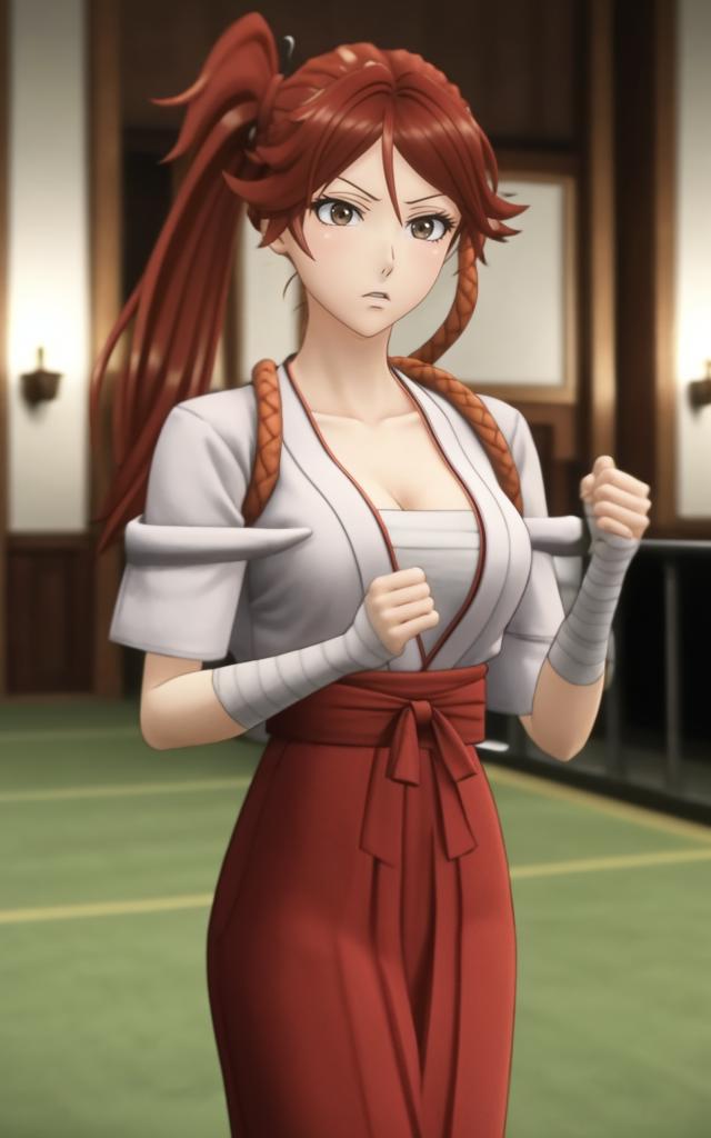 a woman, vermilion eyes, vermilion ponytail on the right side, bandages, shrine maiden's outfit, red hakama, sandals,