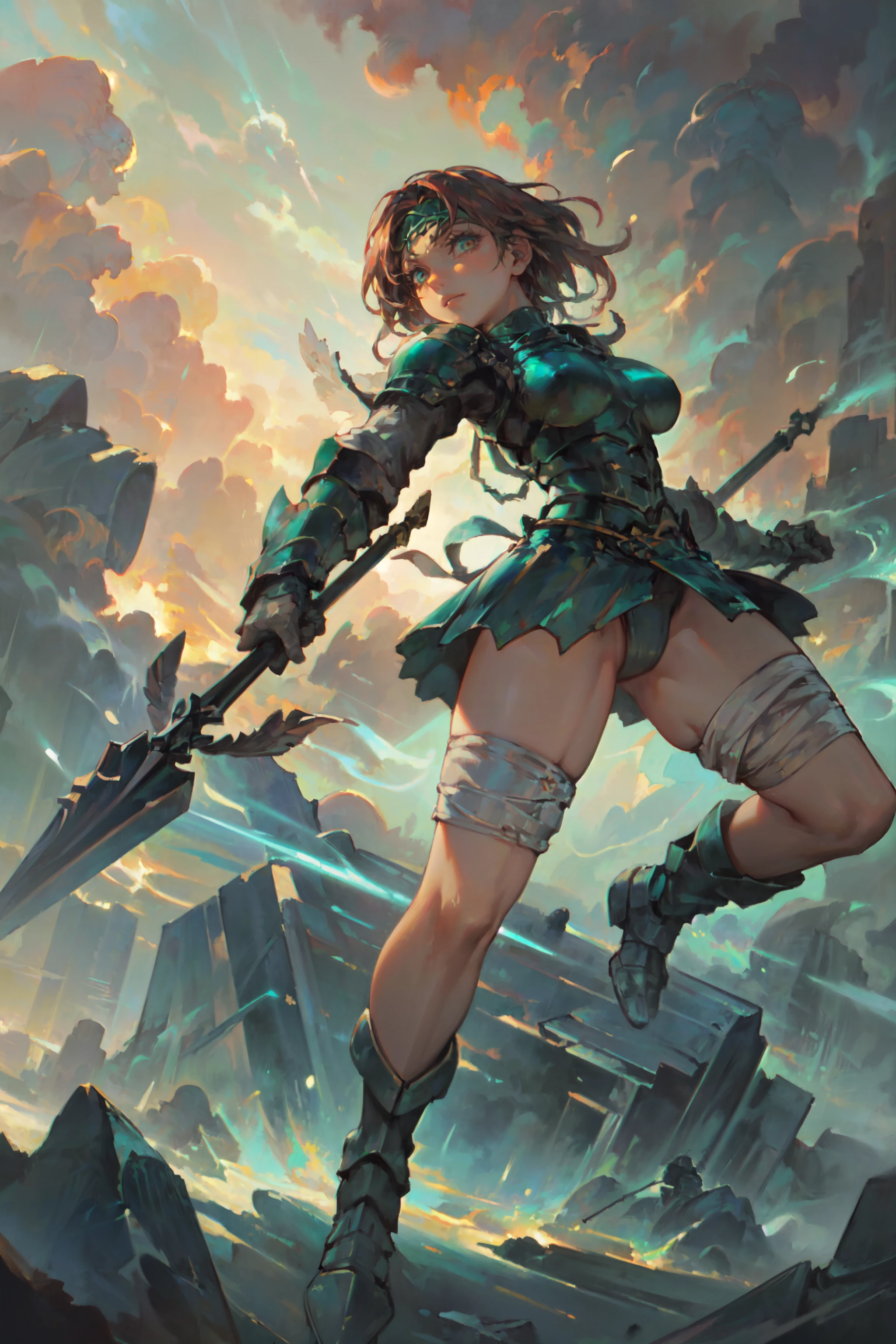 AeliaVP, circlet, armor, breastplate, shoulder armor, gauntlets, bandages, short skirt, panties, greaves, aura surrounding her, glowing eyes