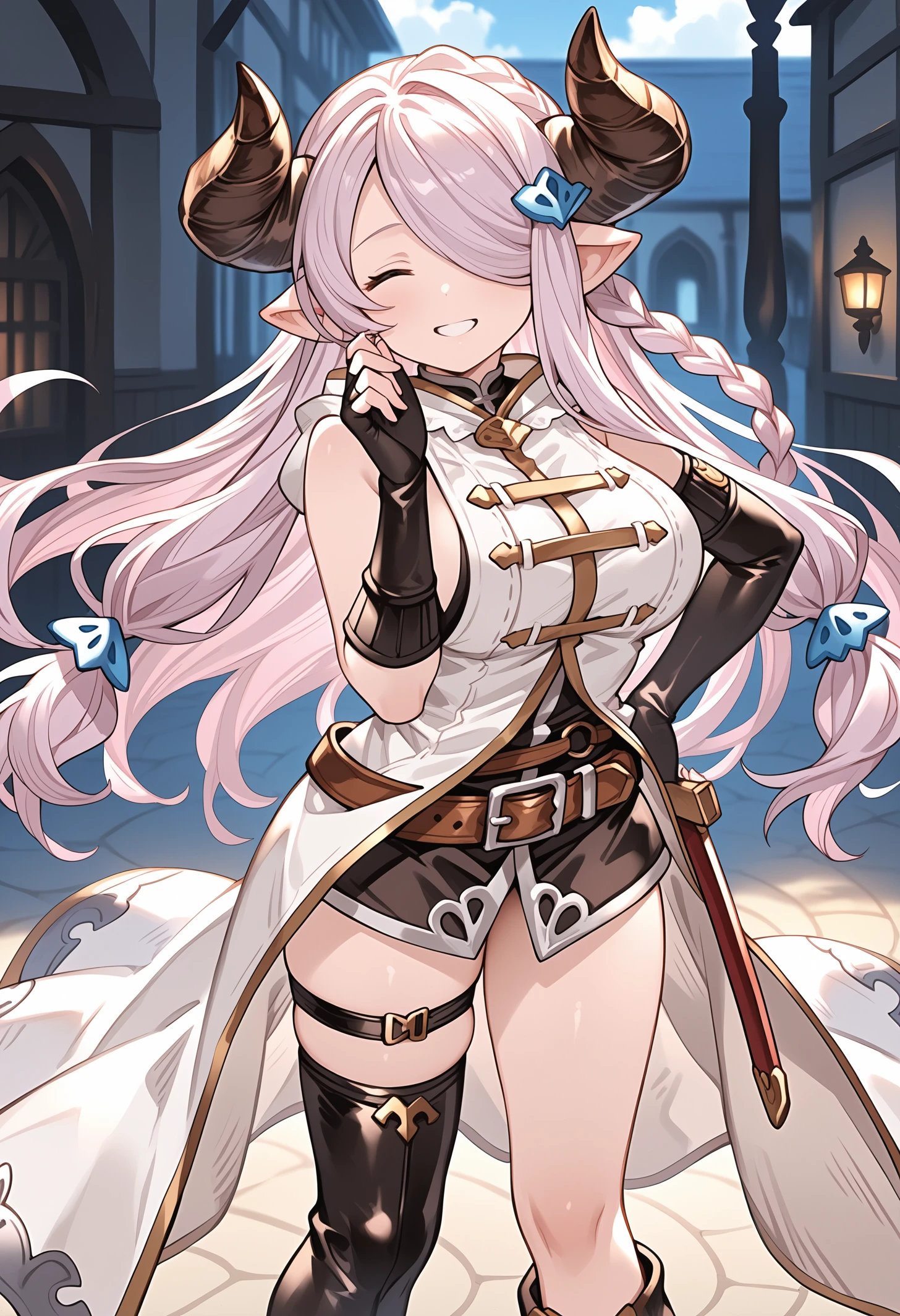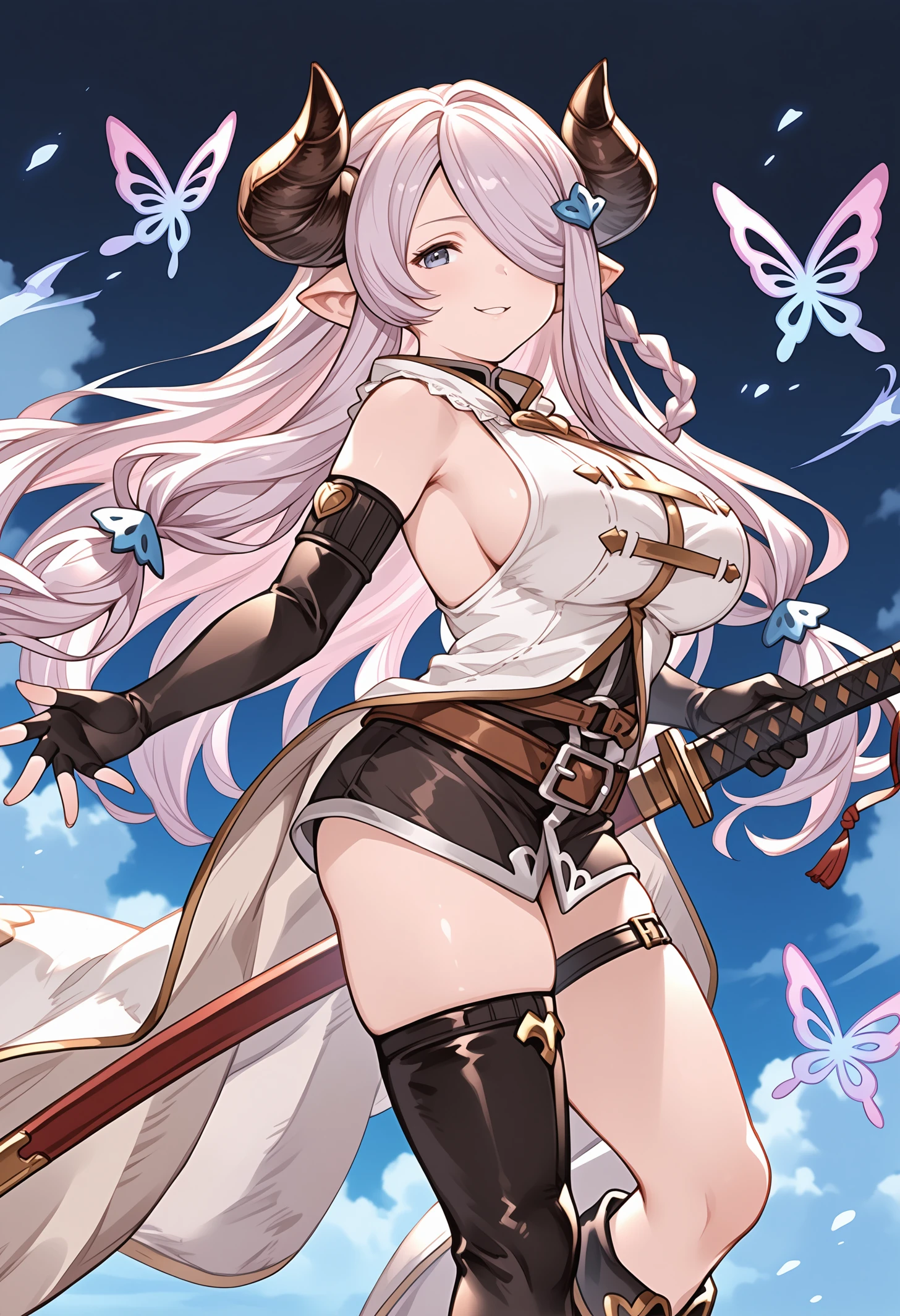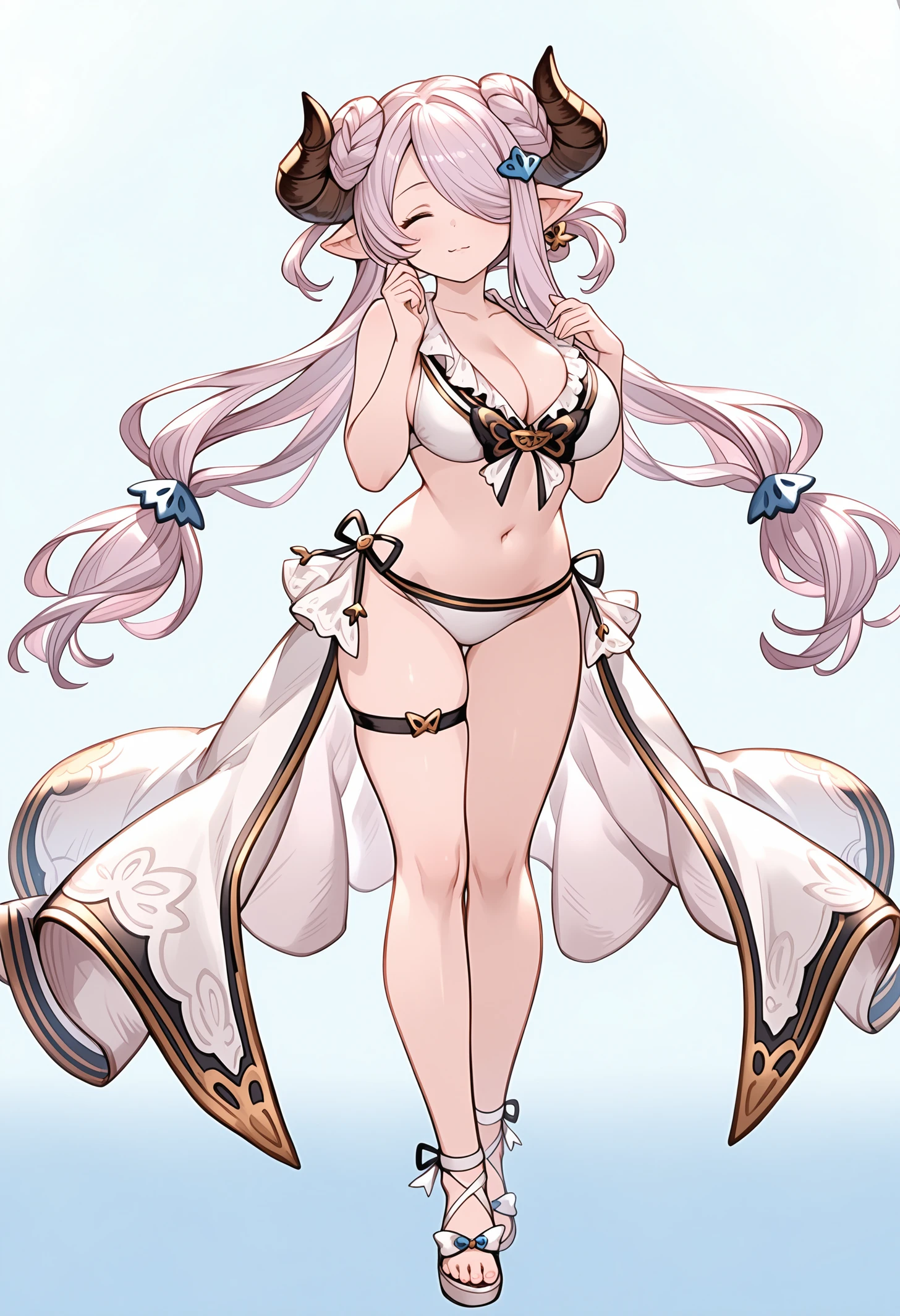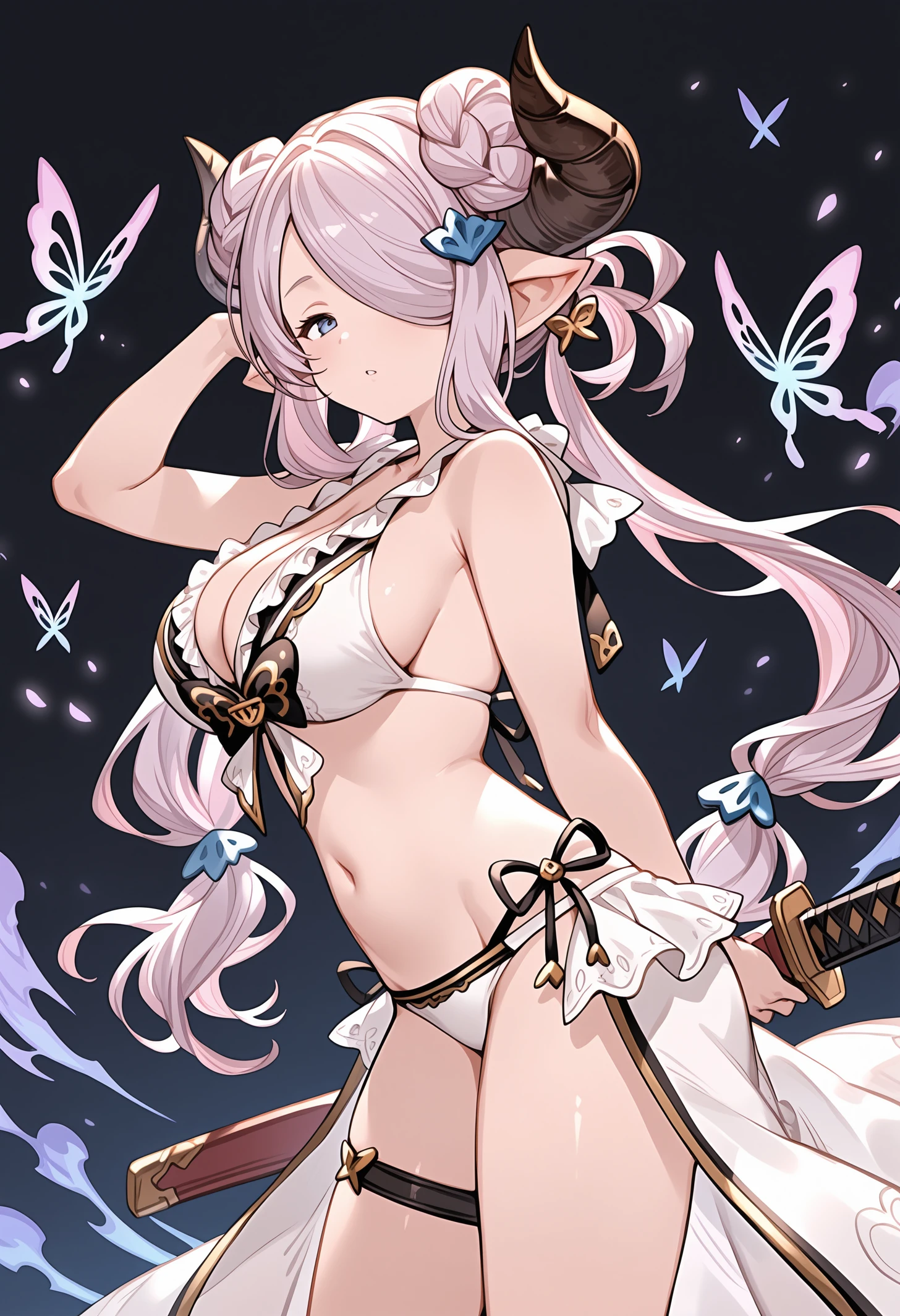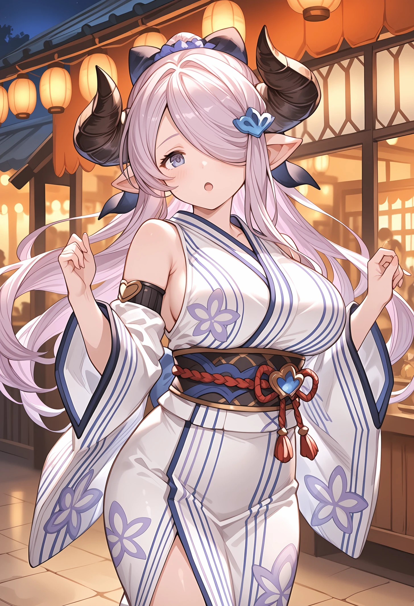 narmaya (granblue fantasy),granblue fantasy,official art,draph,horns,light purple hair,long hair,hair over one eye,single braid,pointy ears,blue eyes,hair ornament,large breasts