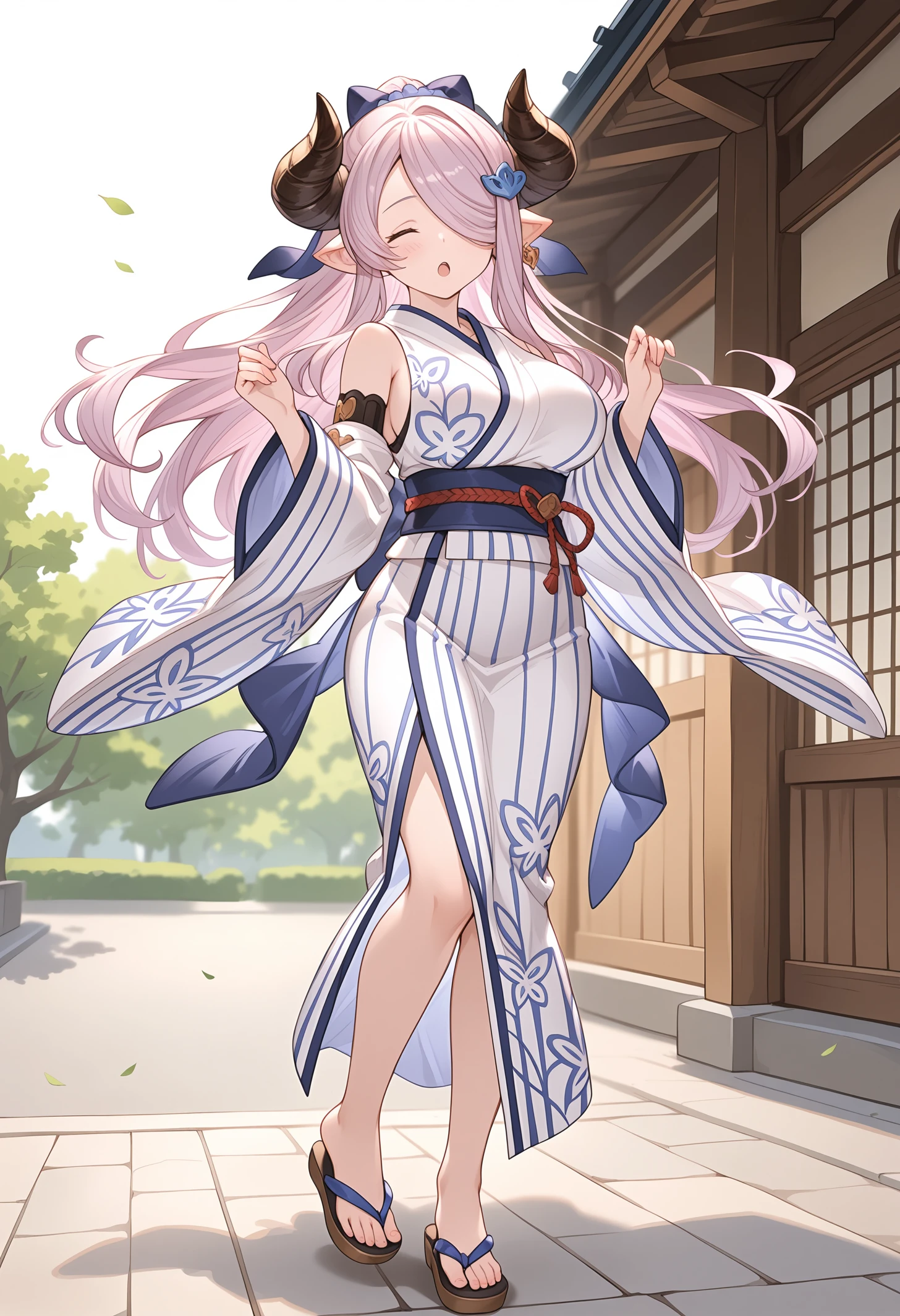 outfit yukata : naryukata,official alternate costume,japanese clothes,kimono,bare shoulders,detached sleeves,obi,wide sleeves,ponytail