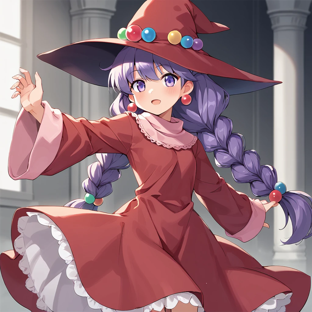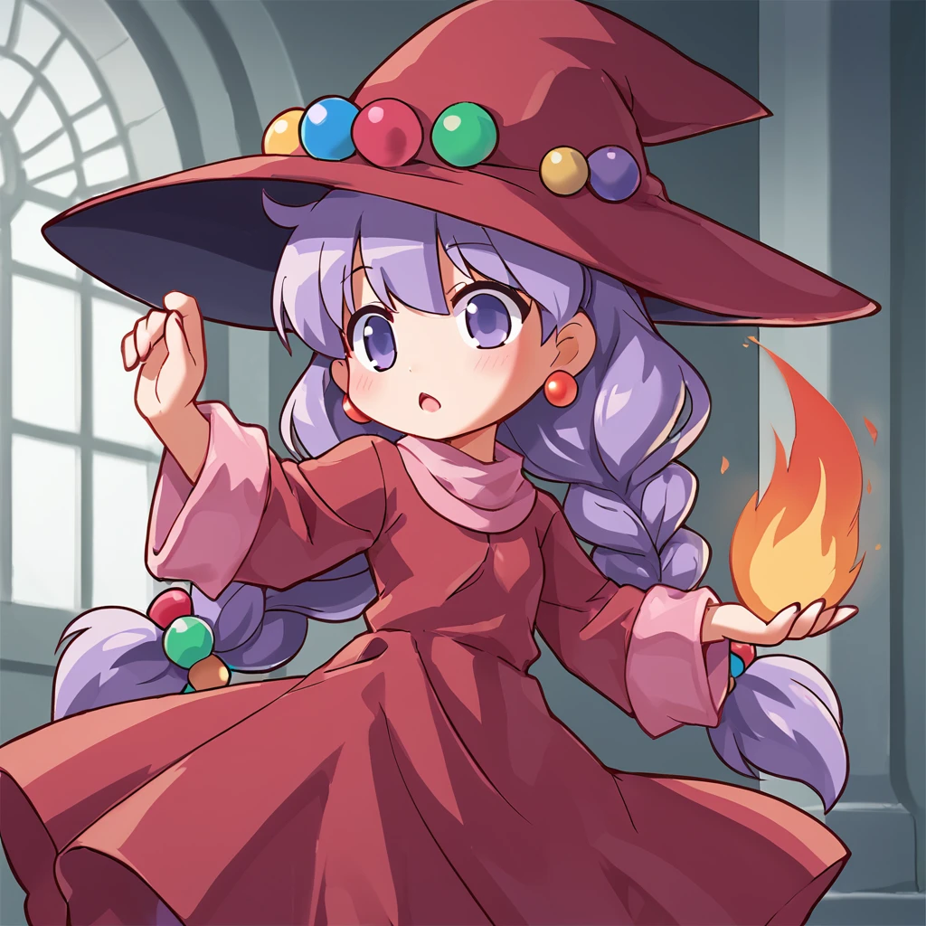 rufia, purple hair, long hair, twin braids, purple eyes, red witch hat, jewelry,