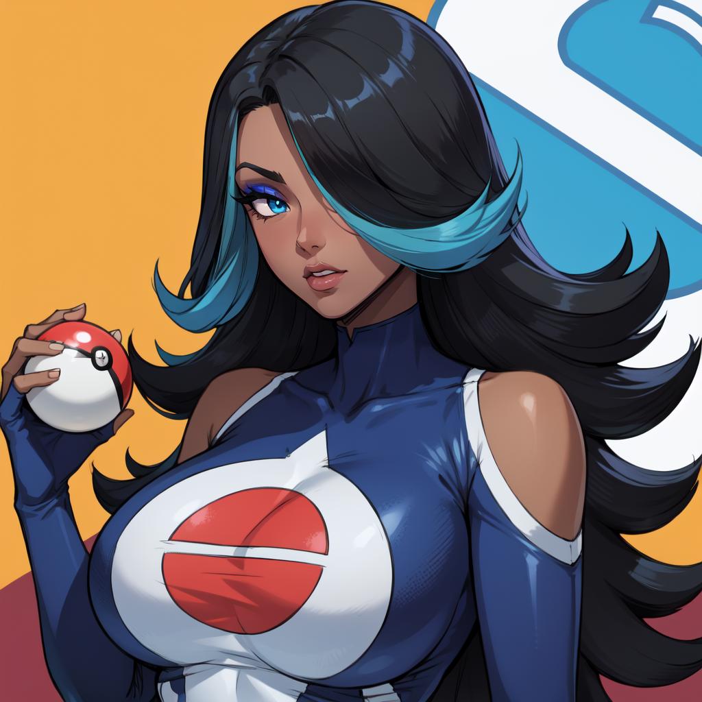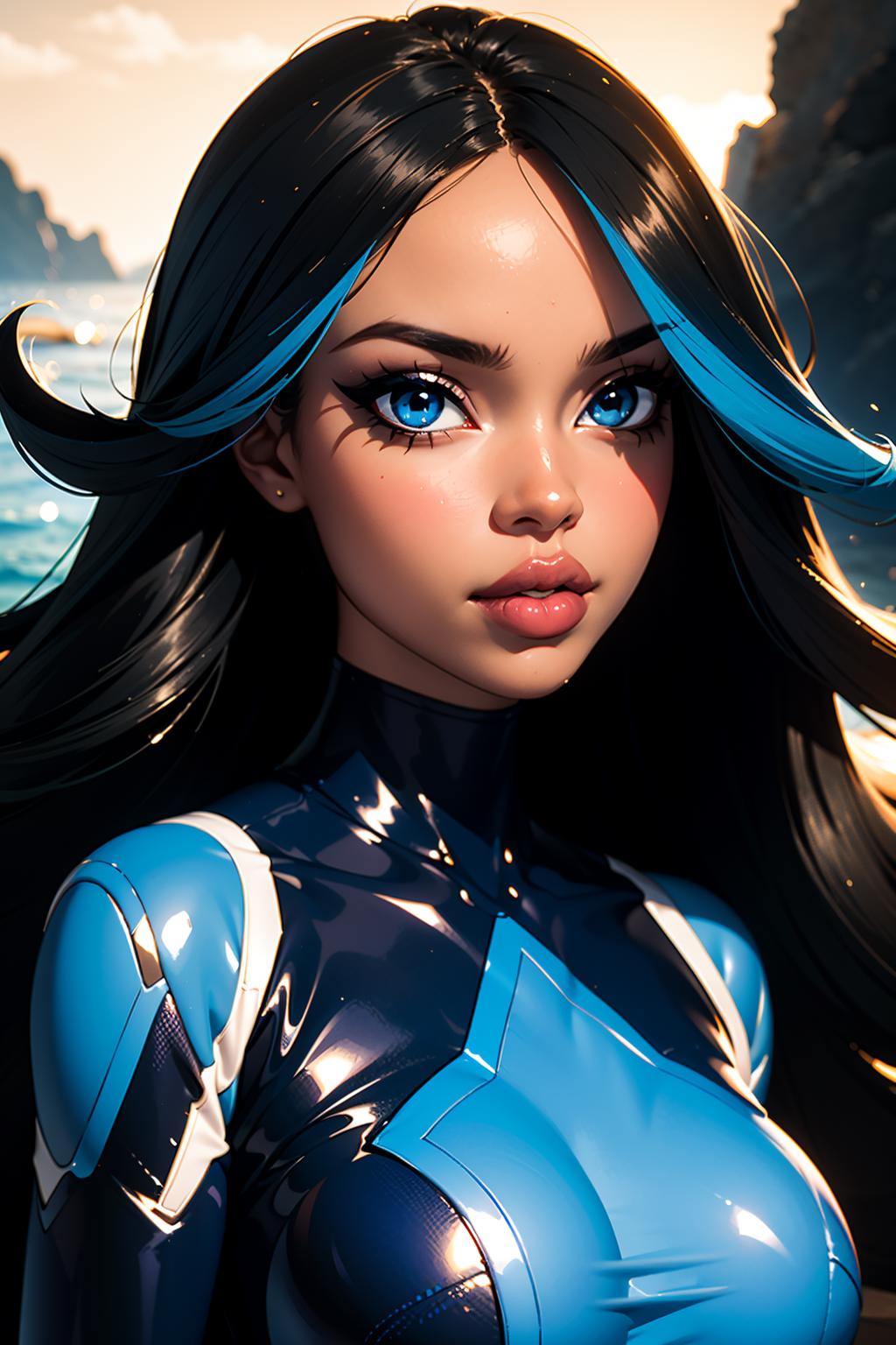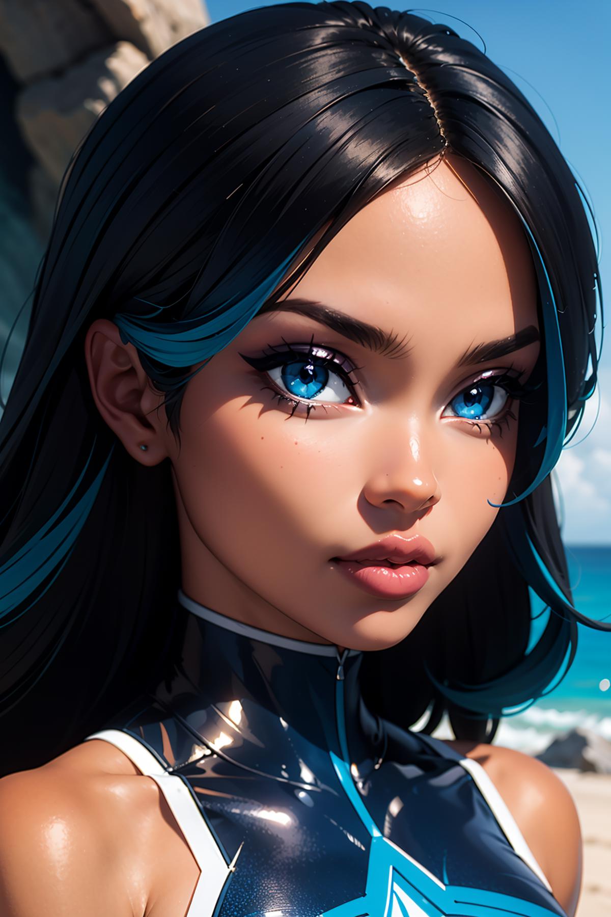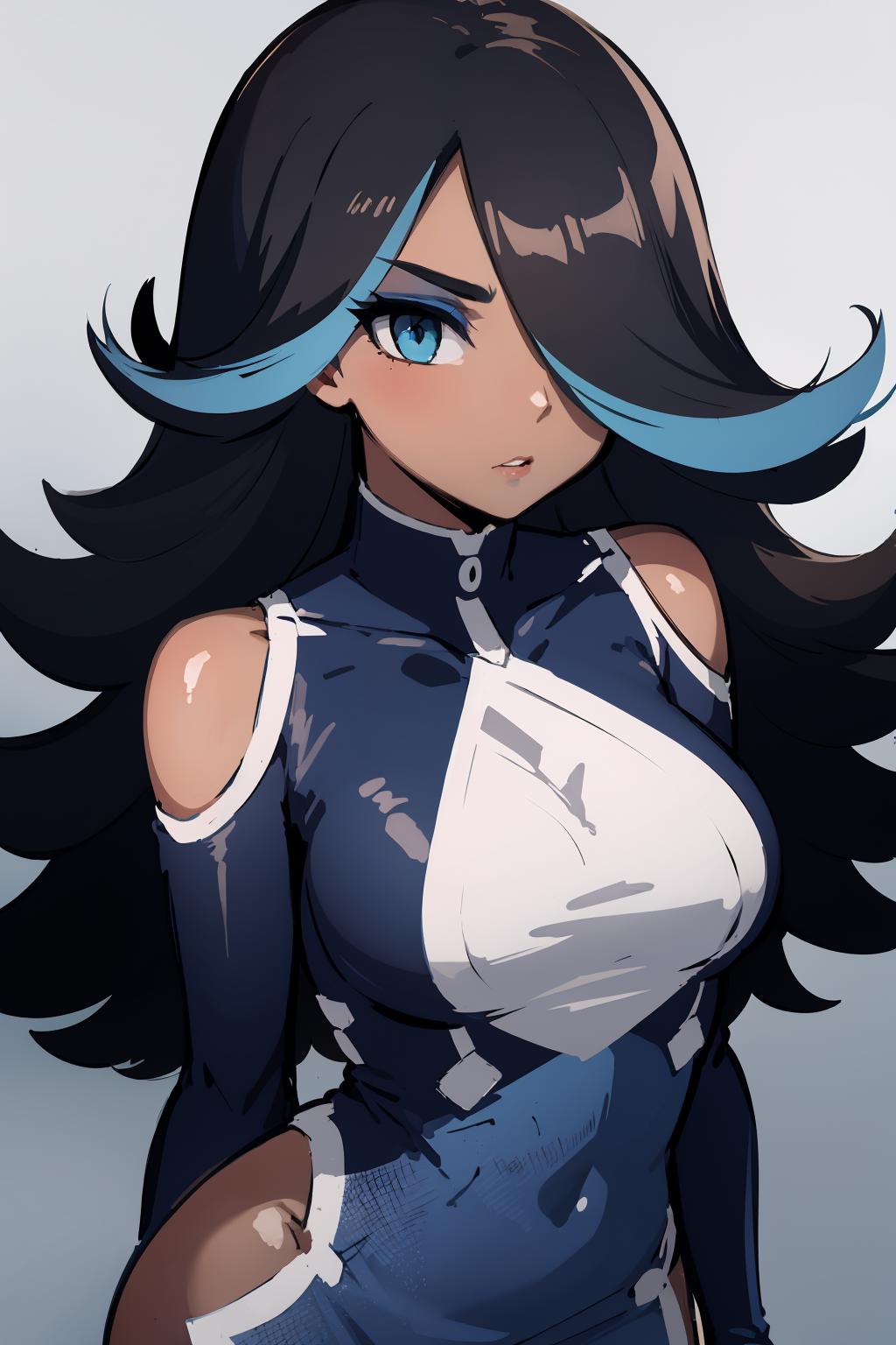 Optional Words: streaked hair,blue hair,black hair,blue eyes,hair over one eye,eyeshadow,dark-skinned female, ...