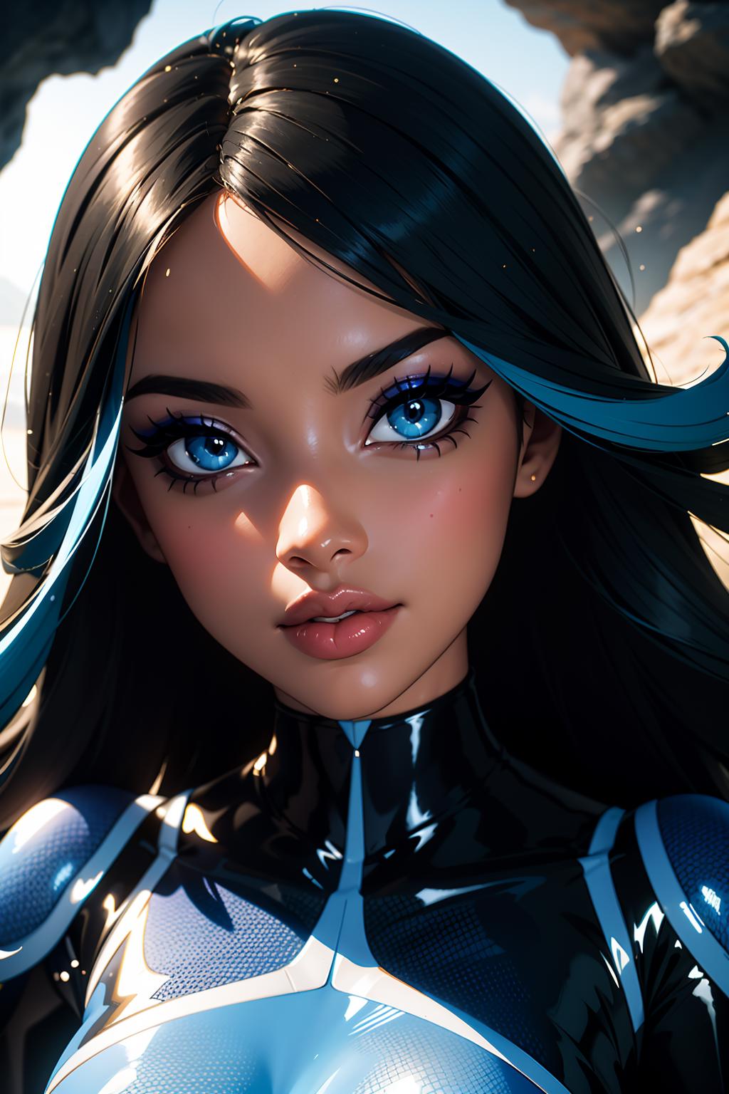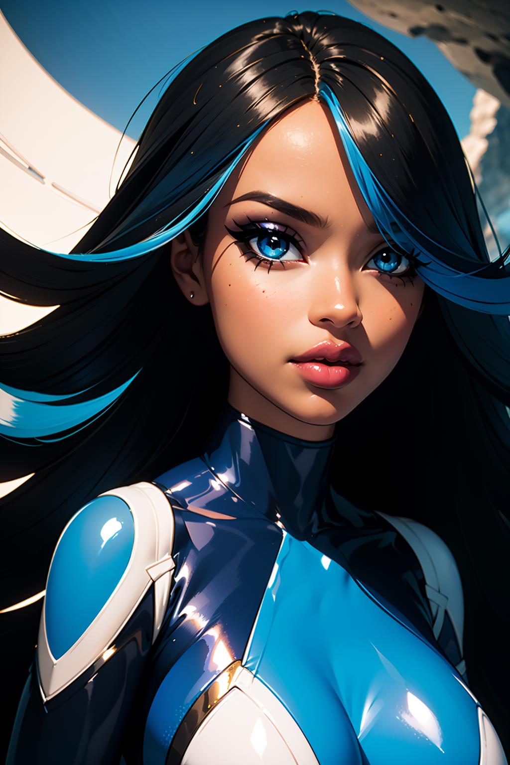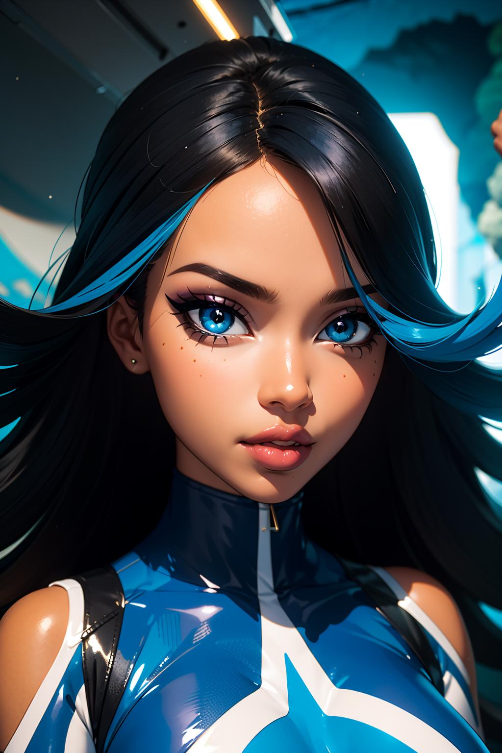 streaked hair,blue hair,black hair,blue eyes,hair over one eye,eyeshadow,dark-skinned female