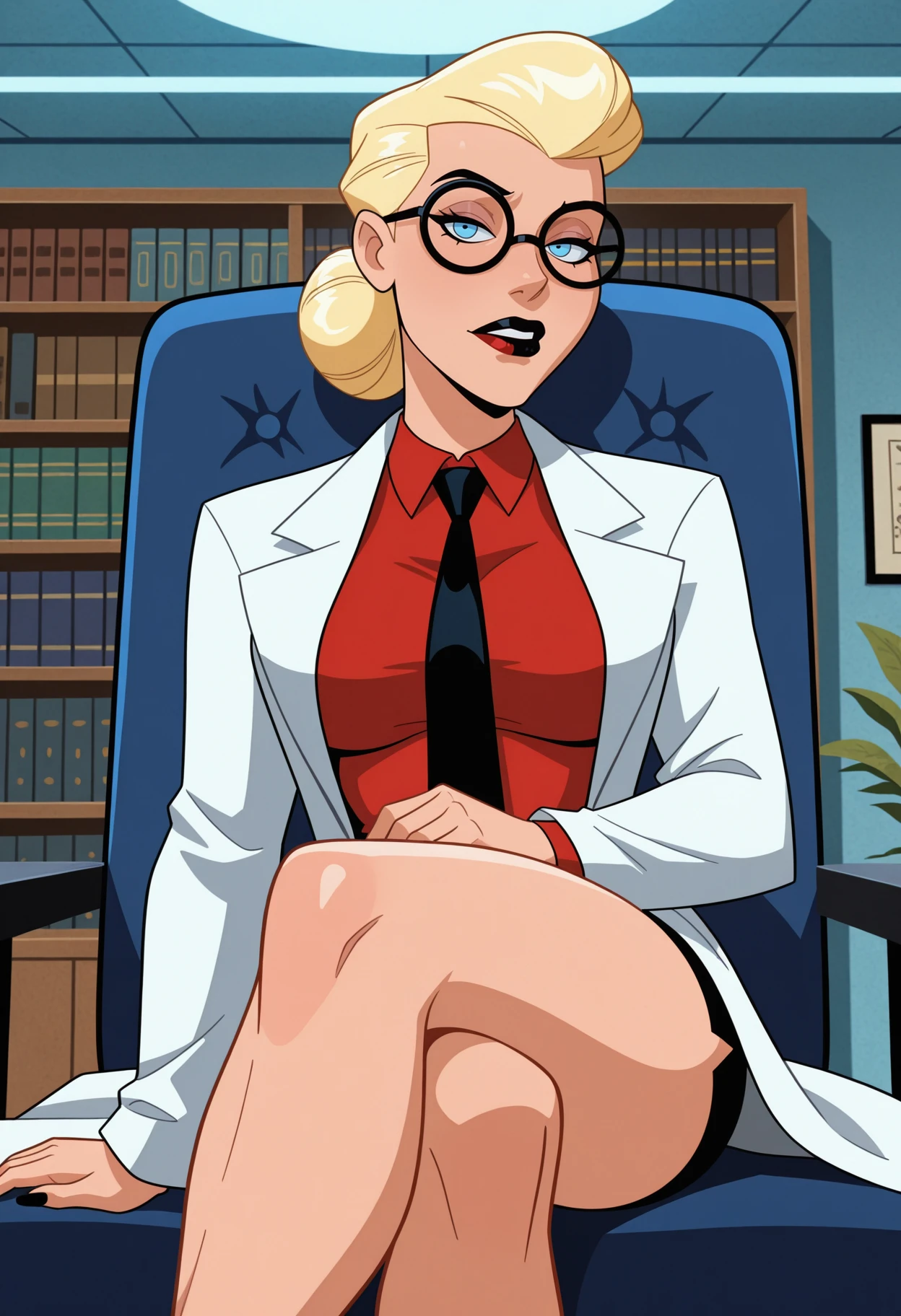NM_TNBA_dr_Harleen_Quinzel, 1girl, solo, blue eyes, blonde hair, short hair, hair bun, single hair bun, lipstick, red lips, black lips, glasses, black-framed eyewear, round eyewear, white coat, lab coat, jacket, shirt, collared shirt, red shirt, necktie, black necktie, skirt, black skirt, miniskirt, pencil skirt,