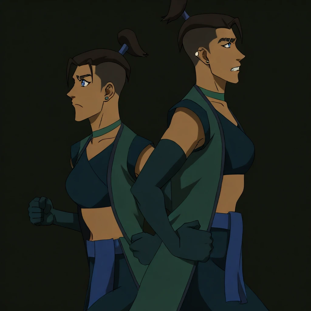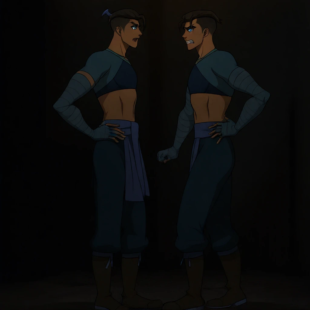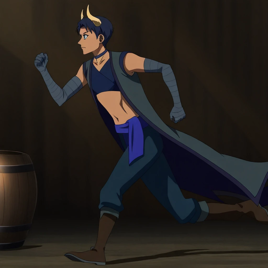 beauregard,blue eyes undercut hair ,bandaged_arms,sports_bra,earrings,sleeveless_jacket,short hair,topknot,pants,scarf_belt ,midriff,single bang