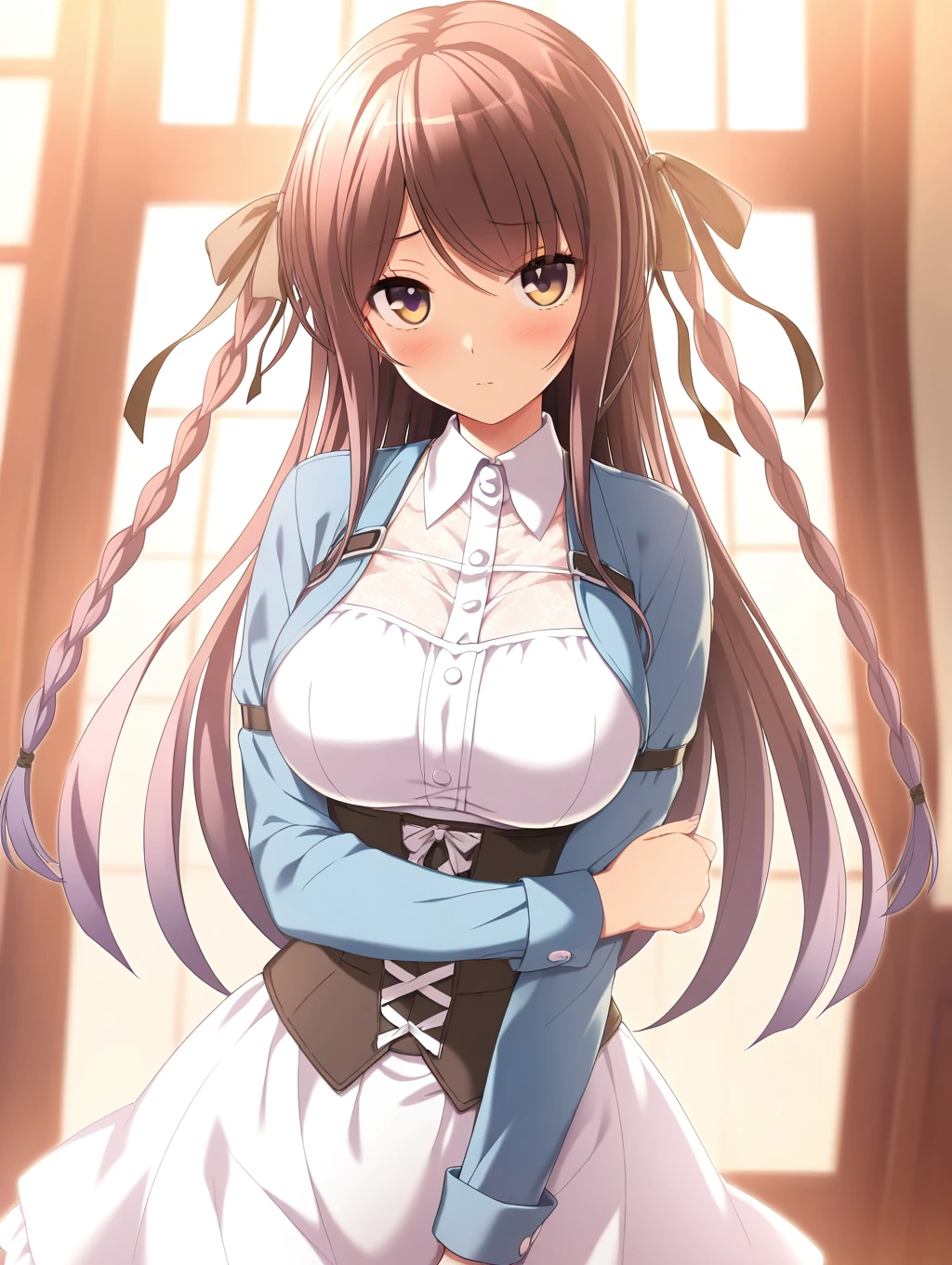 fuuka,1girl,solo,long hair,brown hair,brown eyes,,blue jacket,white dress,white skirt,looking at viewer,standing,cropped jacket,hair ribbon,black ribbon,twin braids,