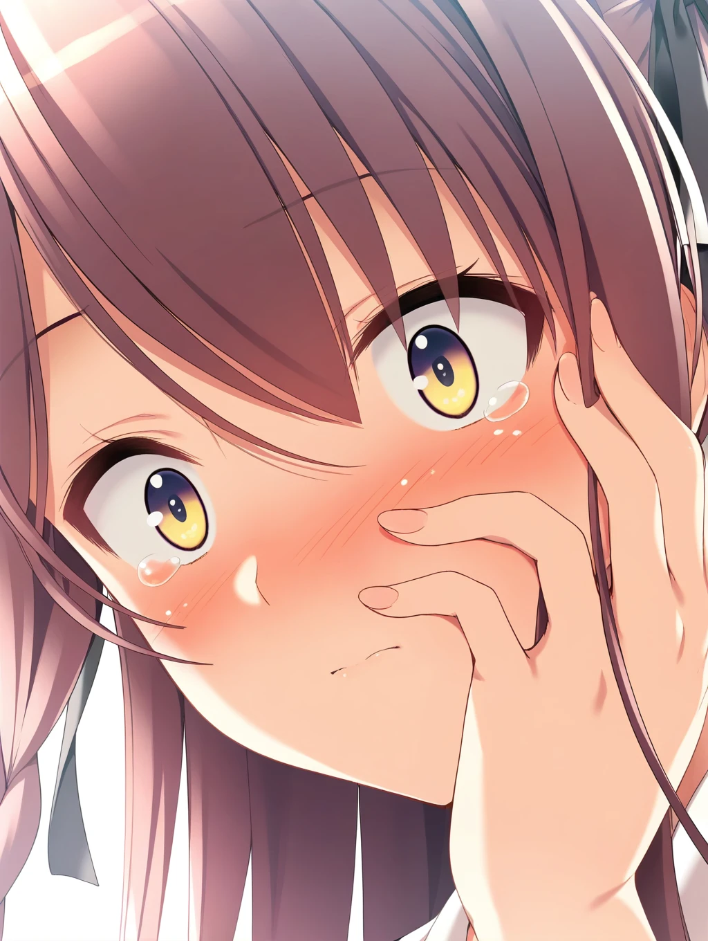 fuuka,1girl,solo,long hair,hair between eyes,blush,brown hair,black ribbon,hair ribbon,yellow dress, shoulders,black skirt,sitting,looking at viewer,,