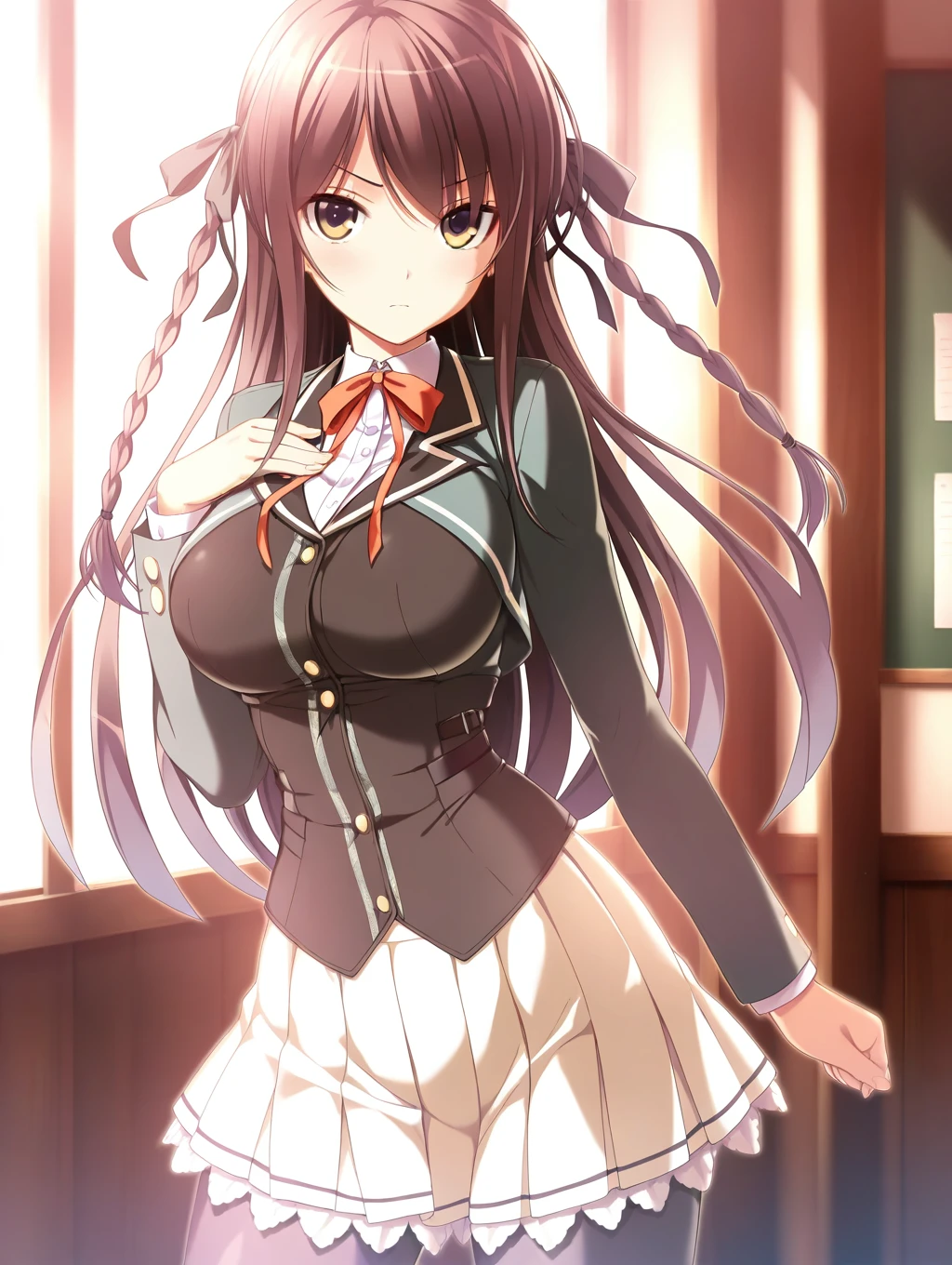 fuuka,1girl,solo,long hair,school uniform,hair ribbon,skirt,twin braids,looking at viewer,brown hair,black pantyhose,pleated skirt,brown eyes,,long sleeves