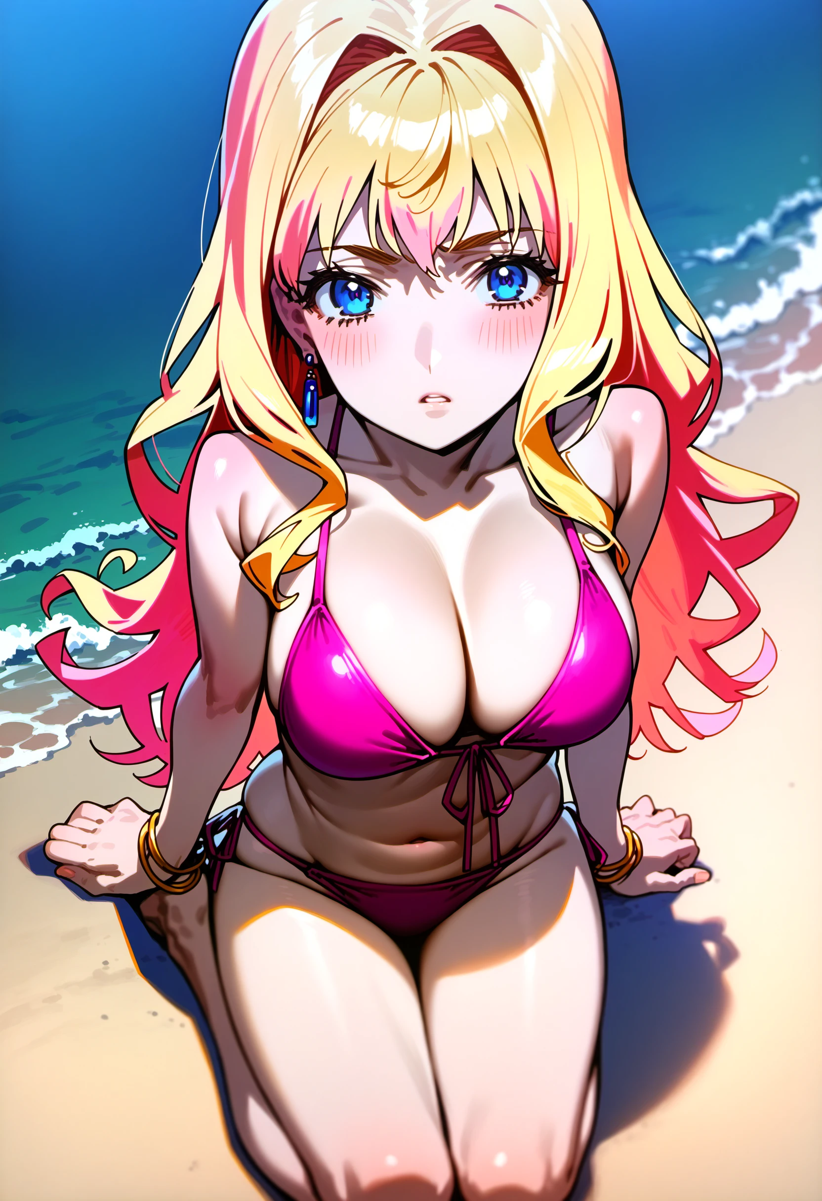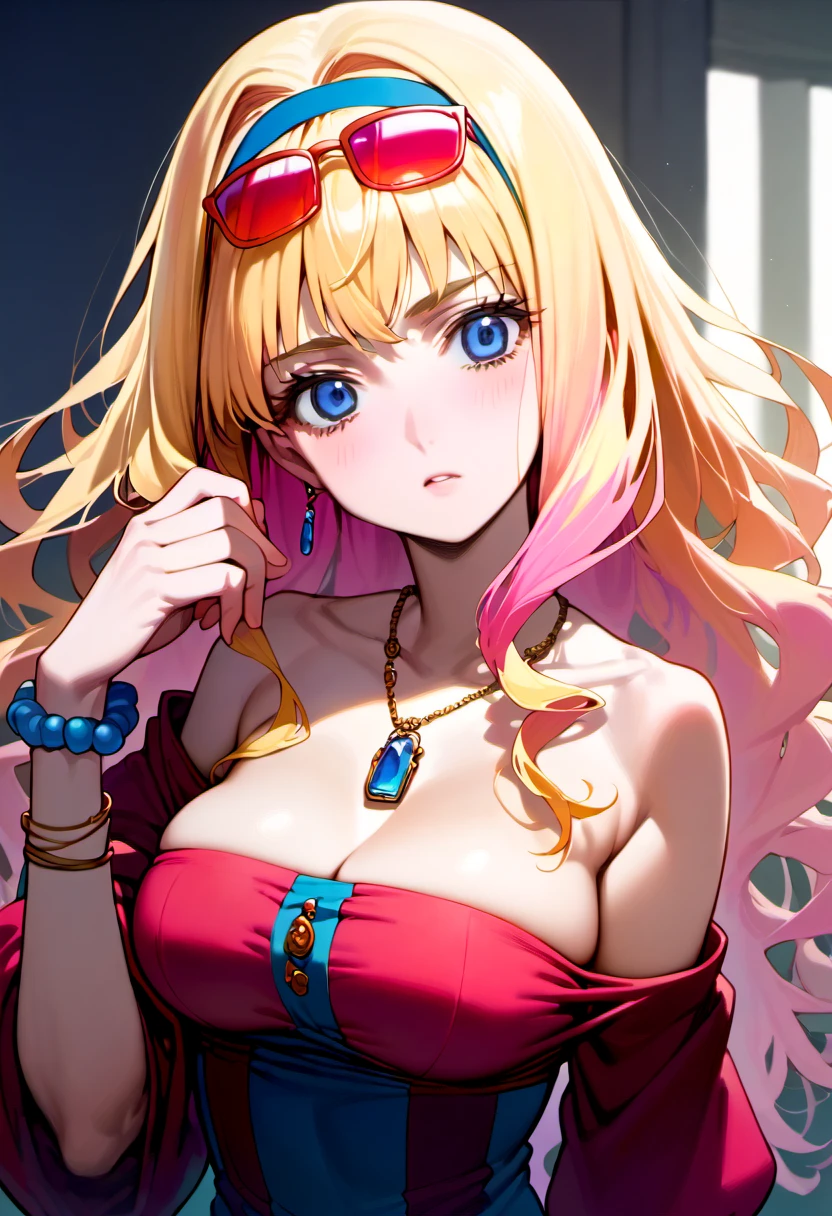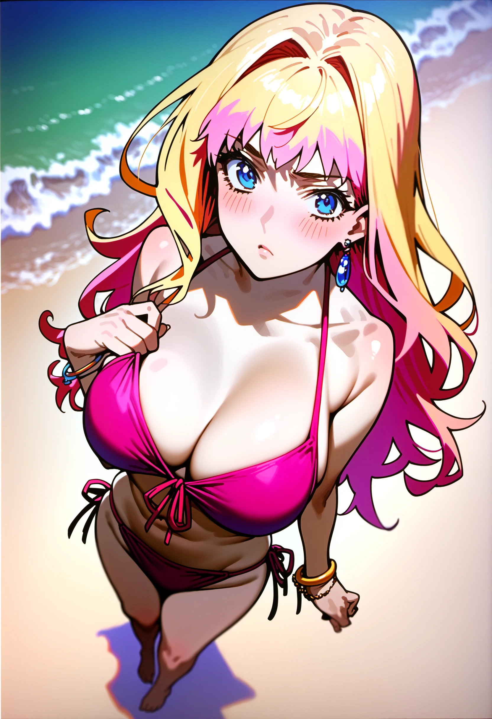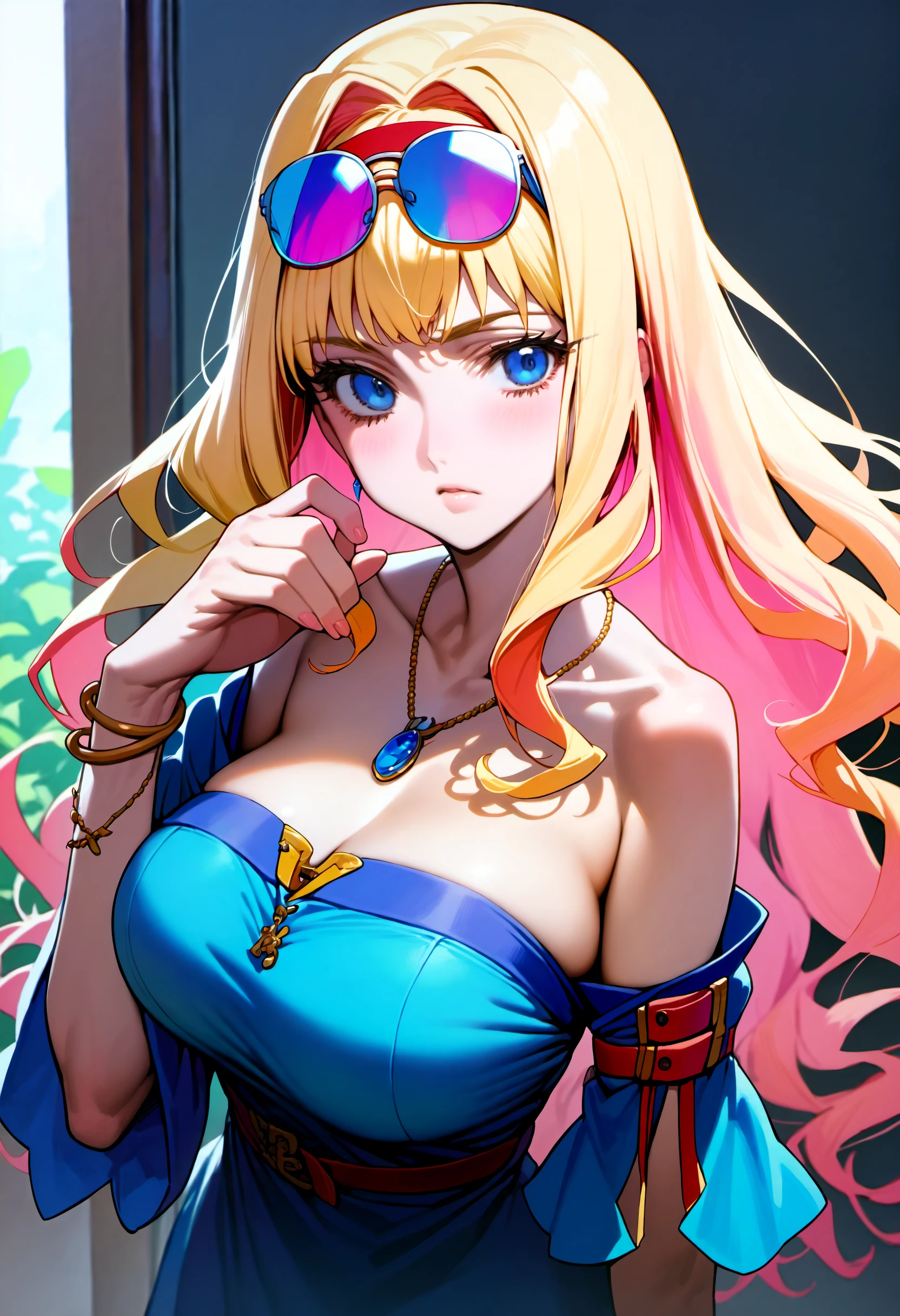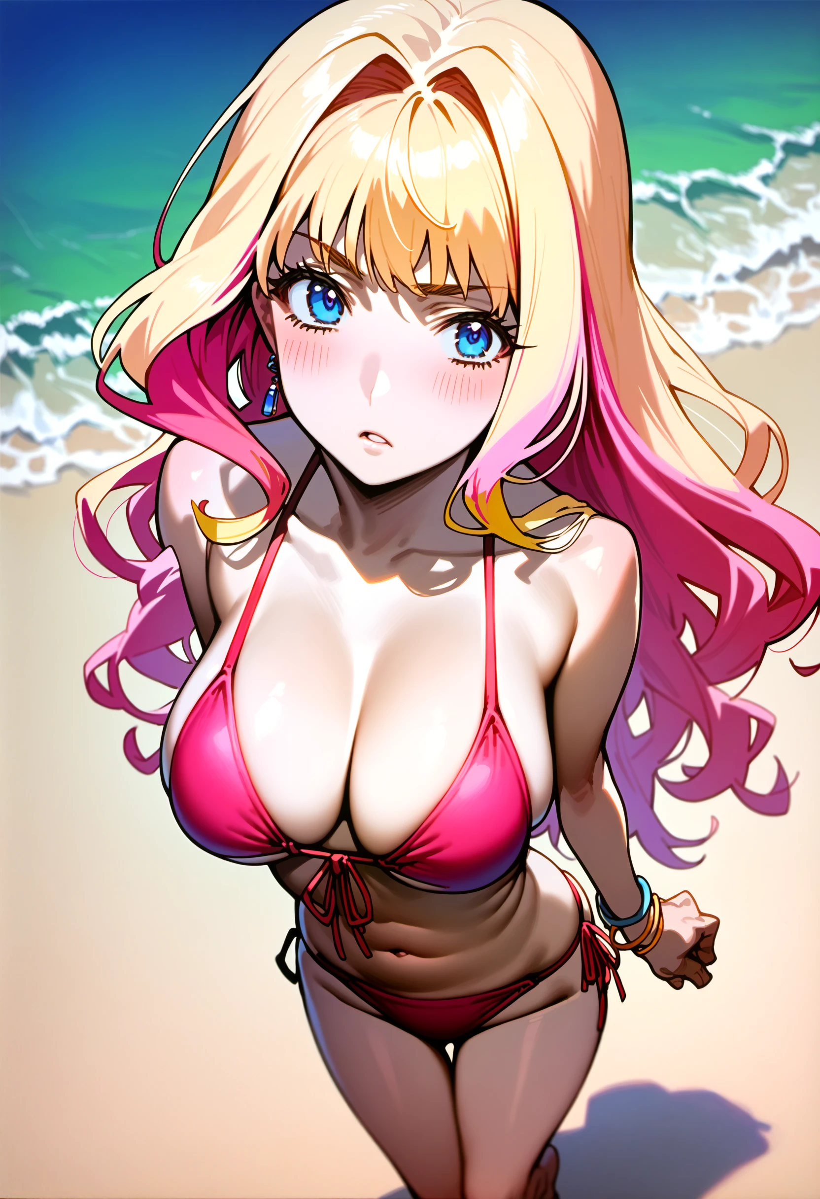 Recommended Prompts for correct attire : blonde,pink hair,blue eyes,two-tone hair,large breasts,