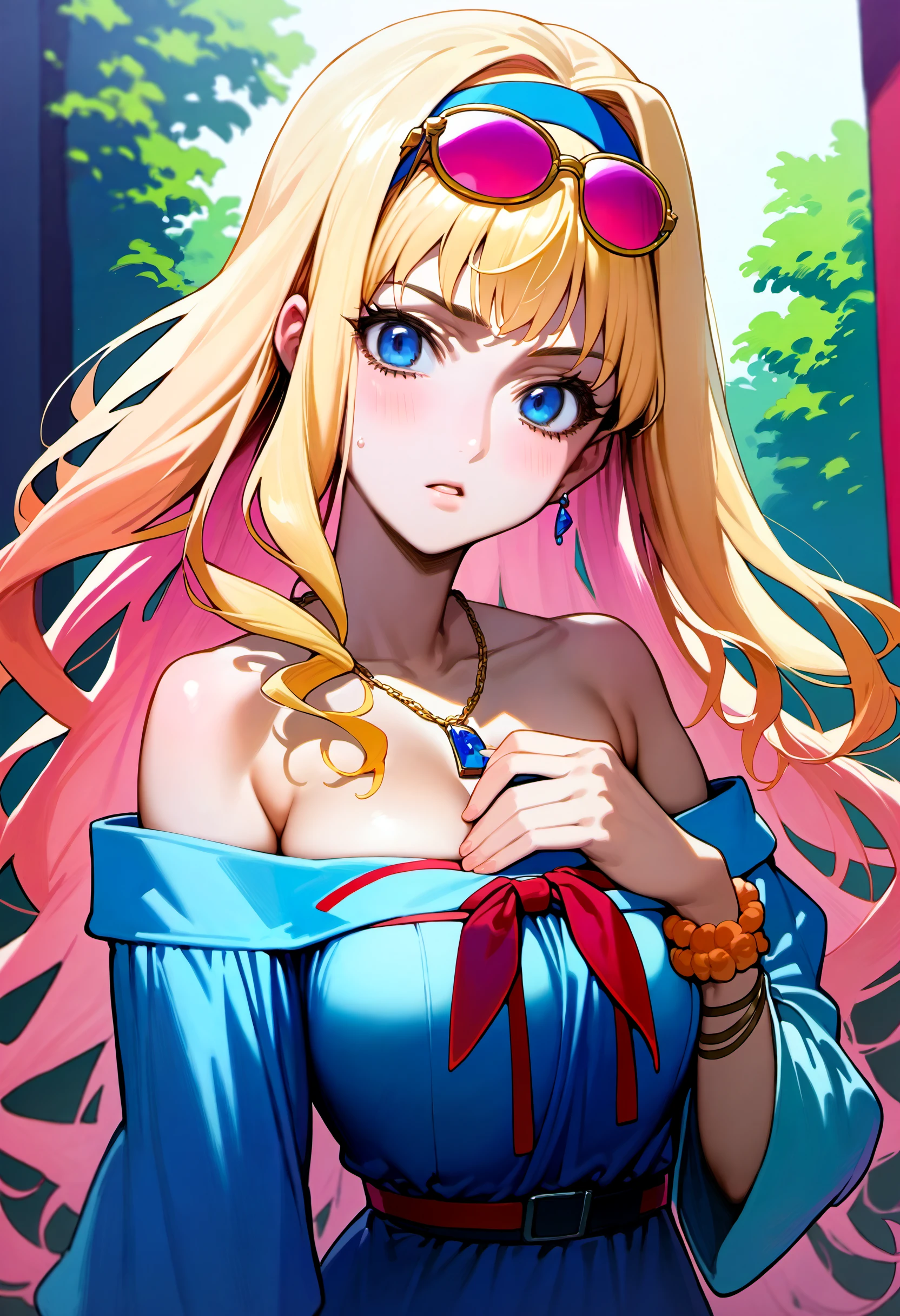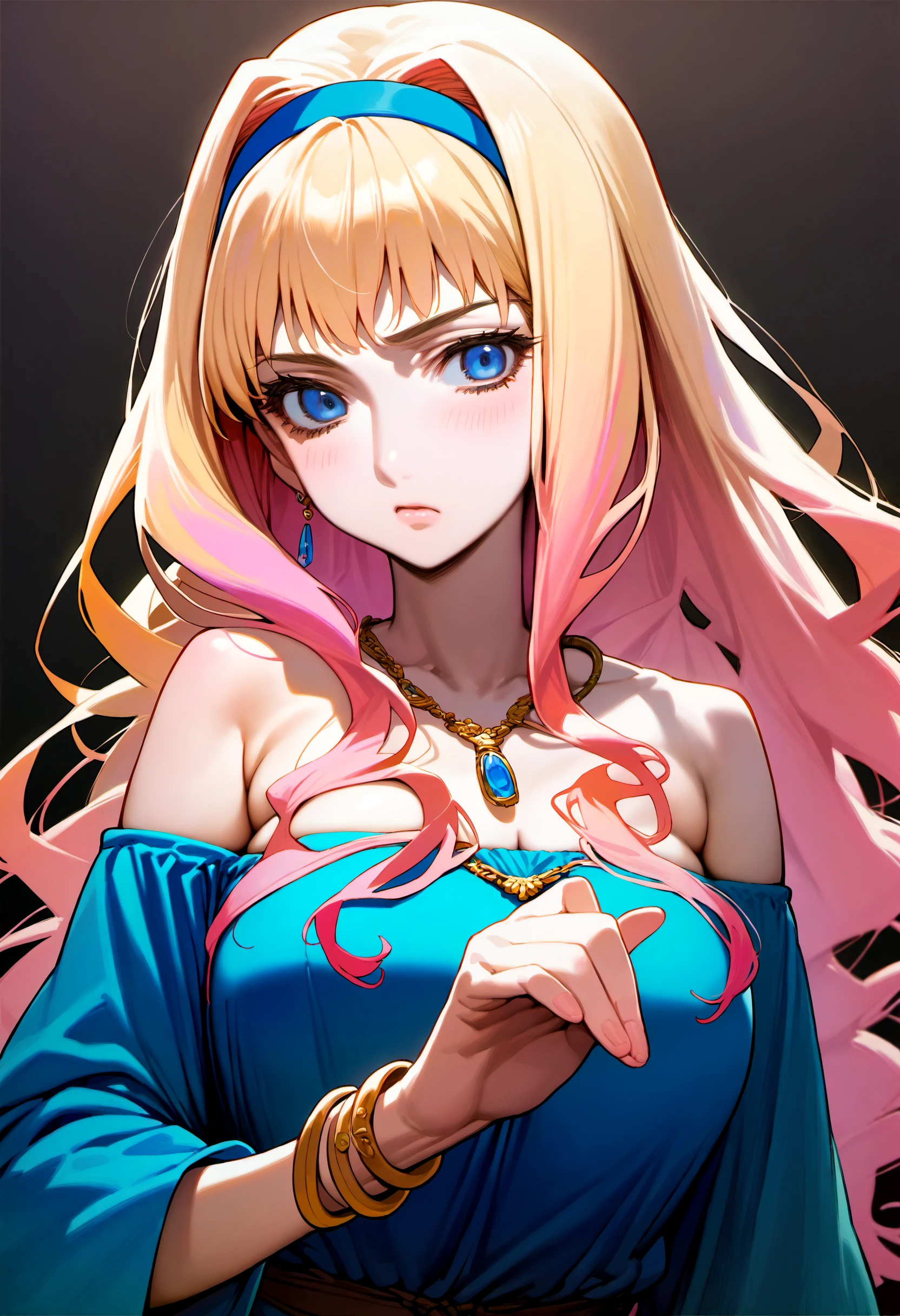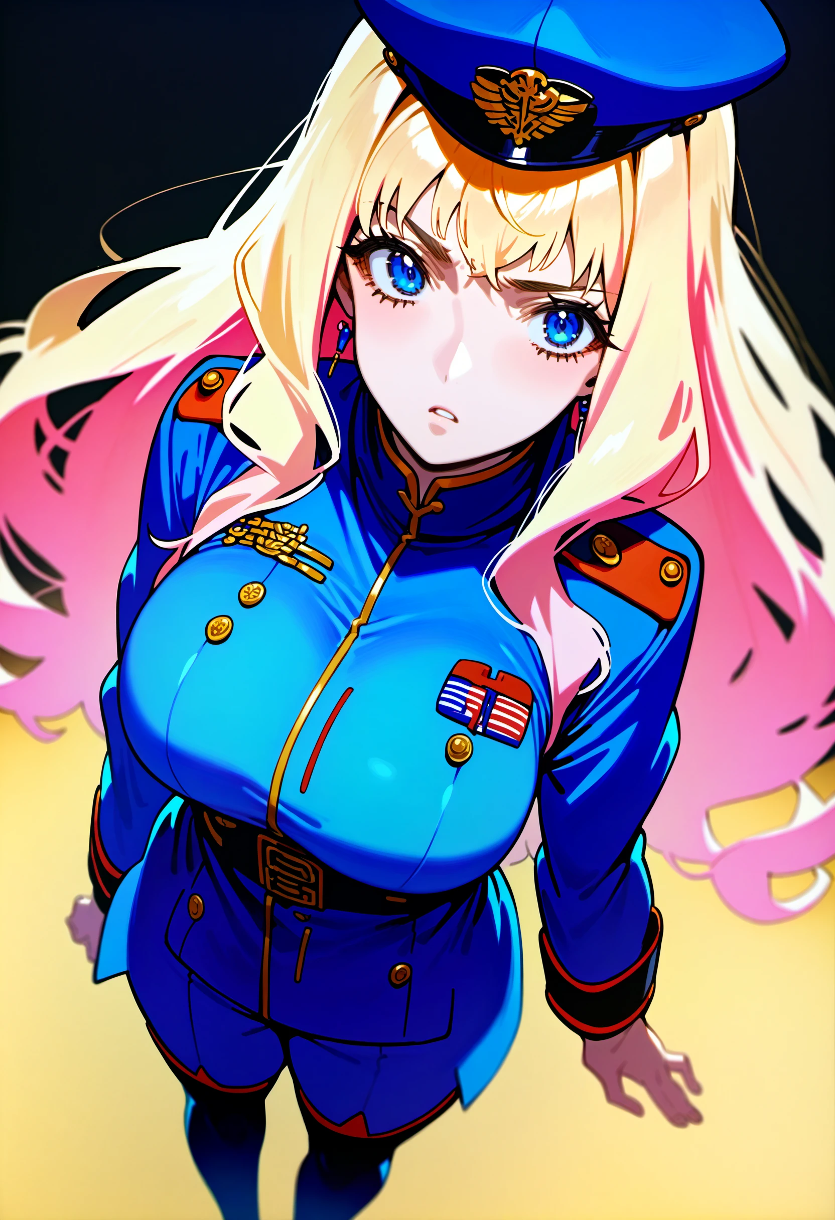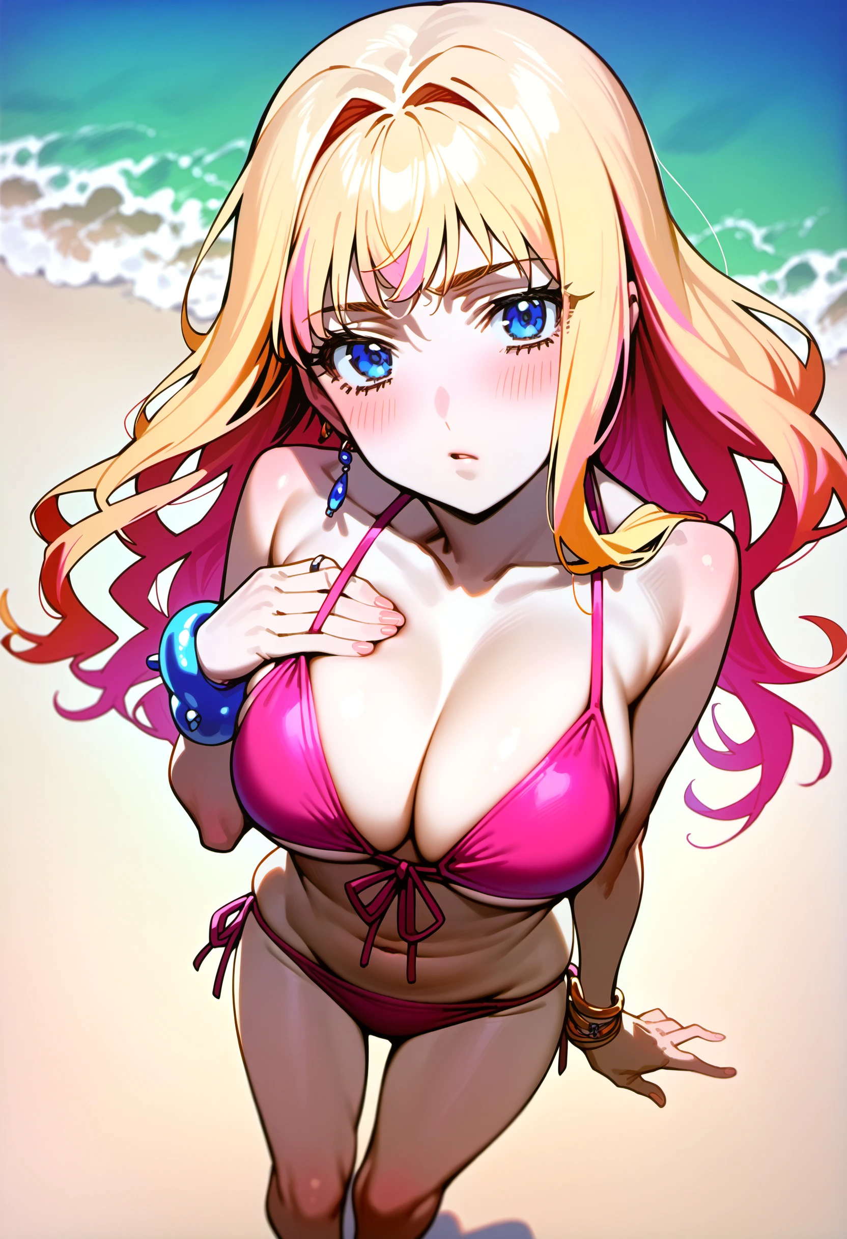 Recommended Prompts for correct attire : blonde,pink hair,blue eyes,two-tone hair,large breasts,