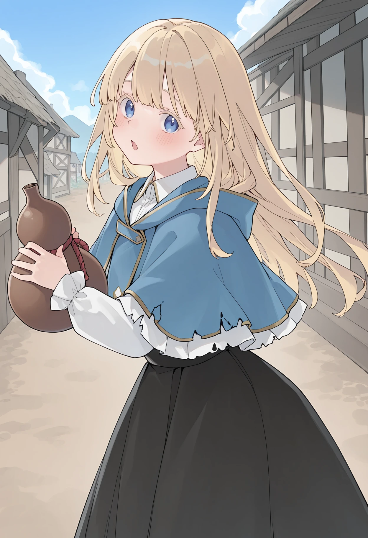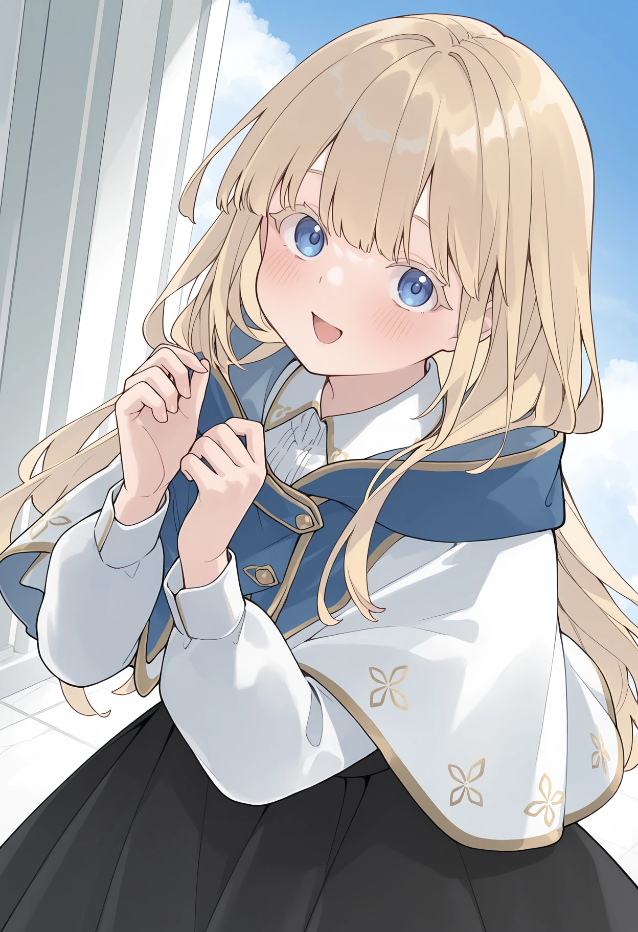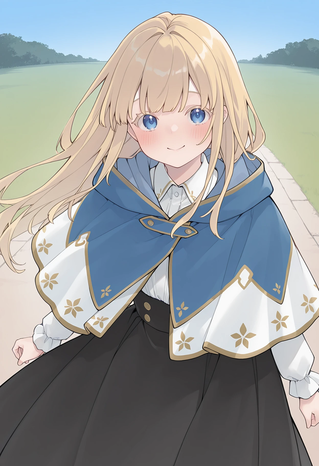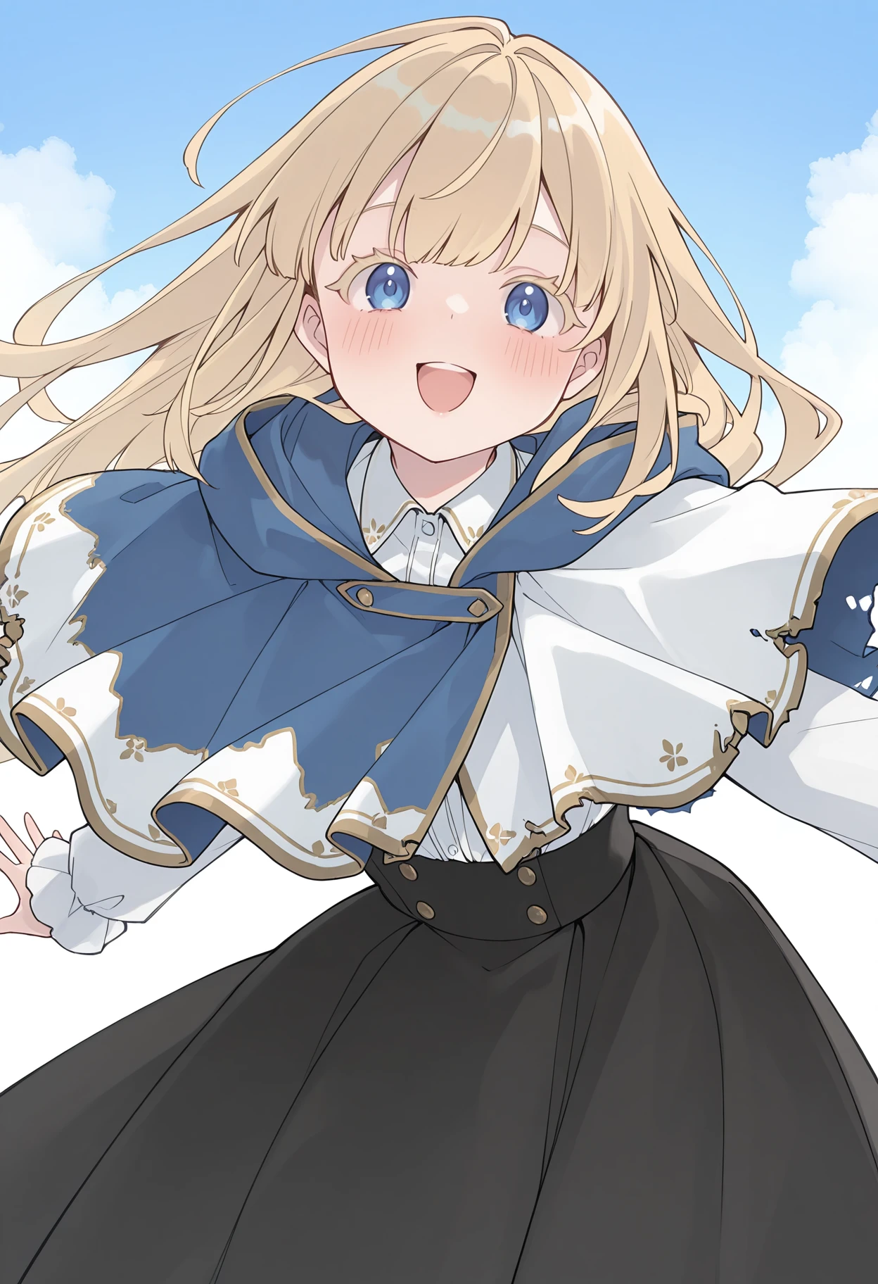 multicolored capelet, hooded capelet, two-tone capelet, blue capelet, white capelet, gold trim, white shirt, long sleeves, collared shirt, black skirt, long skirt,