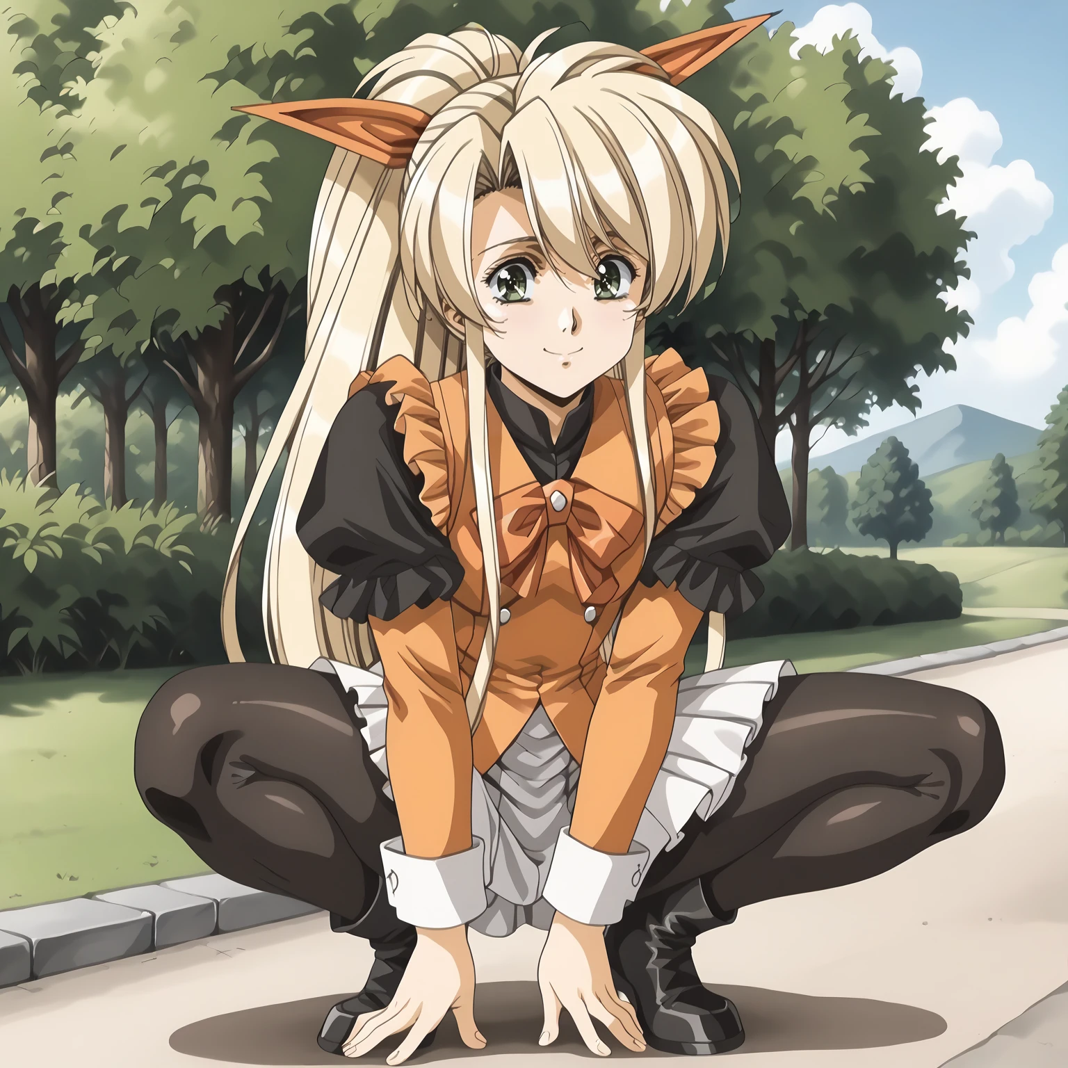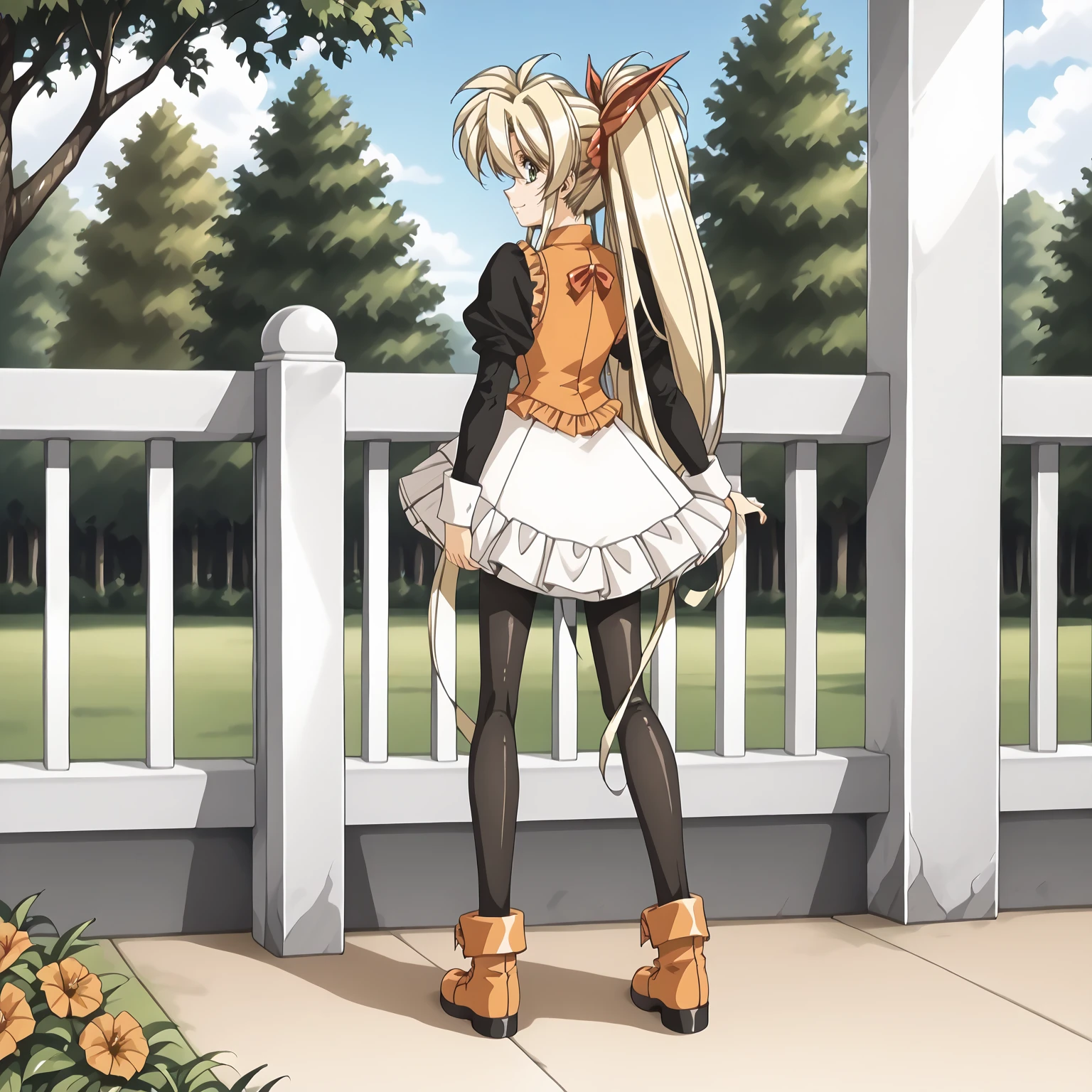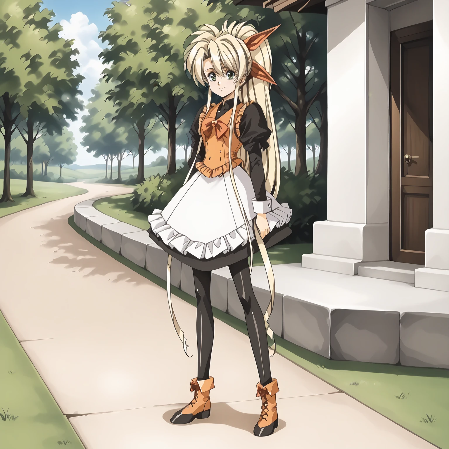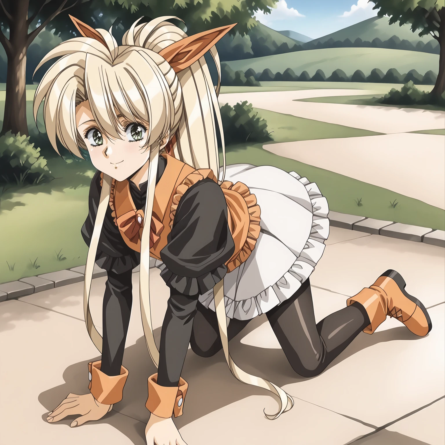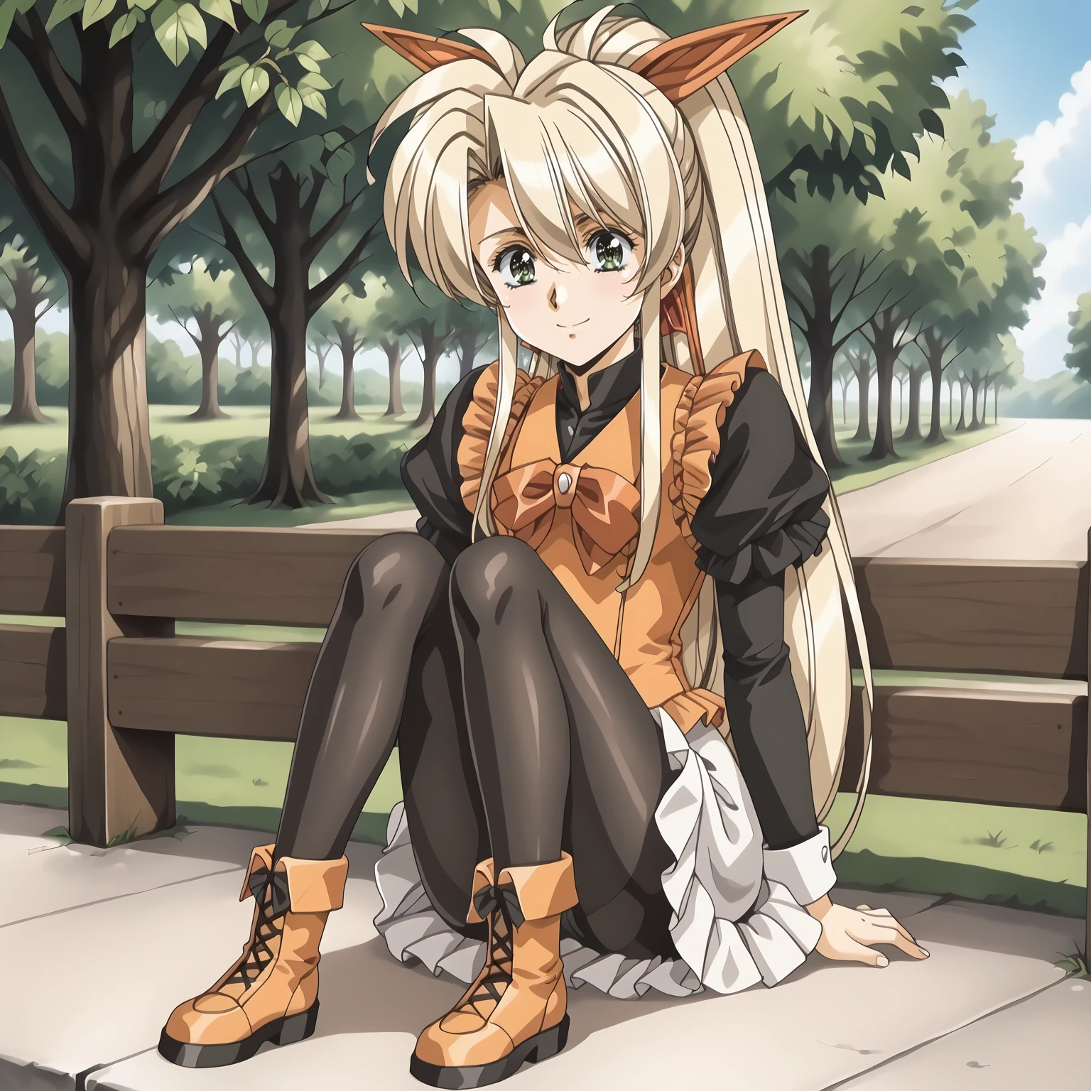 Faye,1girl,blonde hair,very long hair,high ponytail,very long sidelocks,hair bow,green eyes,
