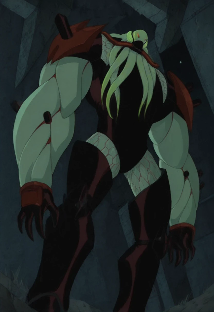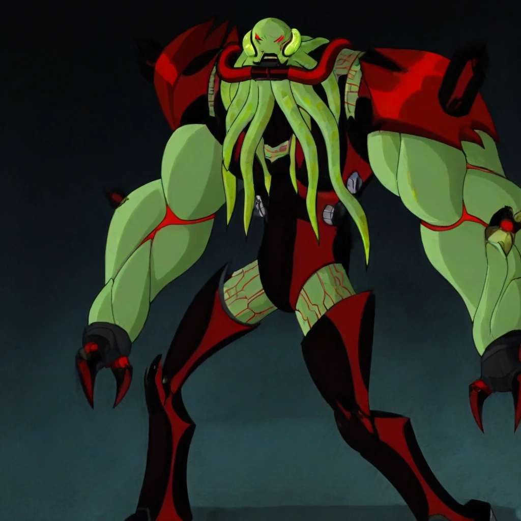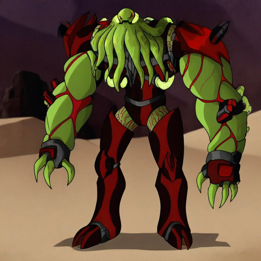 Vilgax, Alien, Giant, Crimson armor, Pale green skin, Muscular, Bald, Red eyes, No pupils, No nose, Tentacles on chin, Octopus head, Claws,