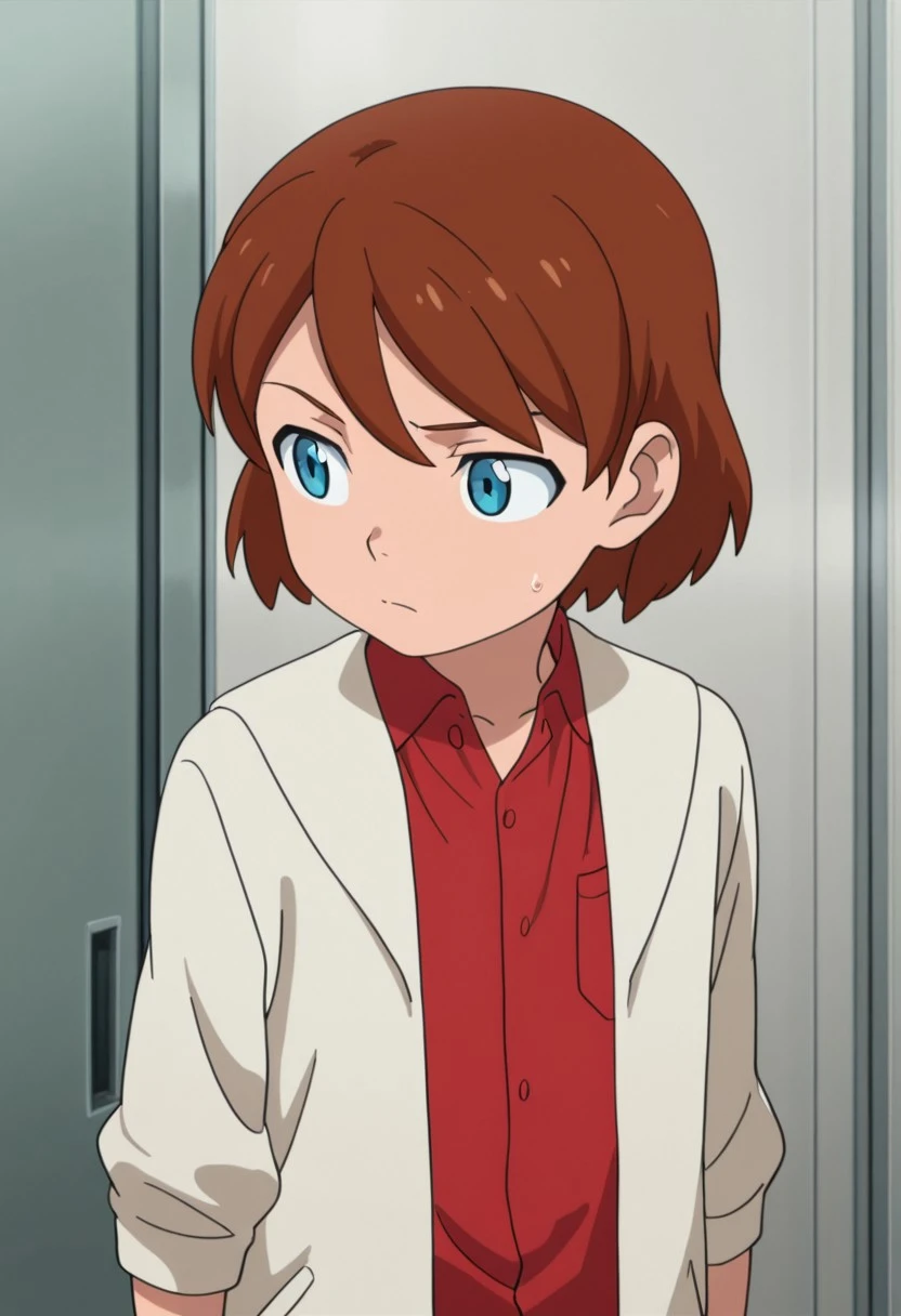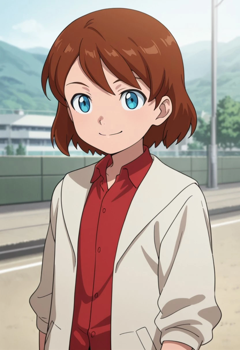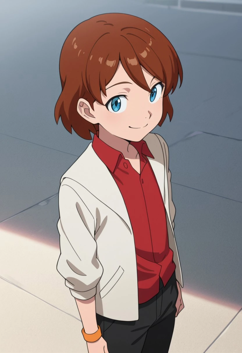 kiasuno, 1boy, male focus, solo, blue eyes, brown hair, red shirt, collared shirt, white jacket, open jacket, wristband, black pants, shoes, brown footwear,