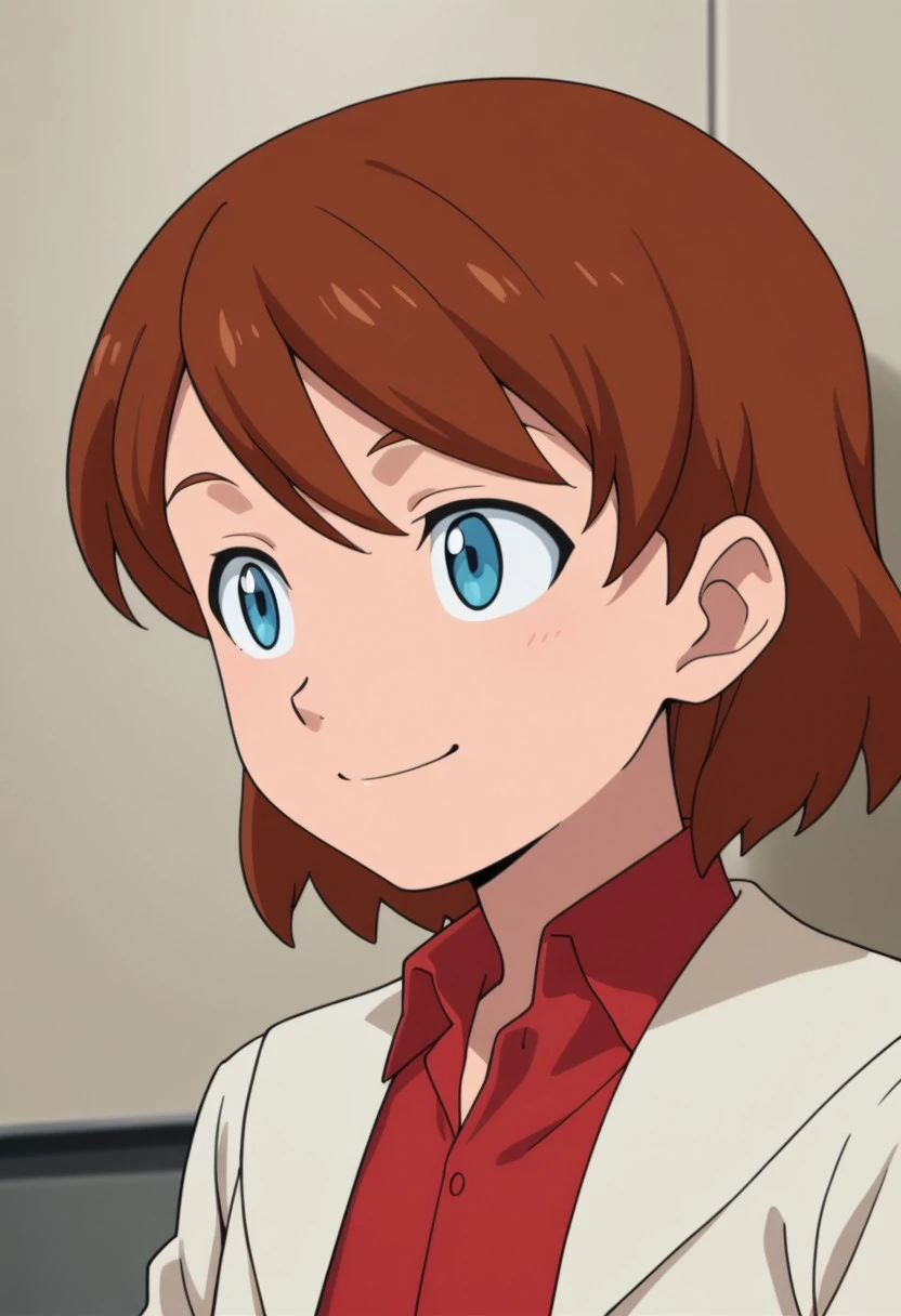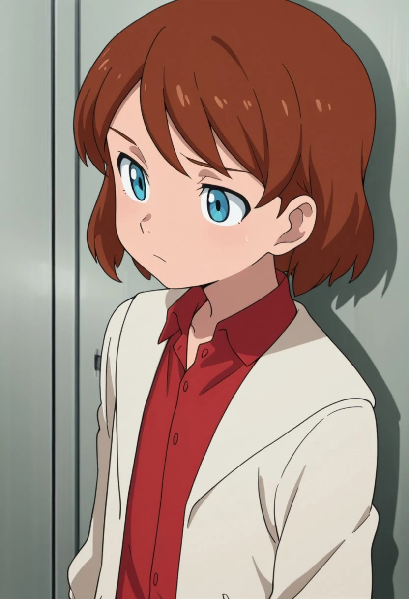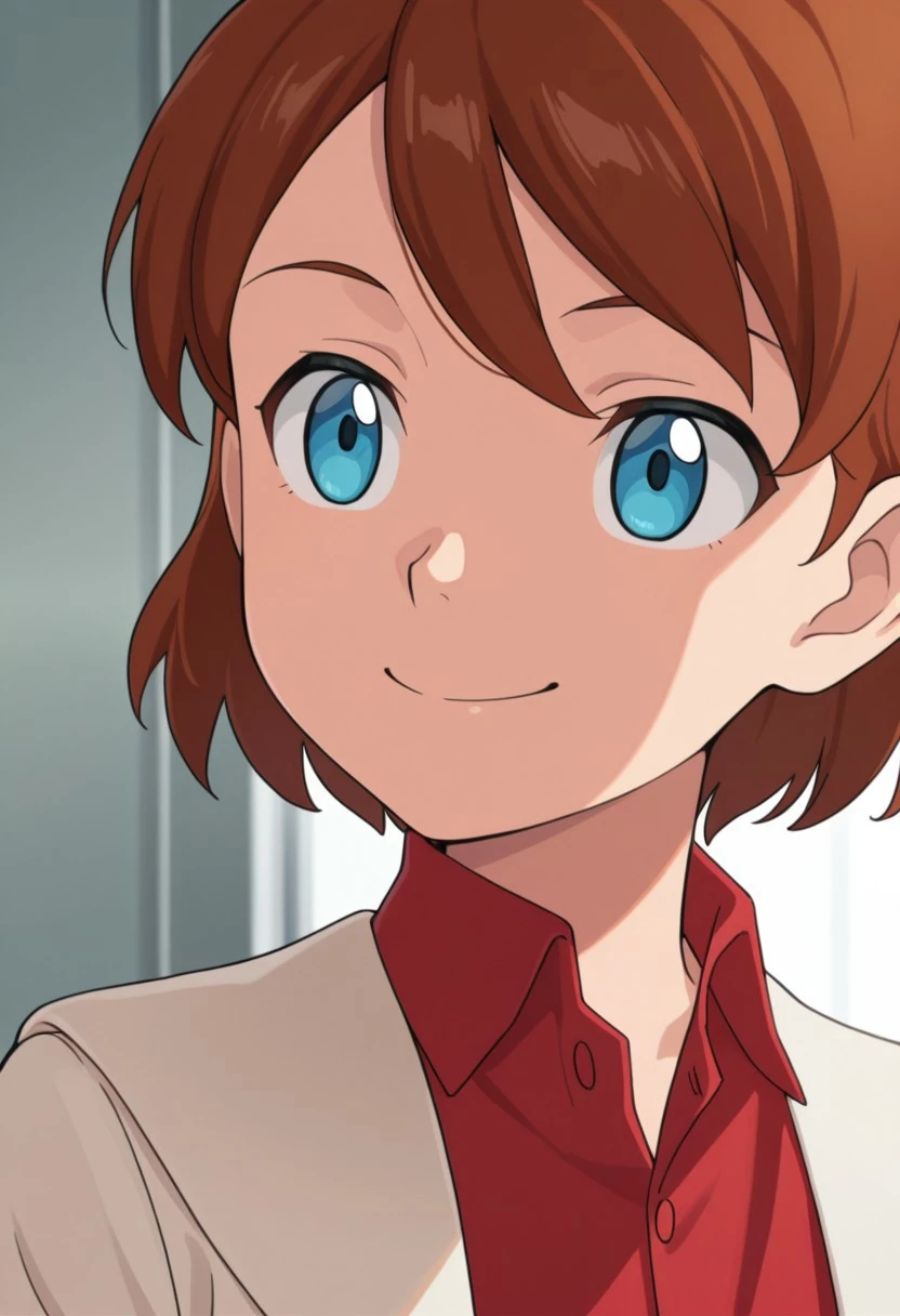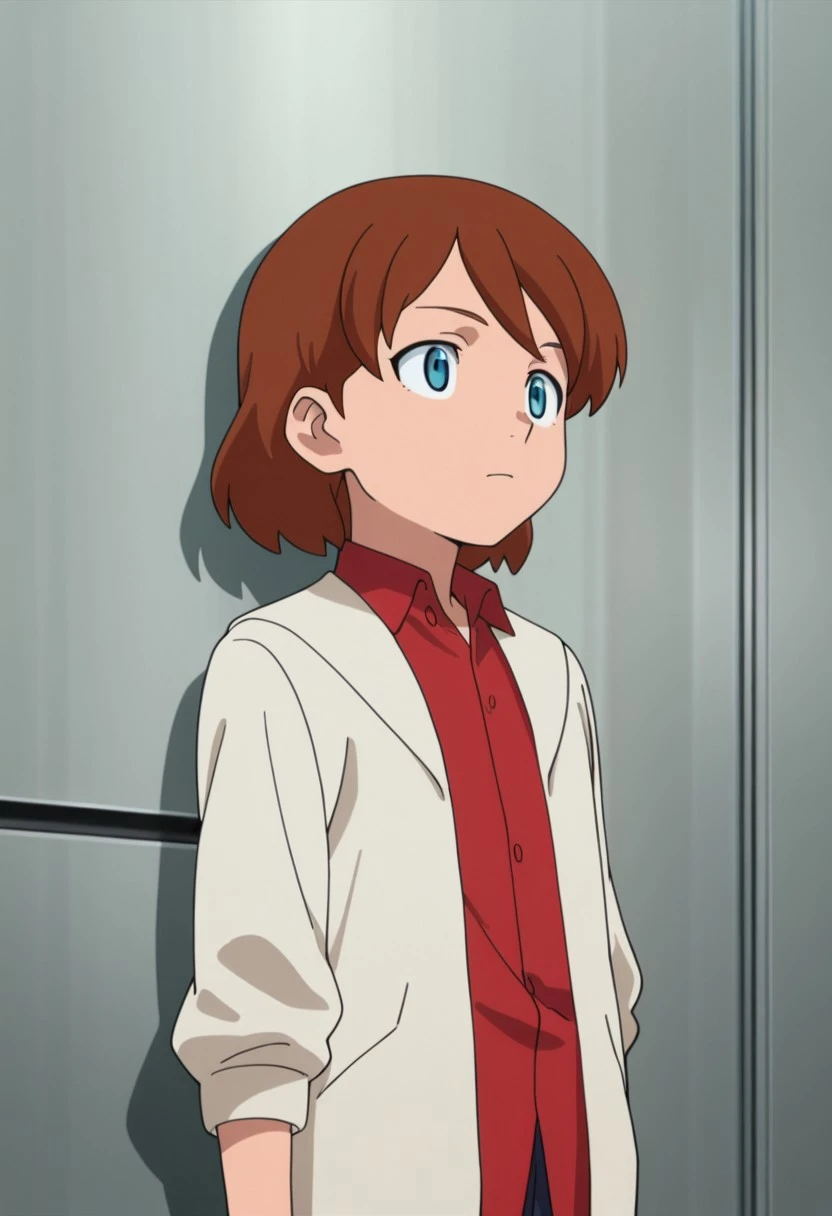 kiasuno, 1boy, male focus, solo, blue eyes, brown hair, red shirt, collared shirt, white jacket, open jacket, wristband, black pants, shoes, brown footwear,