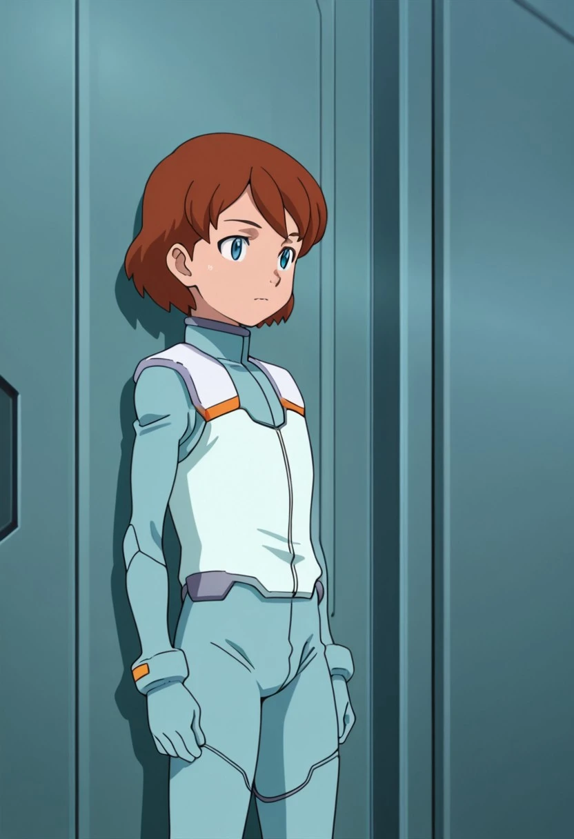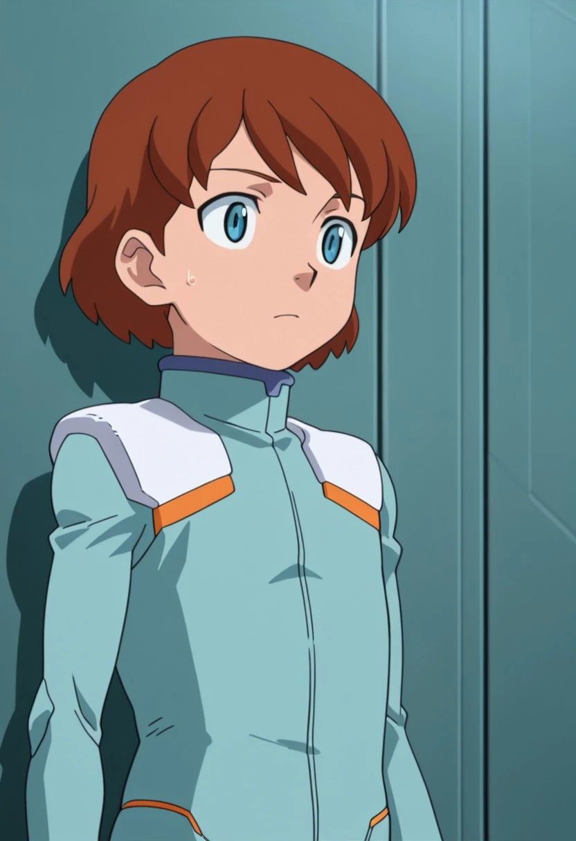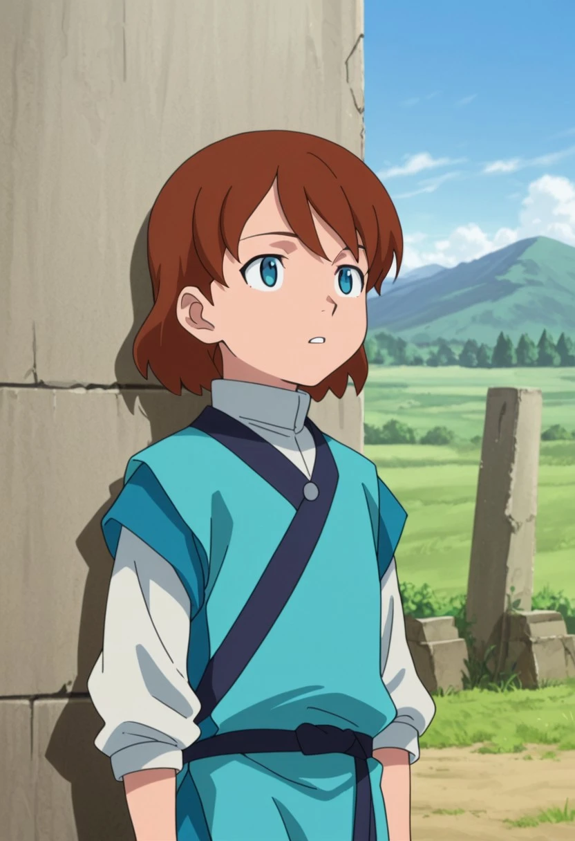 kiasuno, 1boy, male focus, solo, blue eyes, brown hair, white shirt, turtleneck, sleeves rolled up, blue tunic, brown pants,