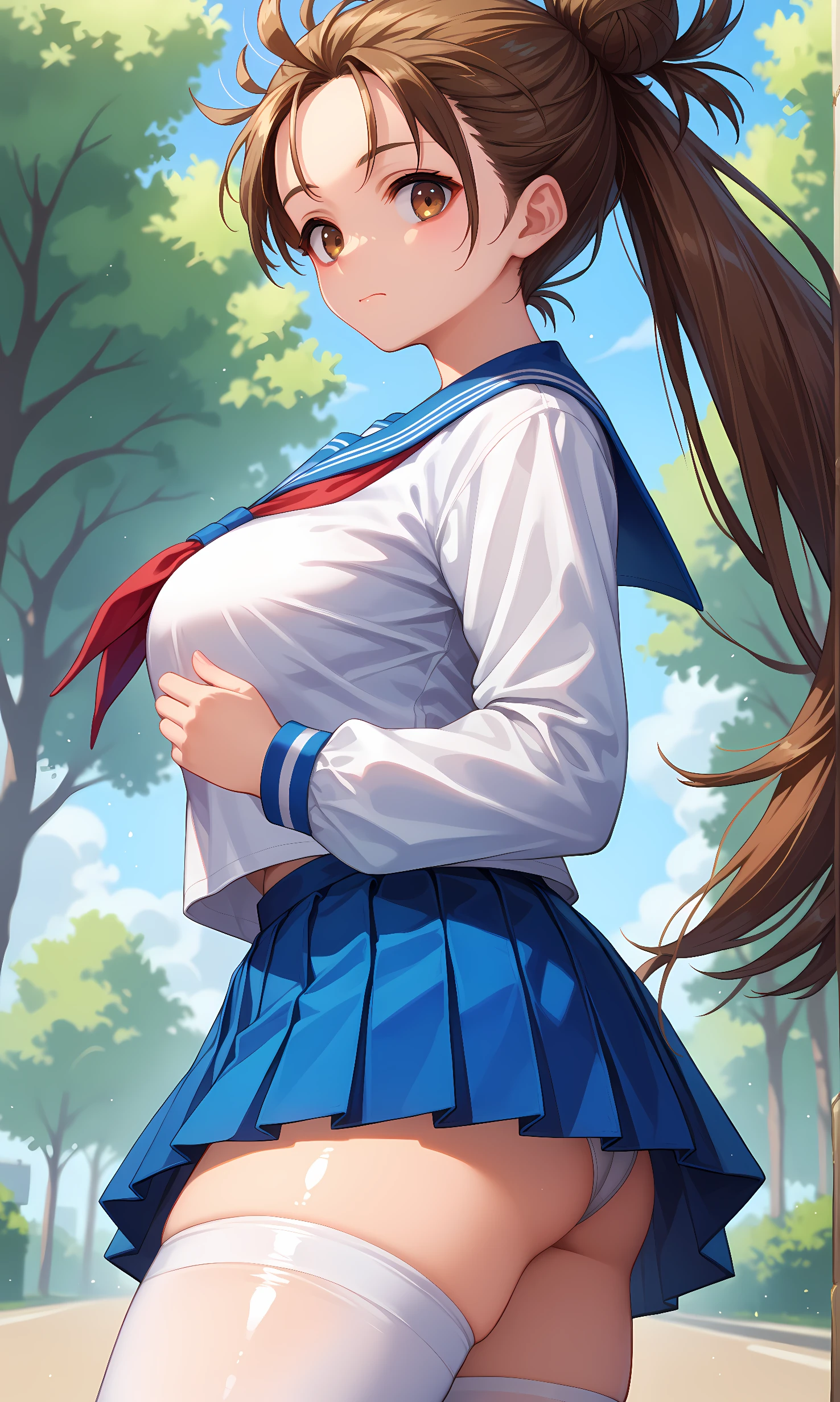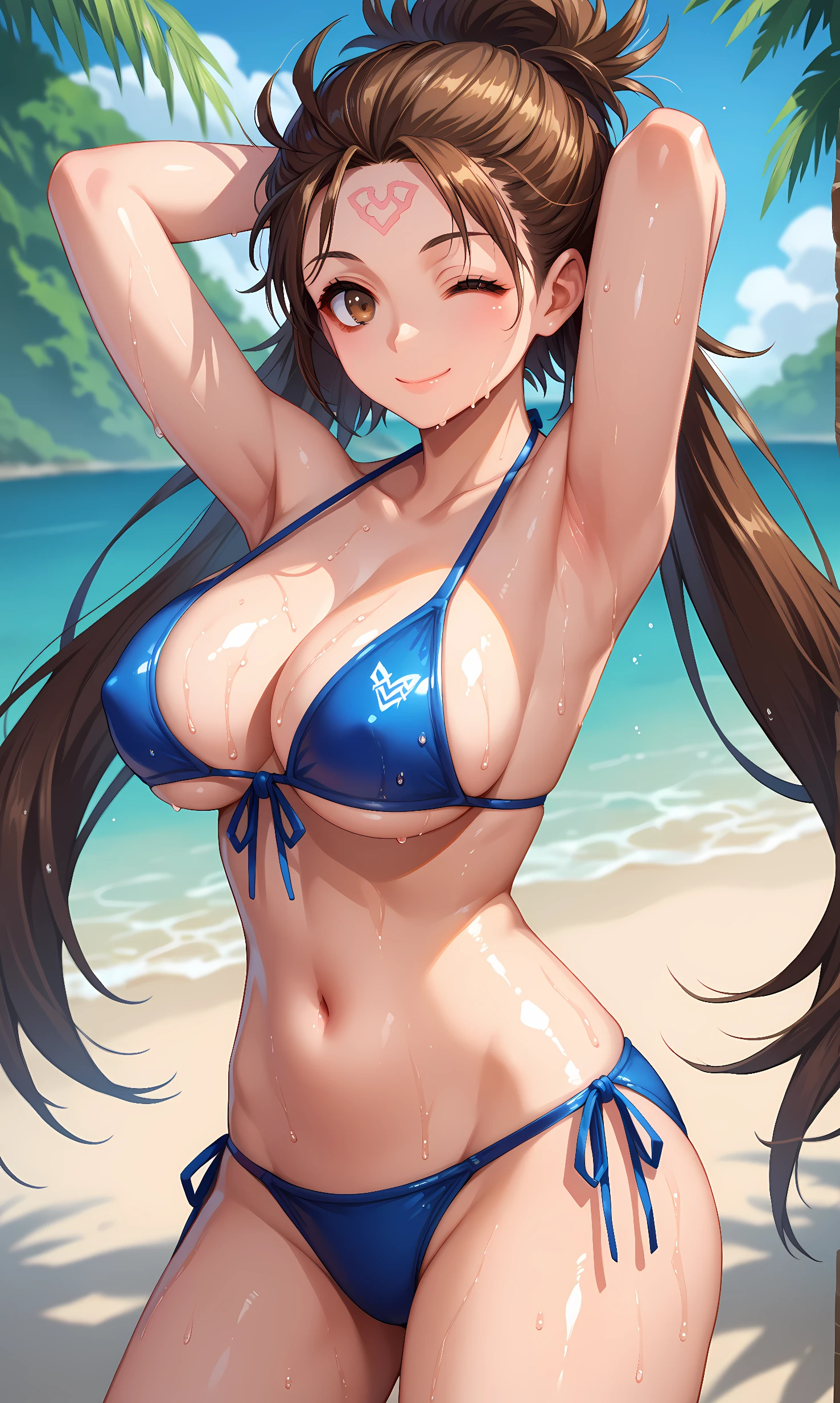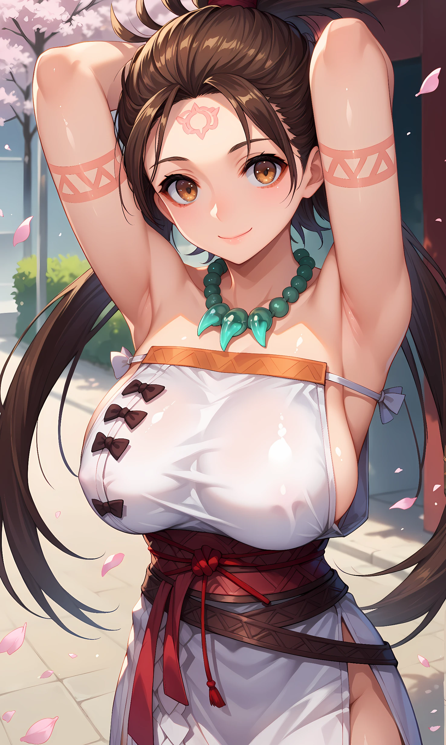 himiko_fgo, brown eyes, brown hair, long hair, facial mark, twintails, high ponytail, top knot