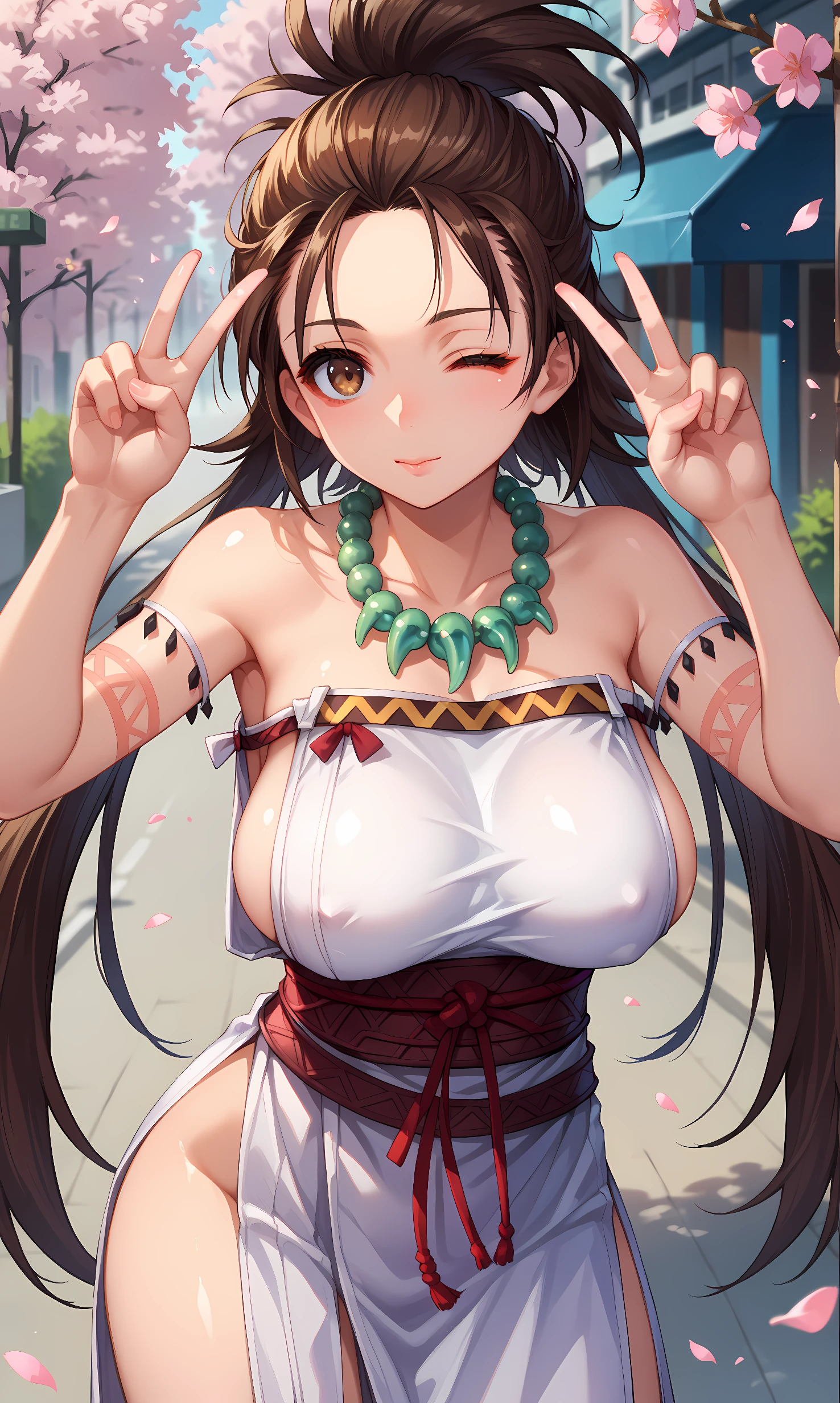 white dress, body markings, side slit, magatama necklace, sideboob, sash, ribbon, dress
