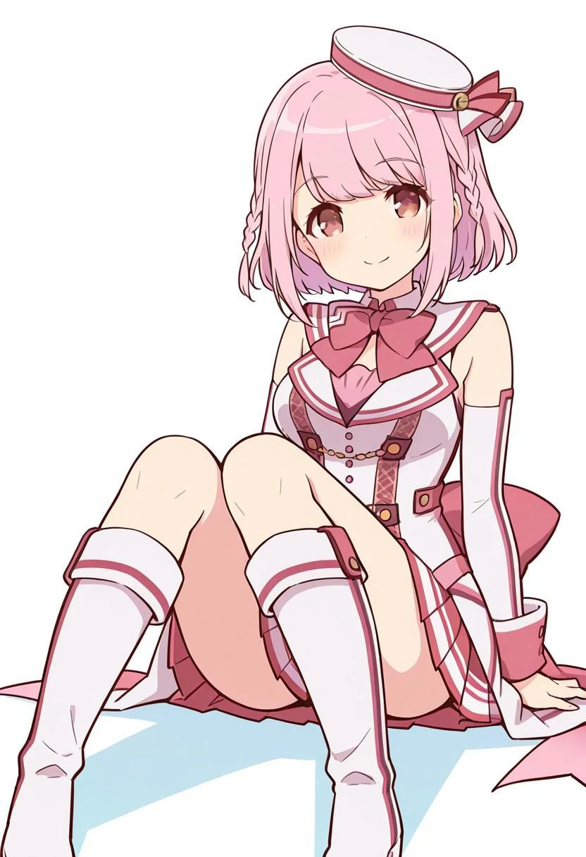 1girl, solo, skirt, white footwear, pleated skirt, boots, pink hair, hat, white headwear, braid, bangs, knee boots, shirt, detached sleeves, white sleeves, sleeveless shirt, bow, long sleeves, sleeveless, white jacket,