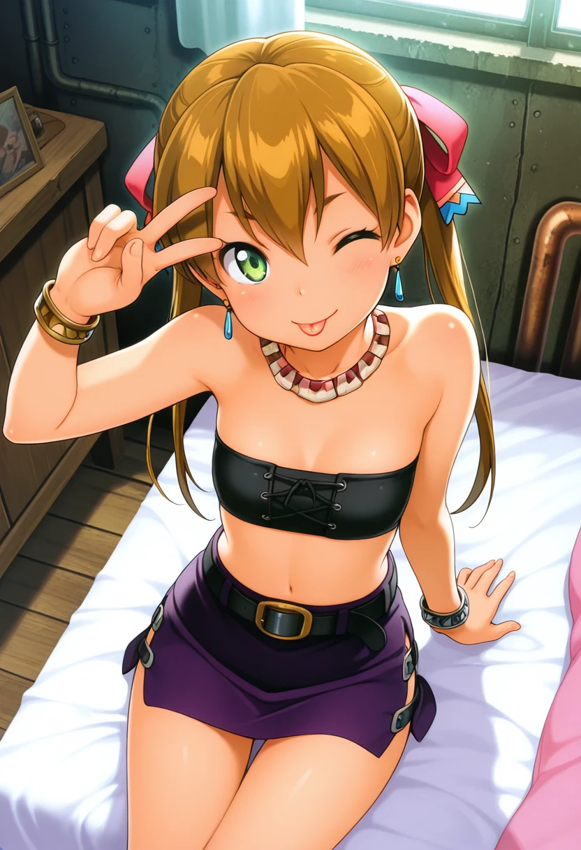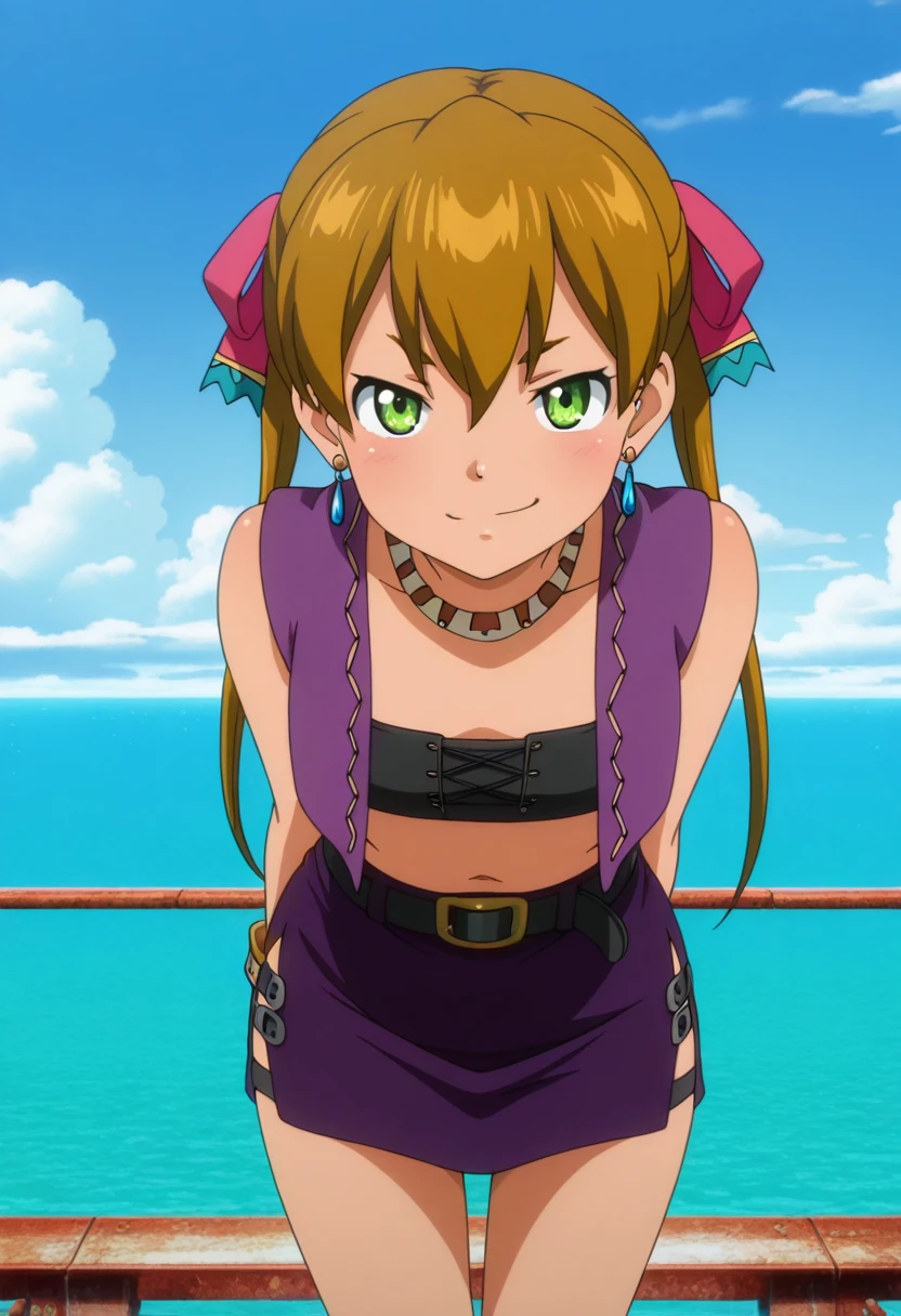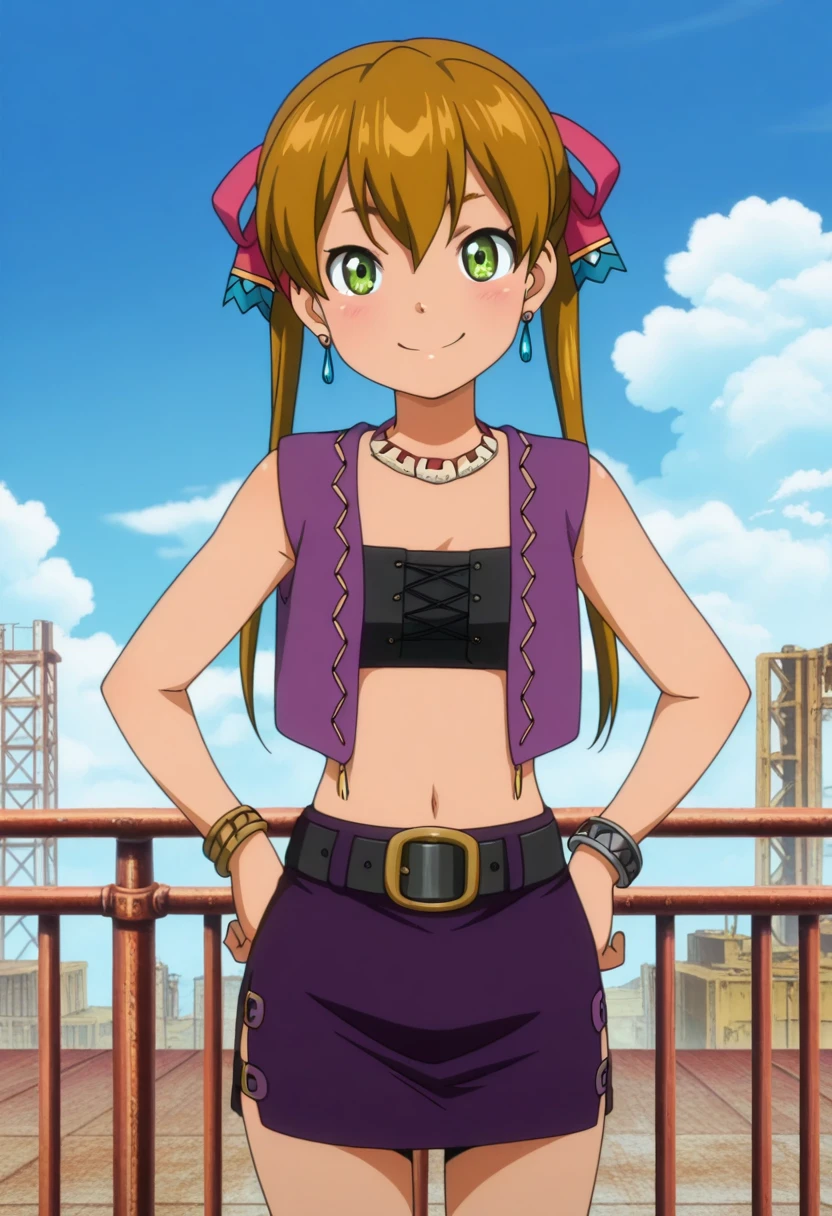 meltycasu, bracelet, necklace, purple vest, black tube top, purple miniskirt, black belt, brown sandals, midriff,