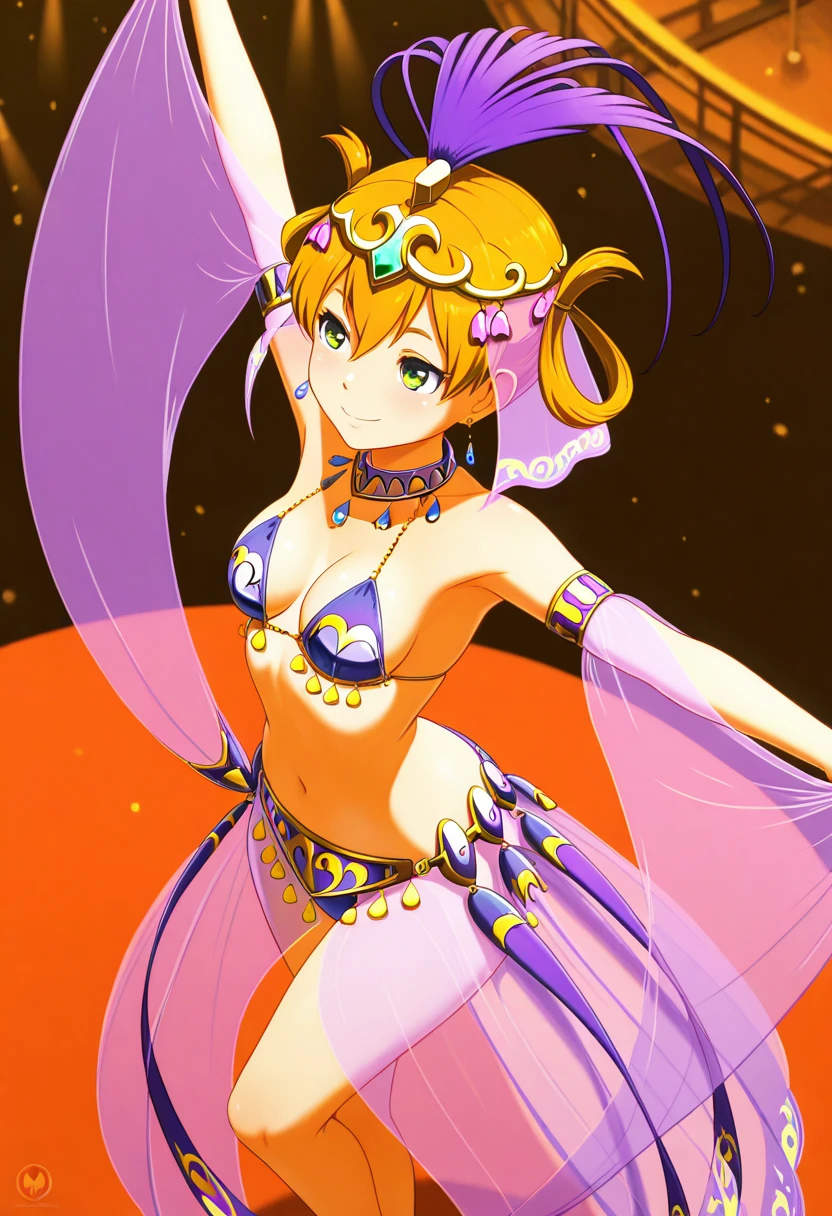 meltysng, melty \(suisei no gargantia\), suisei no gargantia, green eyes, hair rings, short hair, blonde hair, meltydancer, hair ornament, feather hair ornament, tiara, veil, purple choker, jewelry, armlet, see-through sleeves, detached sleeves, gold trim, dancer, harem outfit, arabian clothes, belly dancer, purple bikini, bikini armor, see-through, bracelet, earrings, midriff, anklet