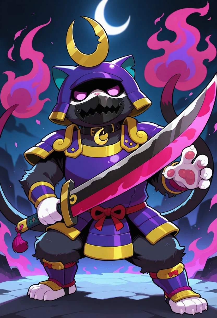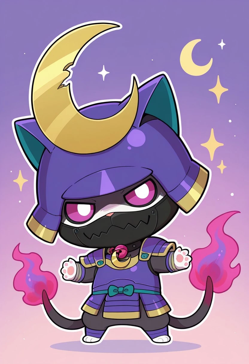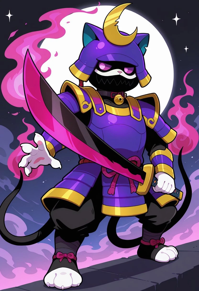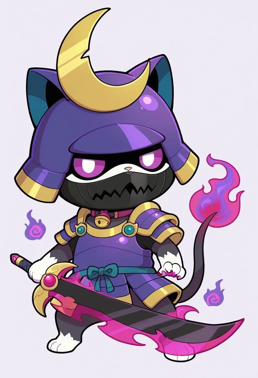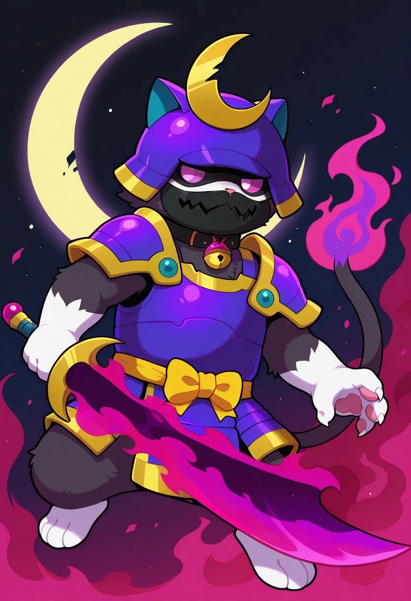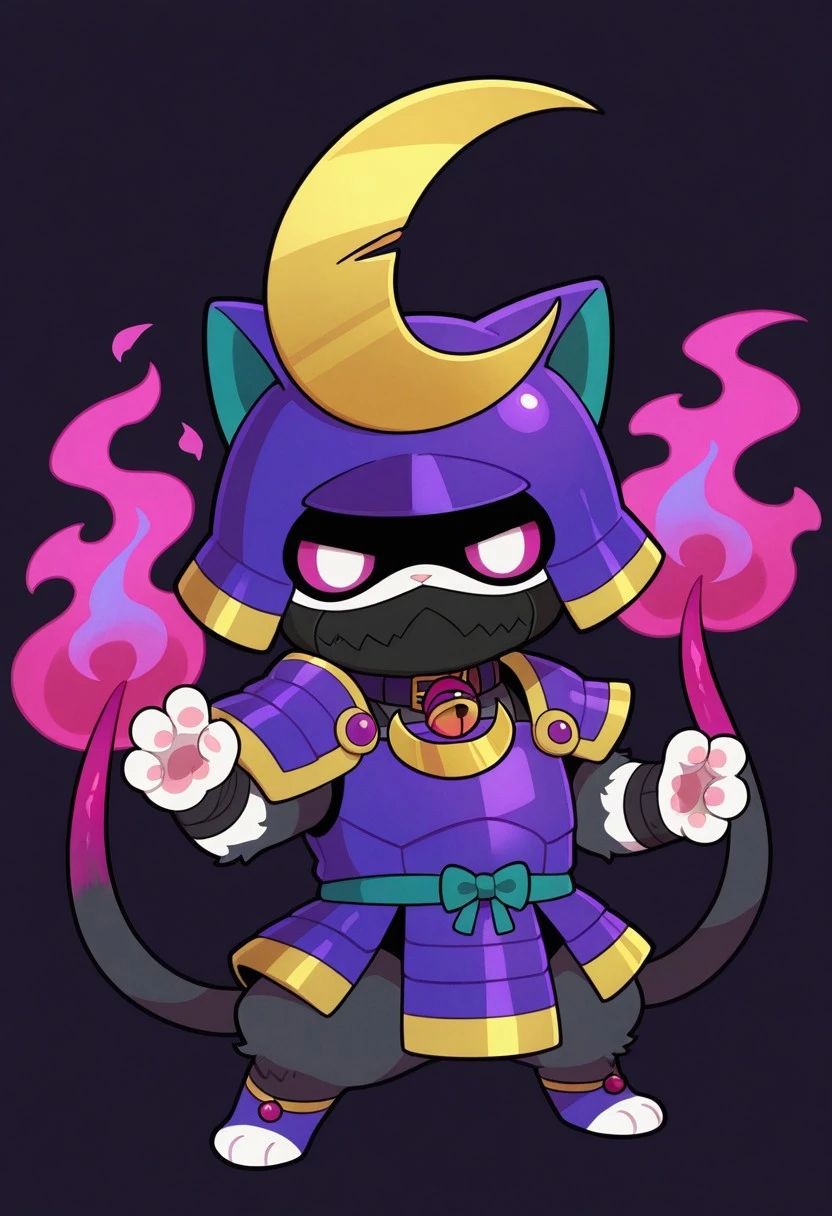 solo,male,anthro cat,chibi,black fur,white face,magenta sclera,without pupils,two tails,pink flame tipped-tail,collar with red bell,white hands,white paws,pink nose,purple helmet with big yellow crescent moon,purple armor,black mask