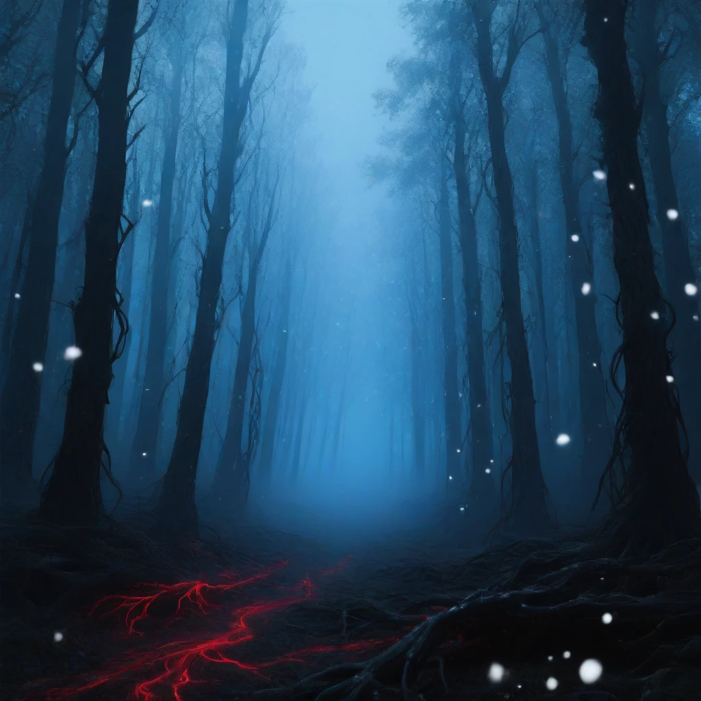 dark surreal landscape, horror environment, alien dimension, cold blue ambient light, red glowing clouds, atmospheric fog, glowing white dust, floating ash particles, desaturated colors, eerie silence, corrupted nature, black tendrils, glowing red veins, cinematic horror lighting, decayed architecture, unnatural stillness, haunted mood, soft fog layering, lifeless atmosphere, pale bluish tones, surreal world design, pulsing organic textures, dreamlike horror, frozen reality, abandoned structures, rotting surfaces, high contrast lighting, horror-inspired decay, oppressive environment, slow-motion atmosphere