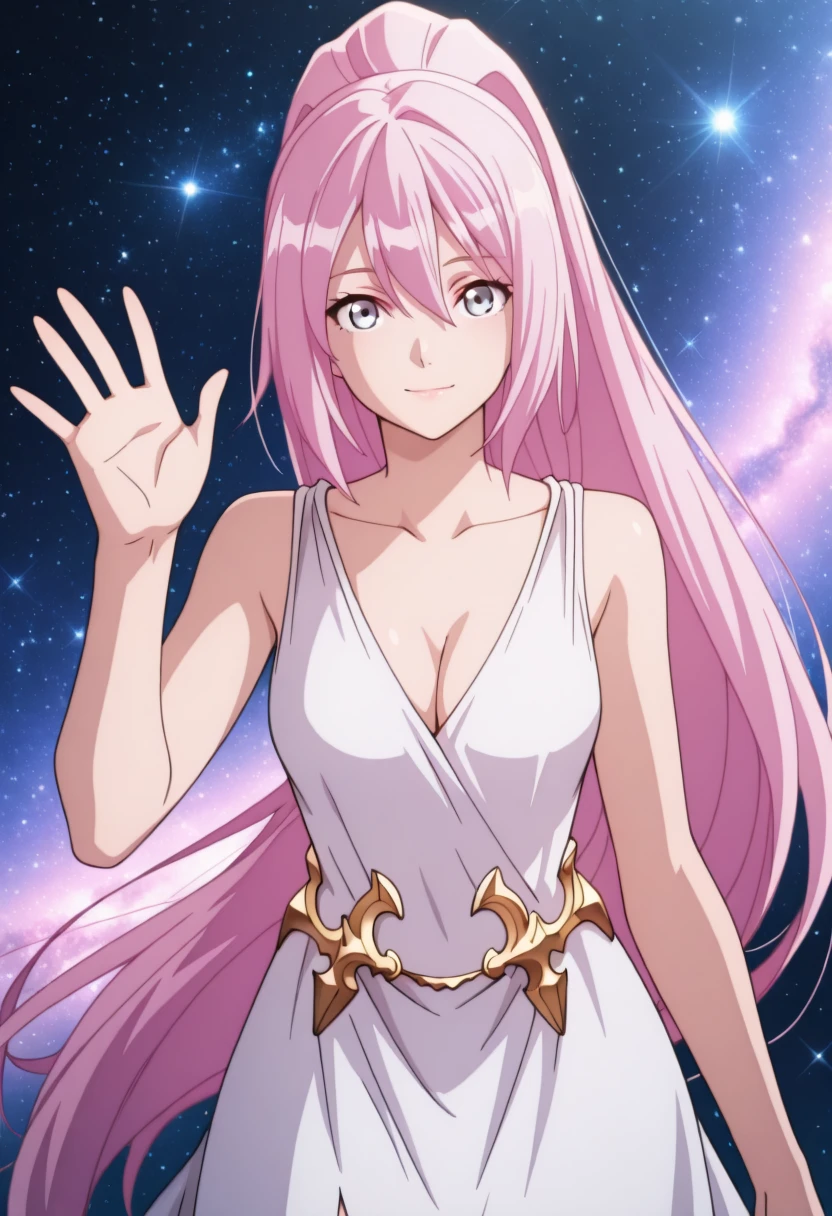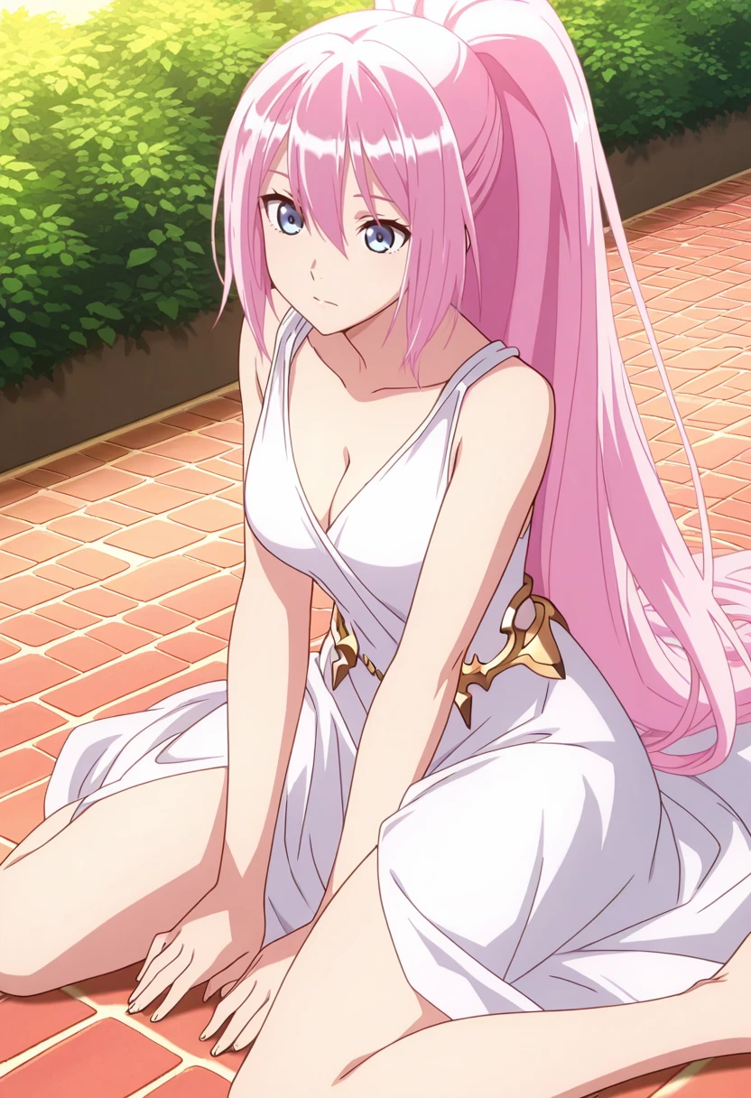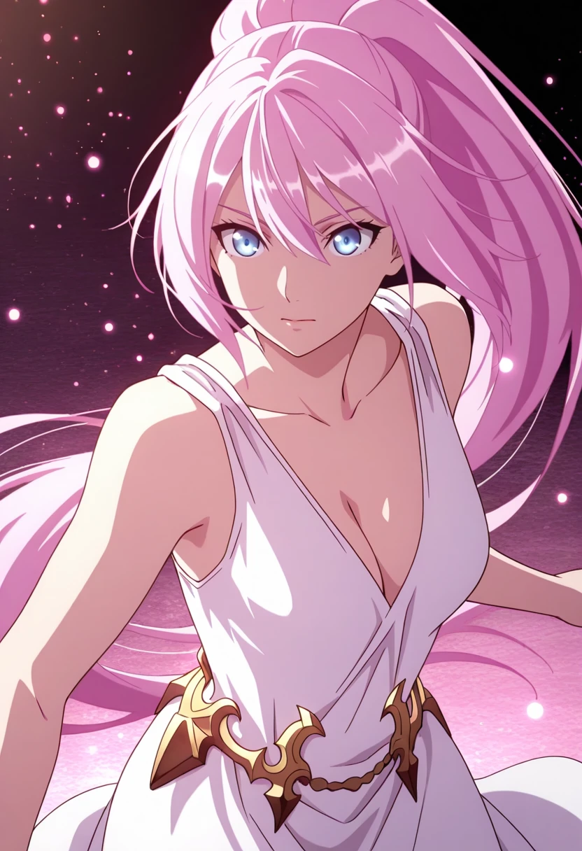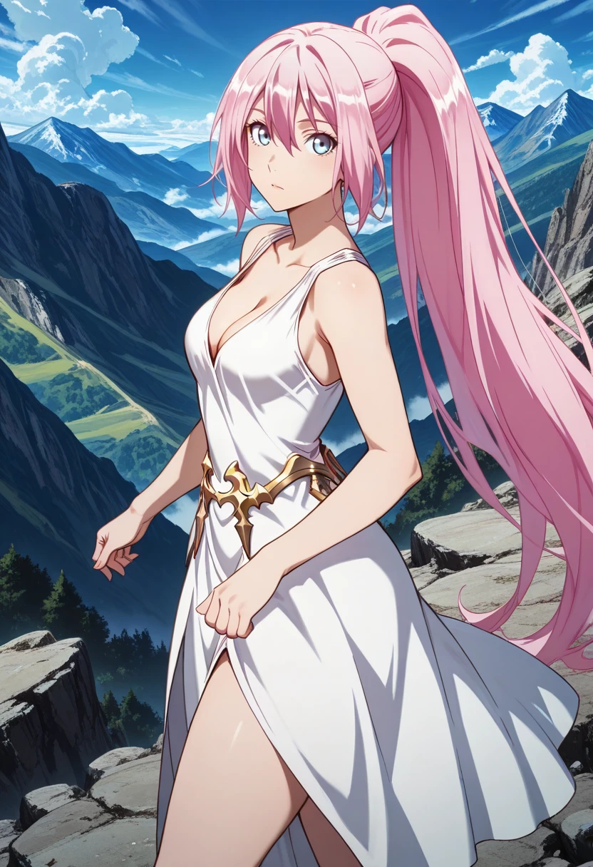 1girl, solo, very long hair, pink hair, sidelocks, high ponytail, hair between eyes, blue eyes, medium breasts, cleavage