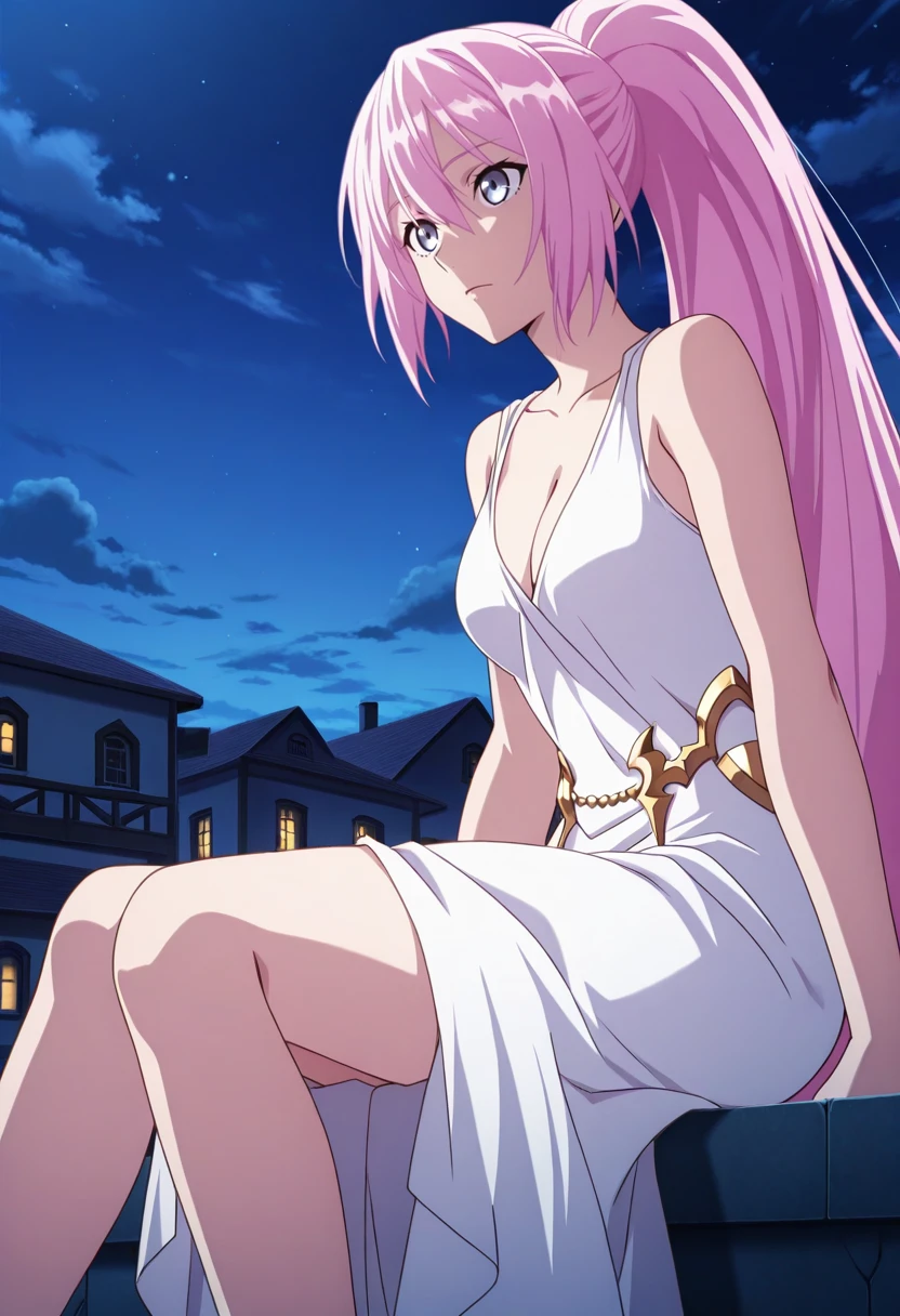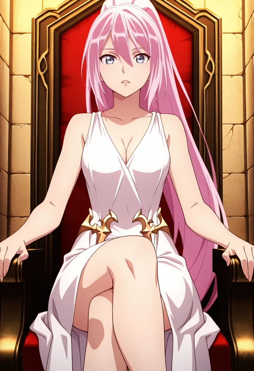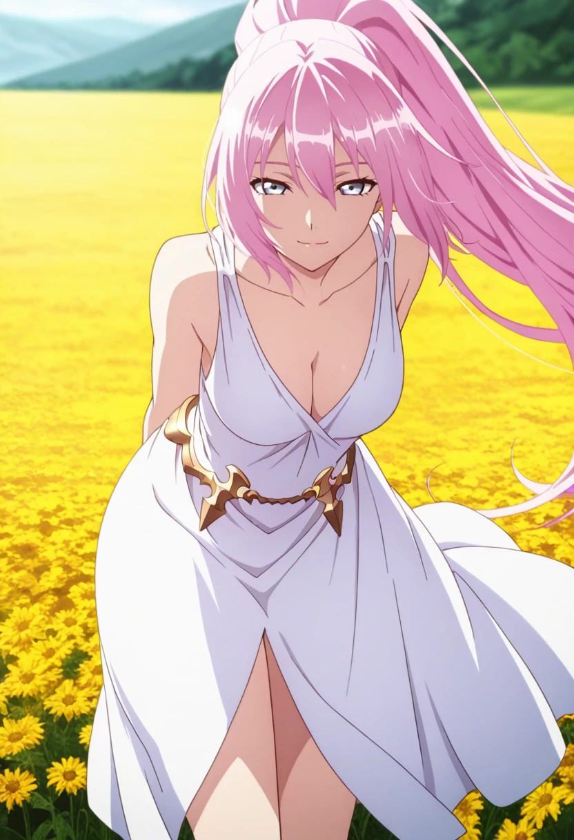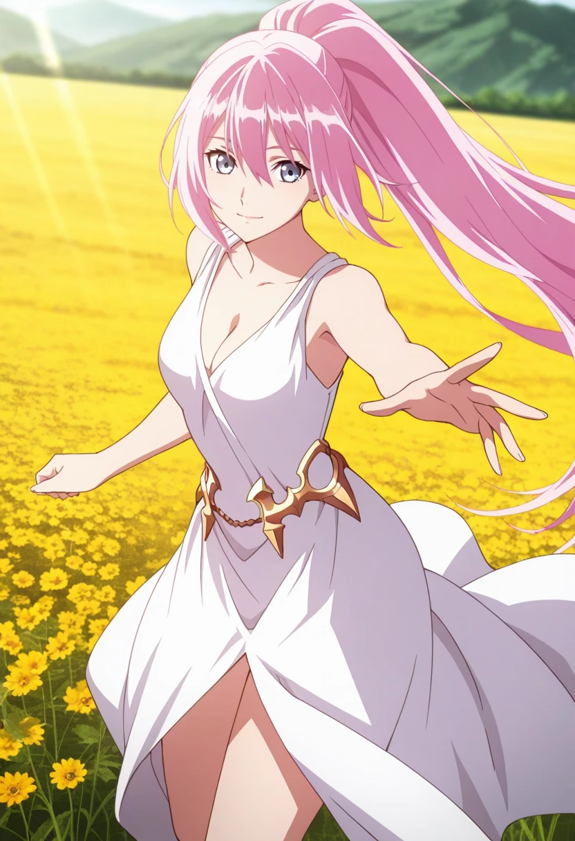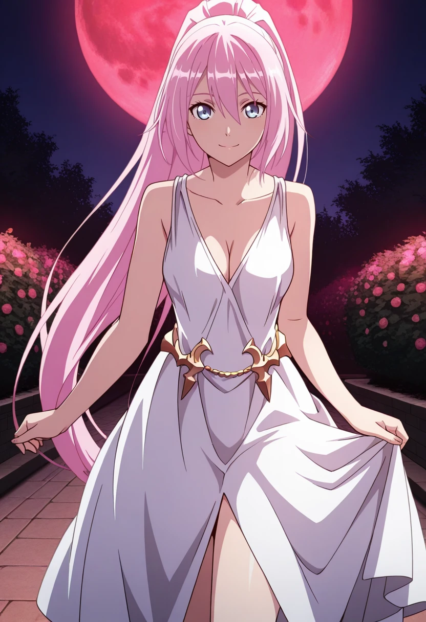 1girl, solo, very long hair, pink hair, sidelocks, high ponytail, hair between eyes, blue eyes, medium breasts, cleavage