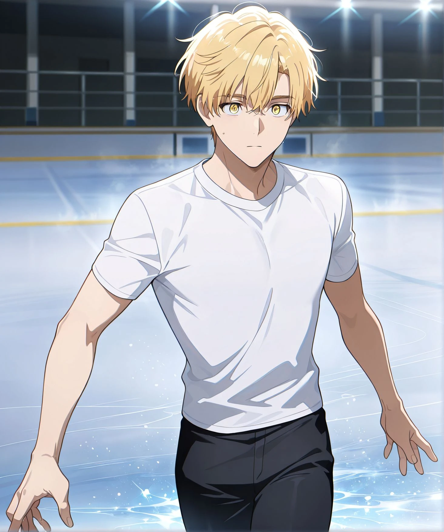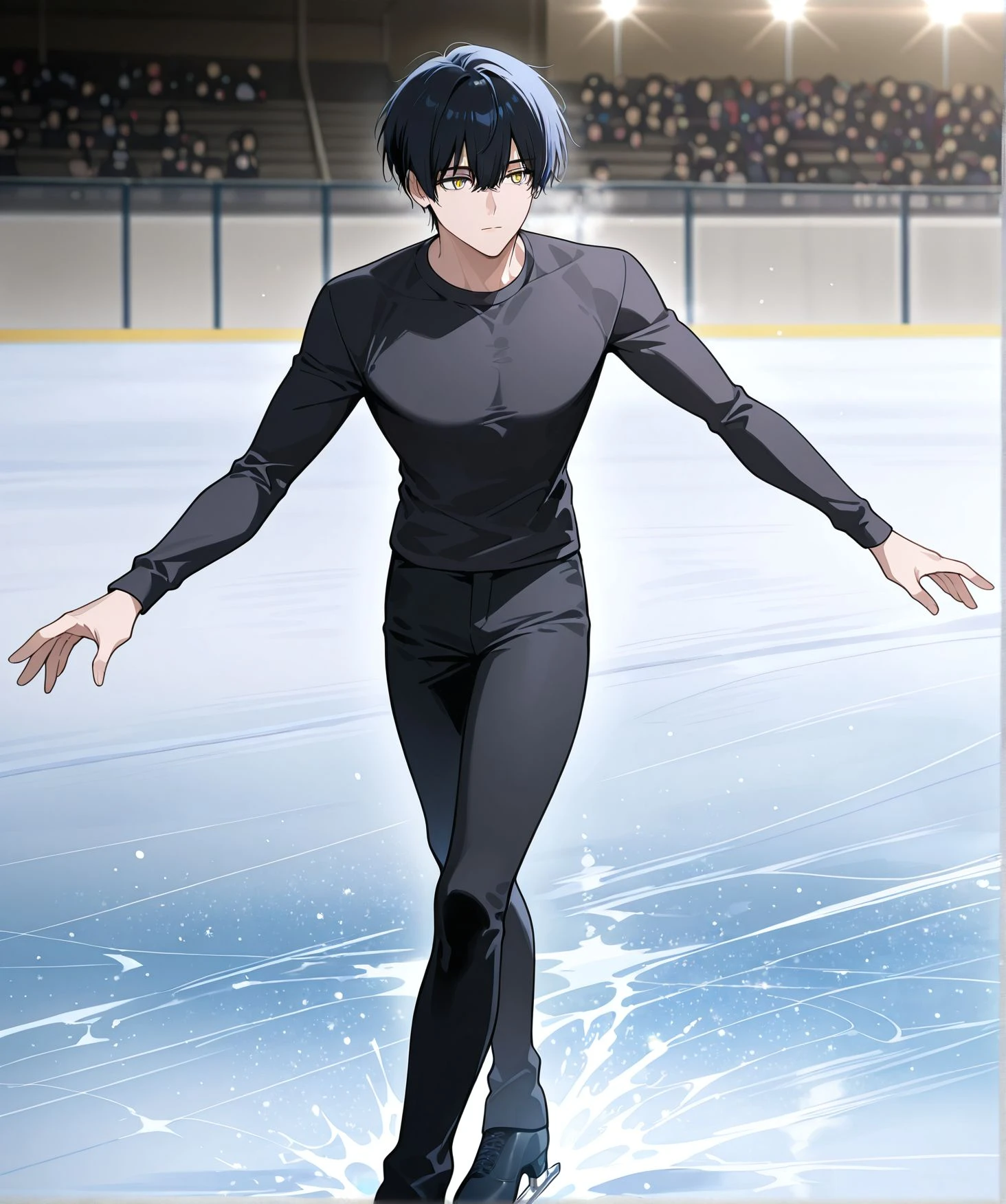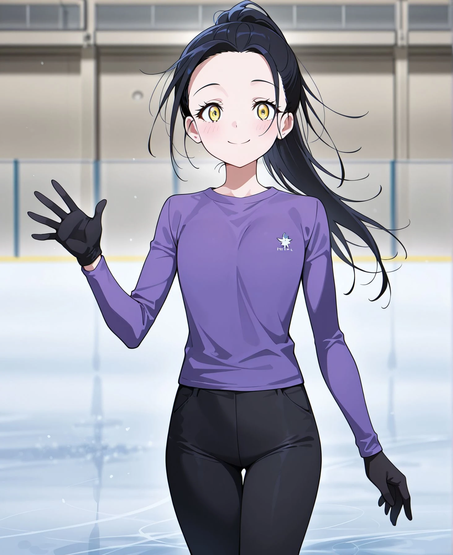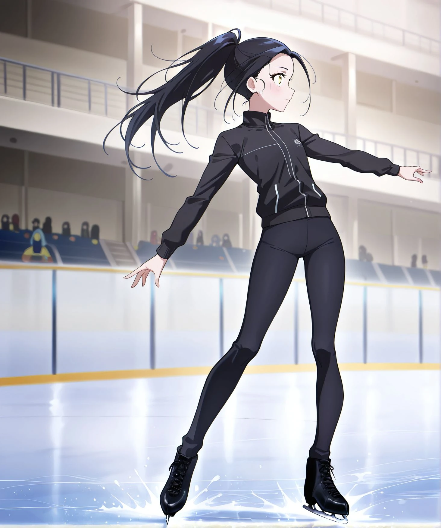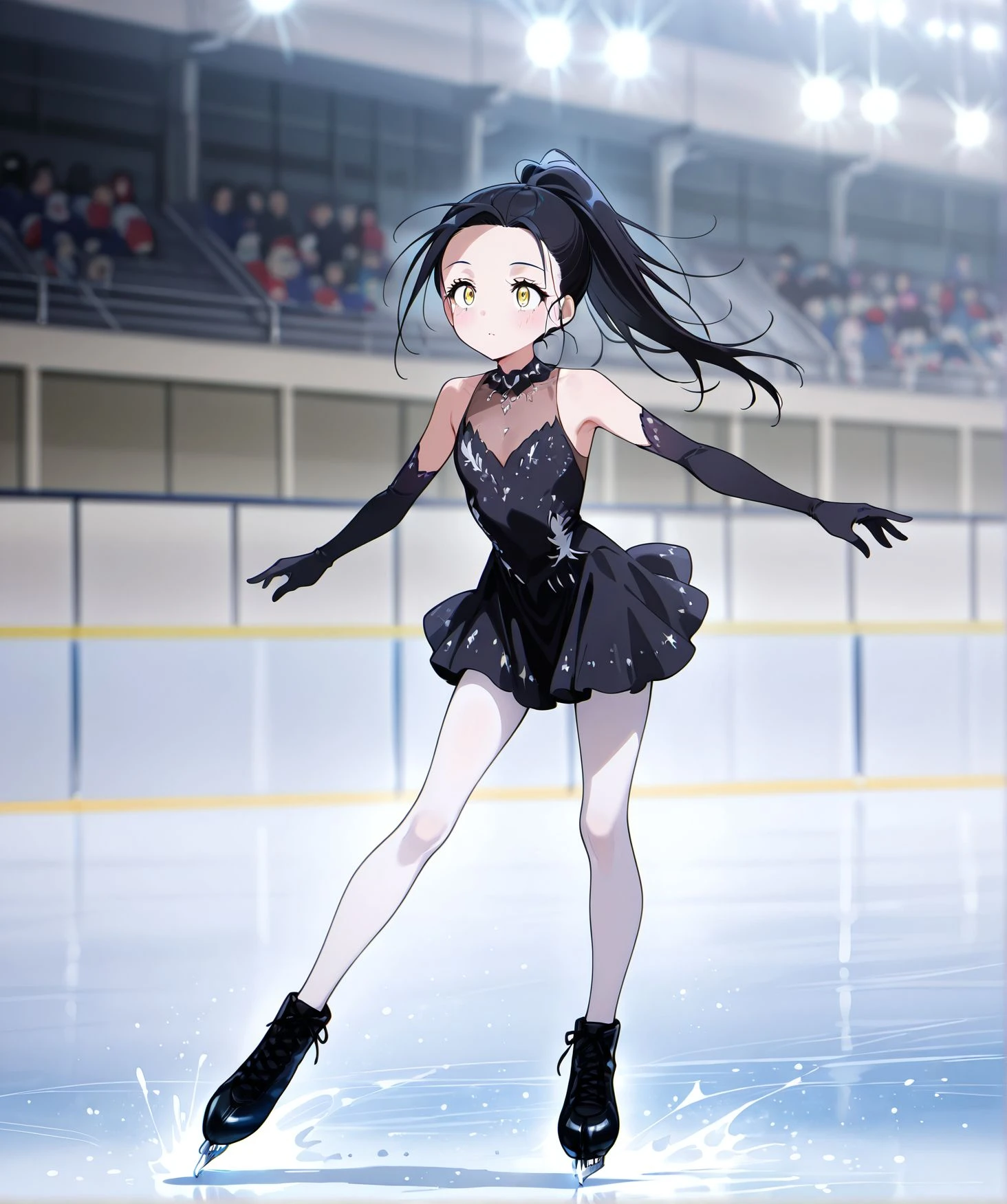 black hair,long hair,yellow eyes,ponytail,ice skates,