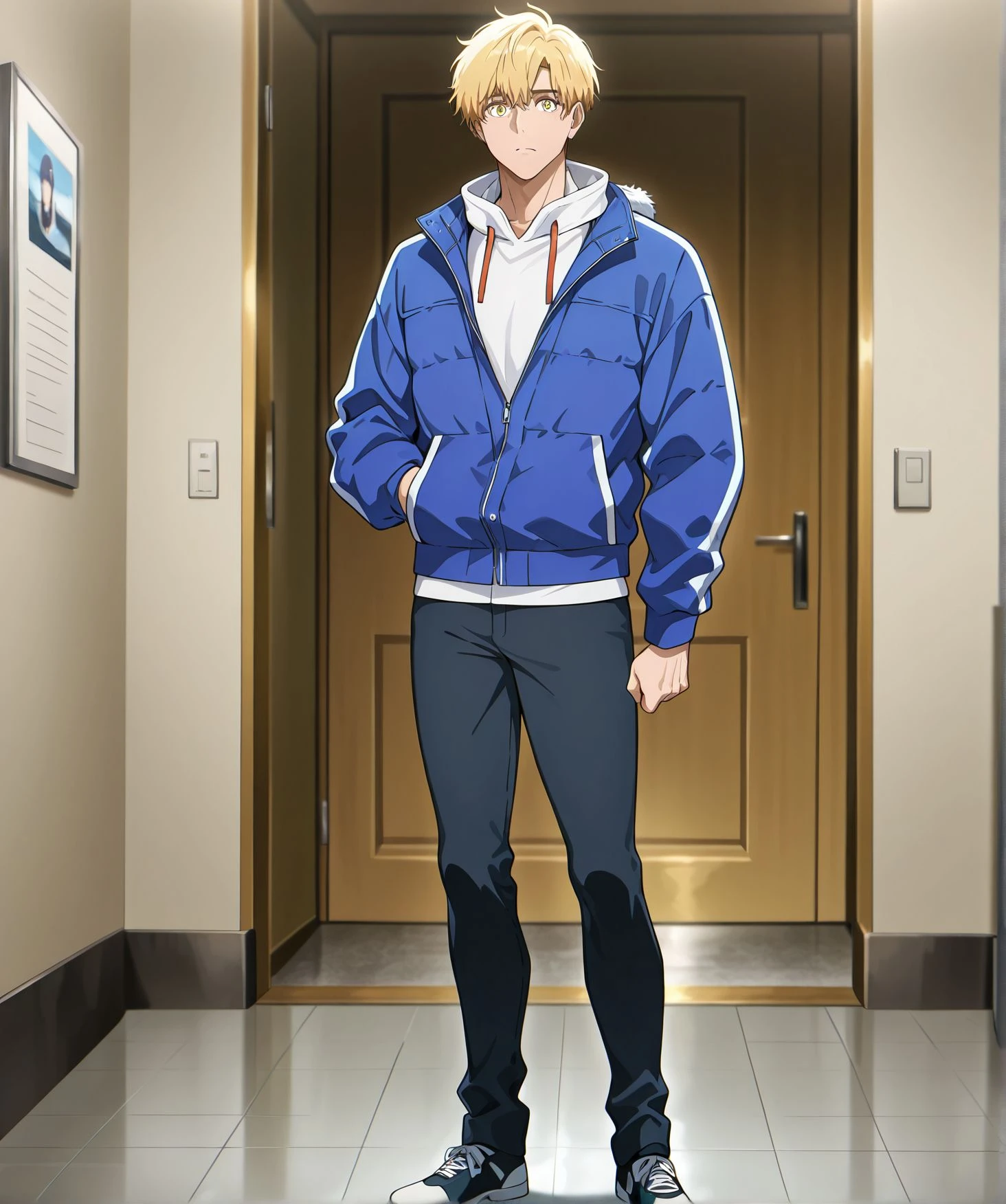 1boy,male focus, solo,short hair,yellow eyes,blonde hair,aged up,m_Tsukasa,