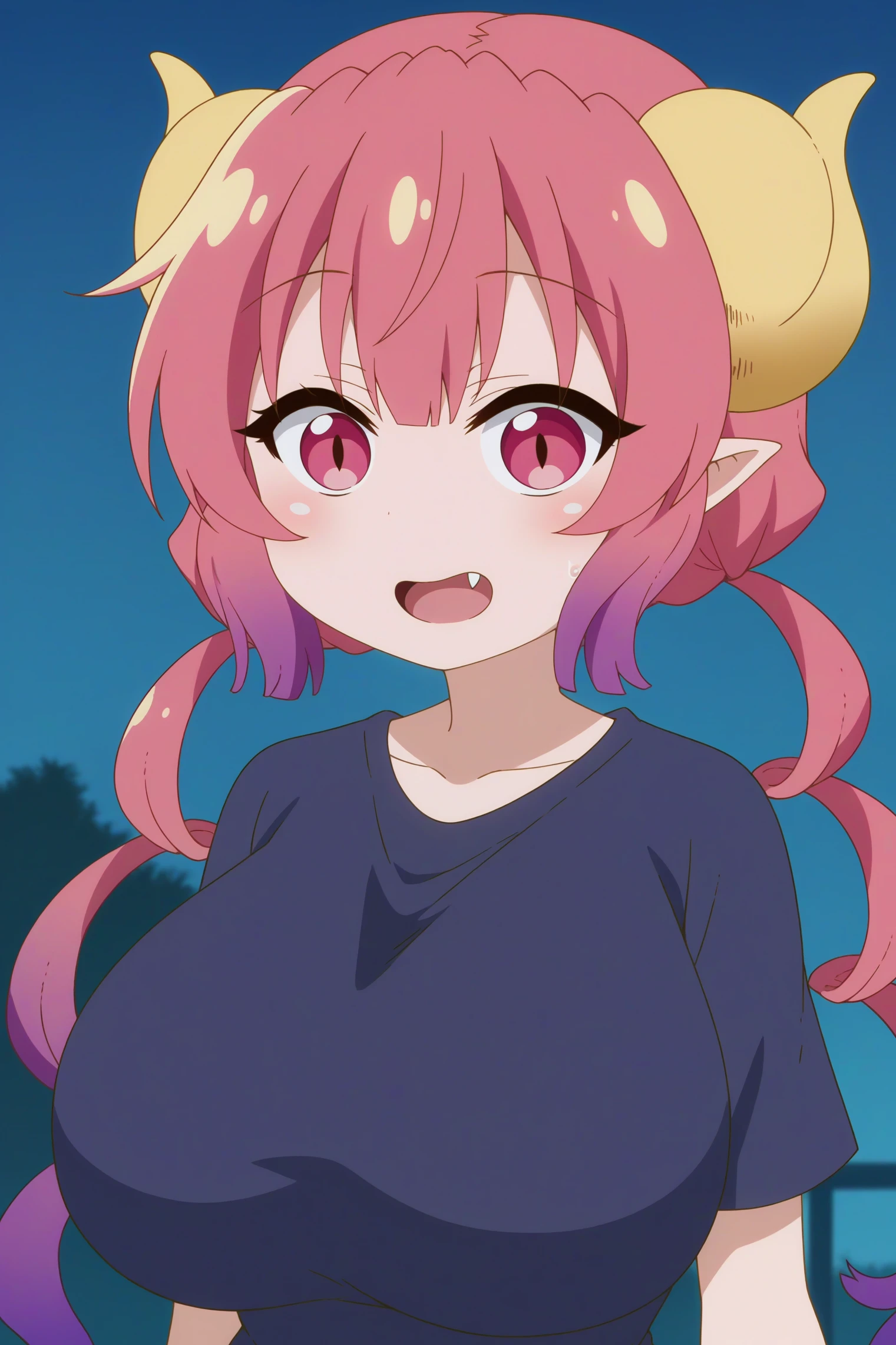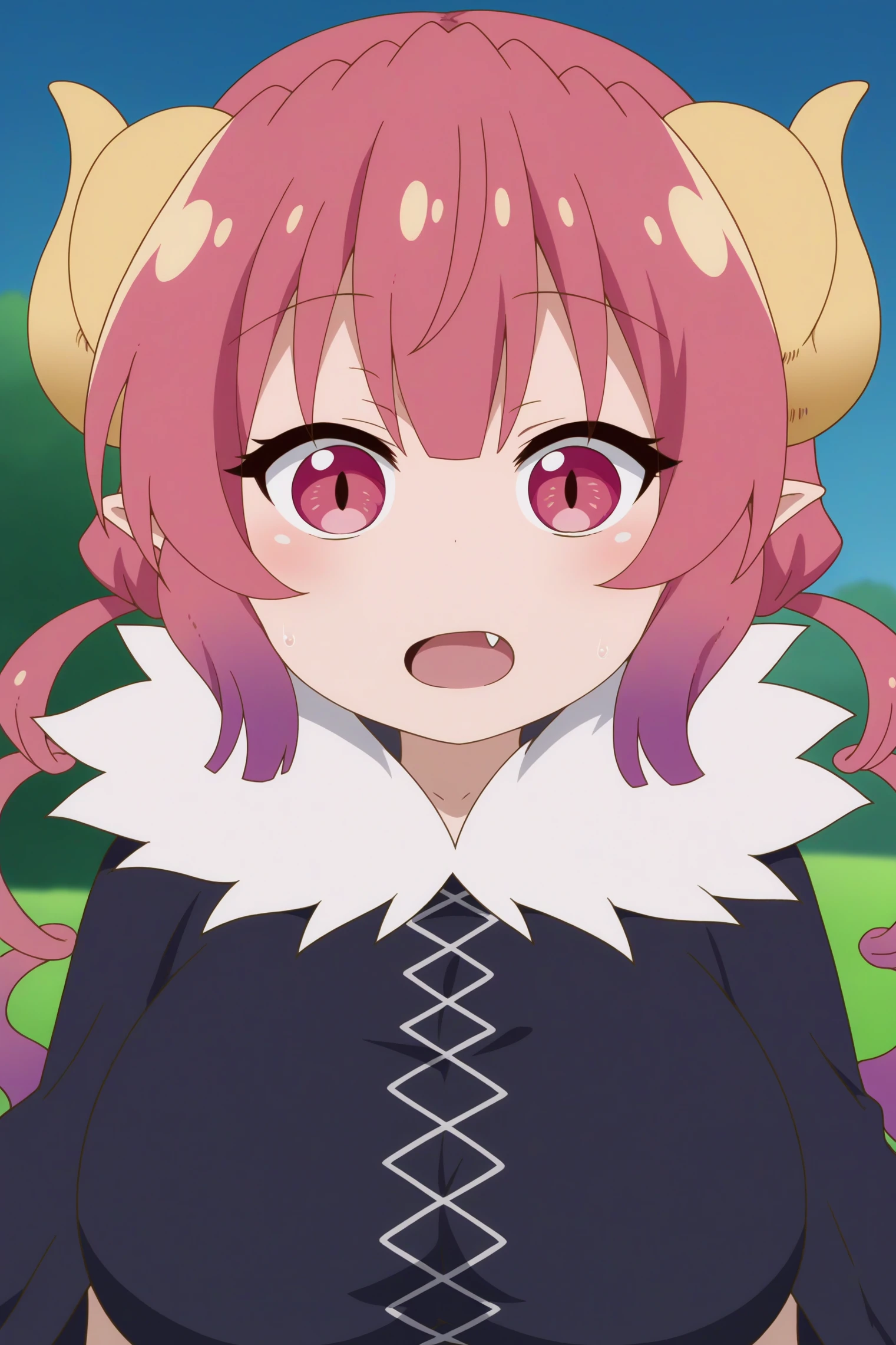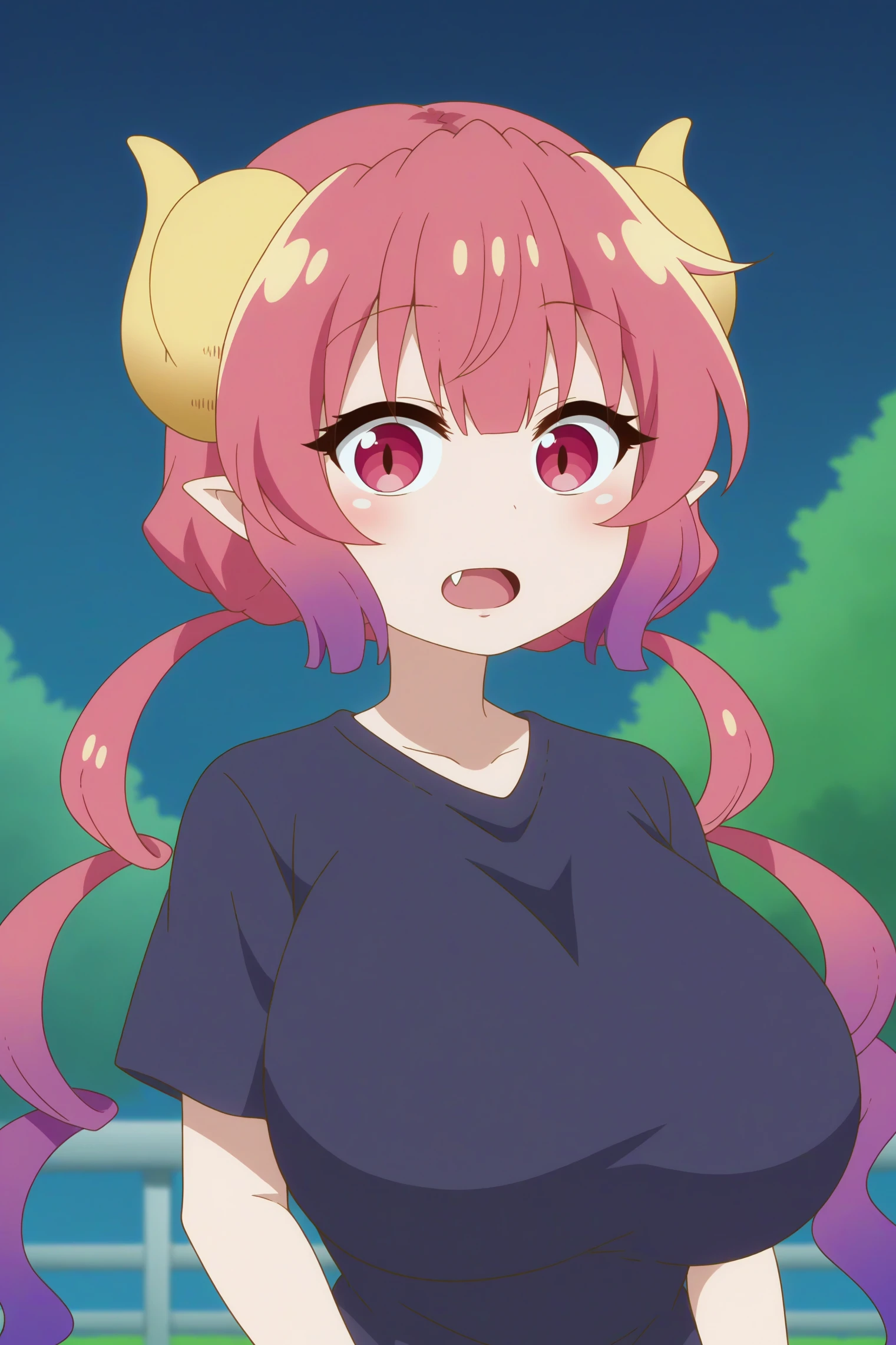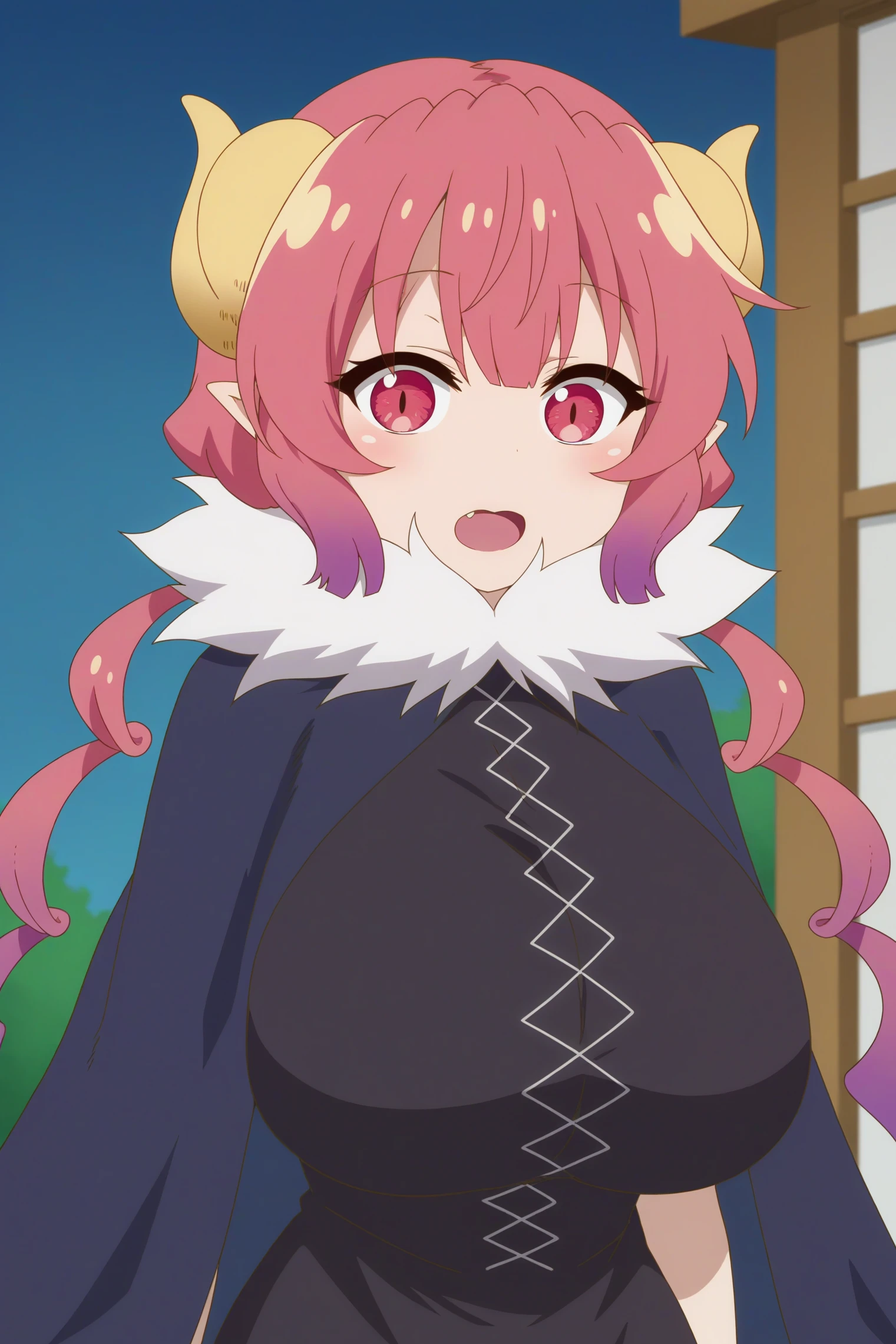 Triggers : 1girl,solo,illulu,breasts,horns,dragon horns,dragon girl,black cape,fur trim,fang,huge breasts,twintails,long hair,pointy ears,split pupils