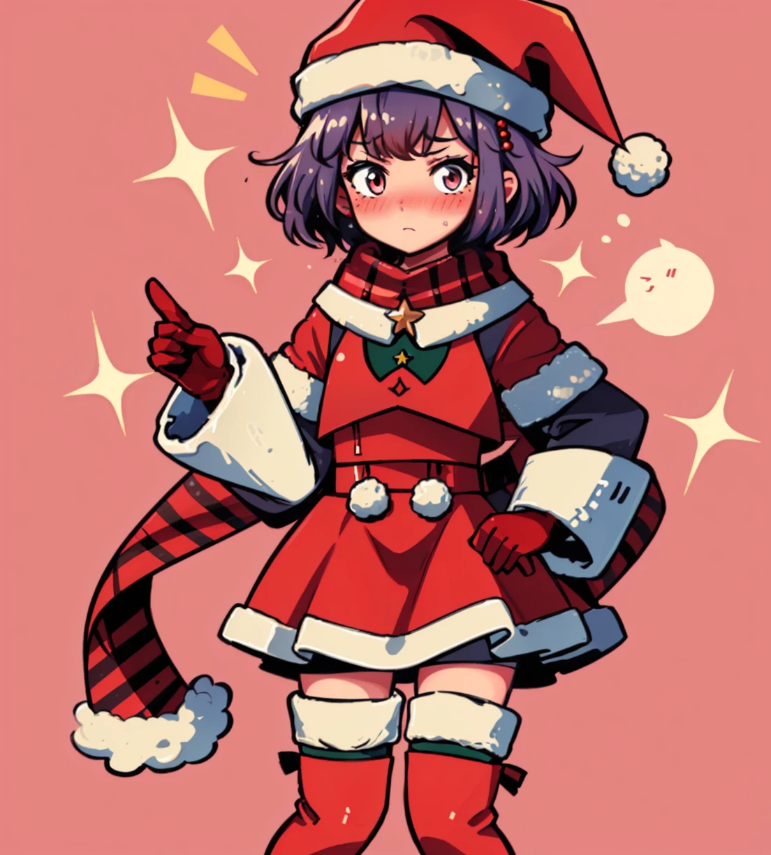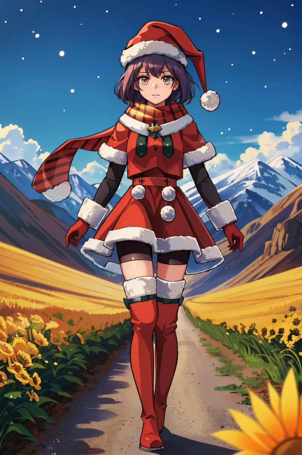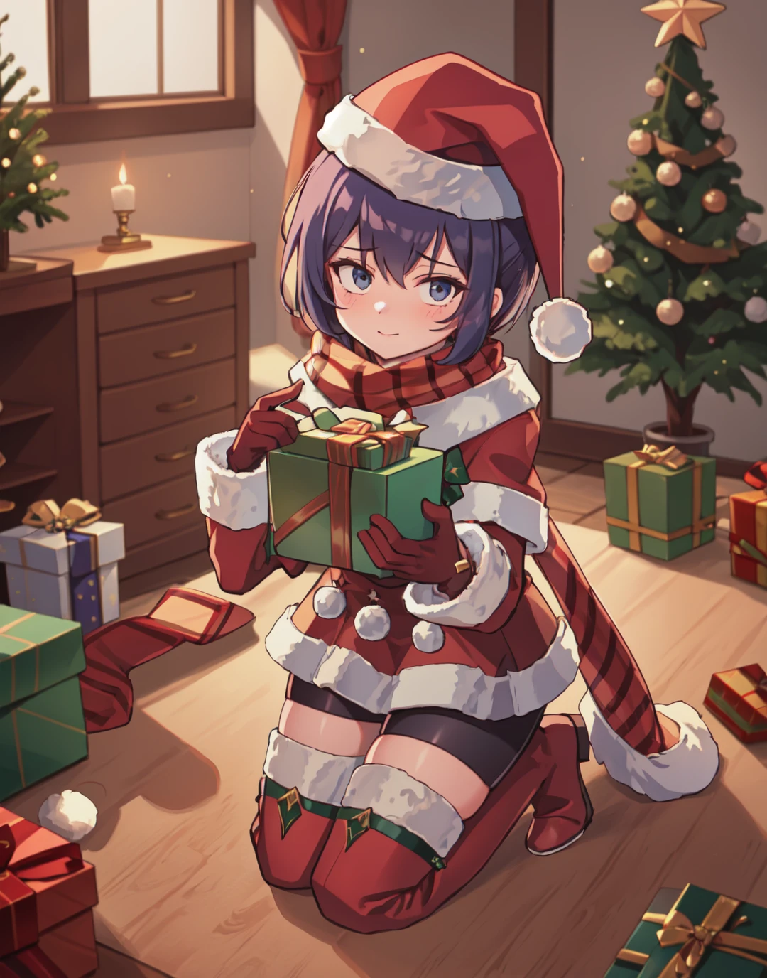 Prompt: xmasBernie, skirt, gloves, thigh boots, long sleeves, santa hat, scarf, fur trim, bike shorts