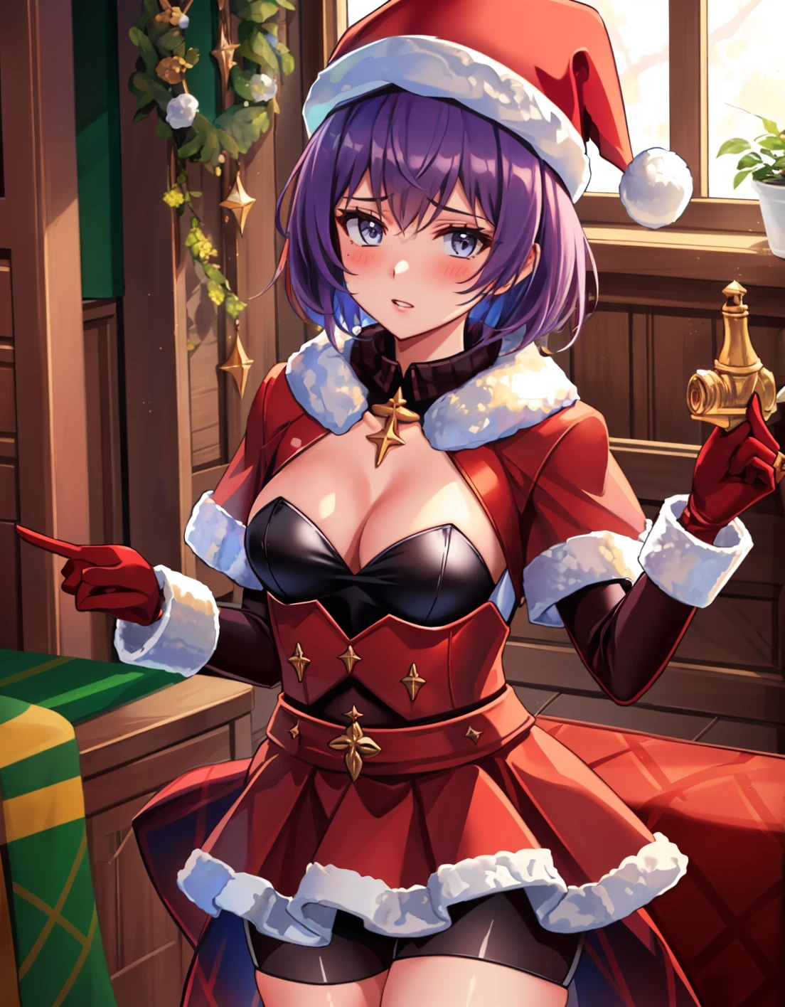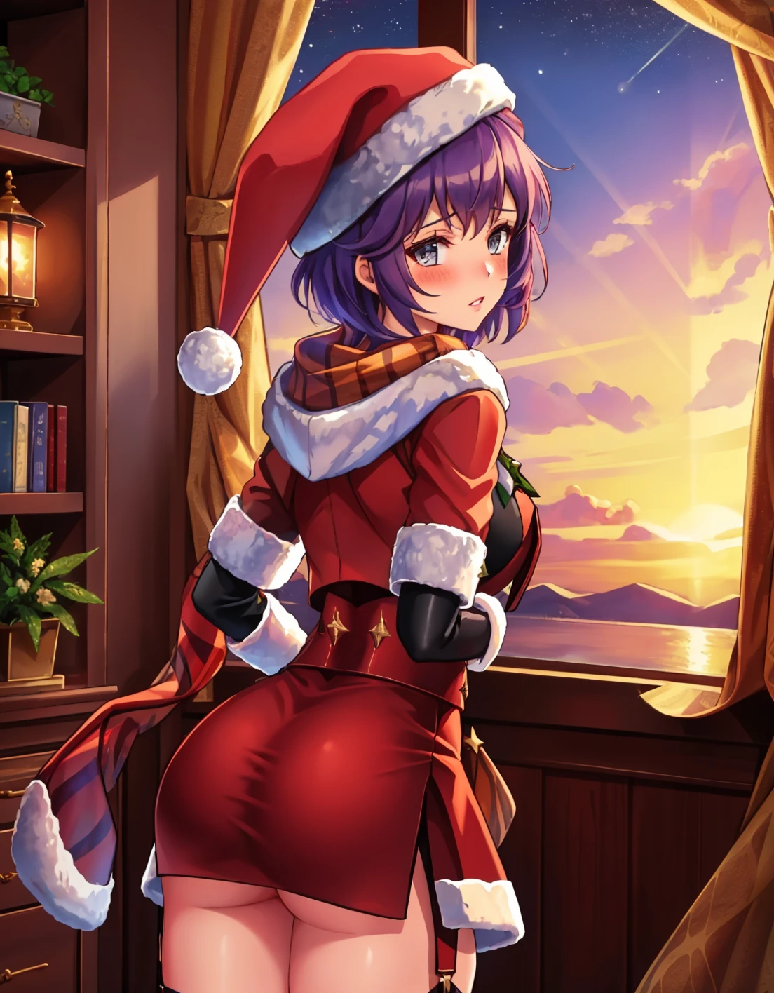 xmasBernie, skirt, gloves, thigh boots, long sleeves, santa hat, scarf, fur trim, bike shorts