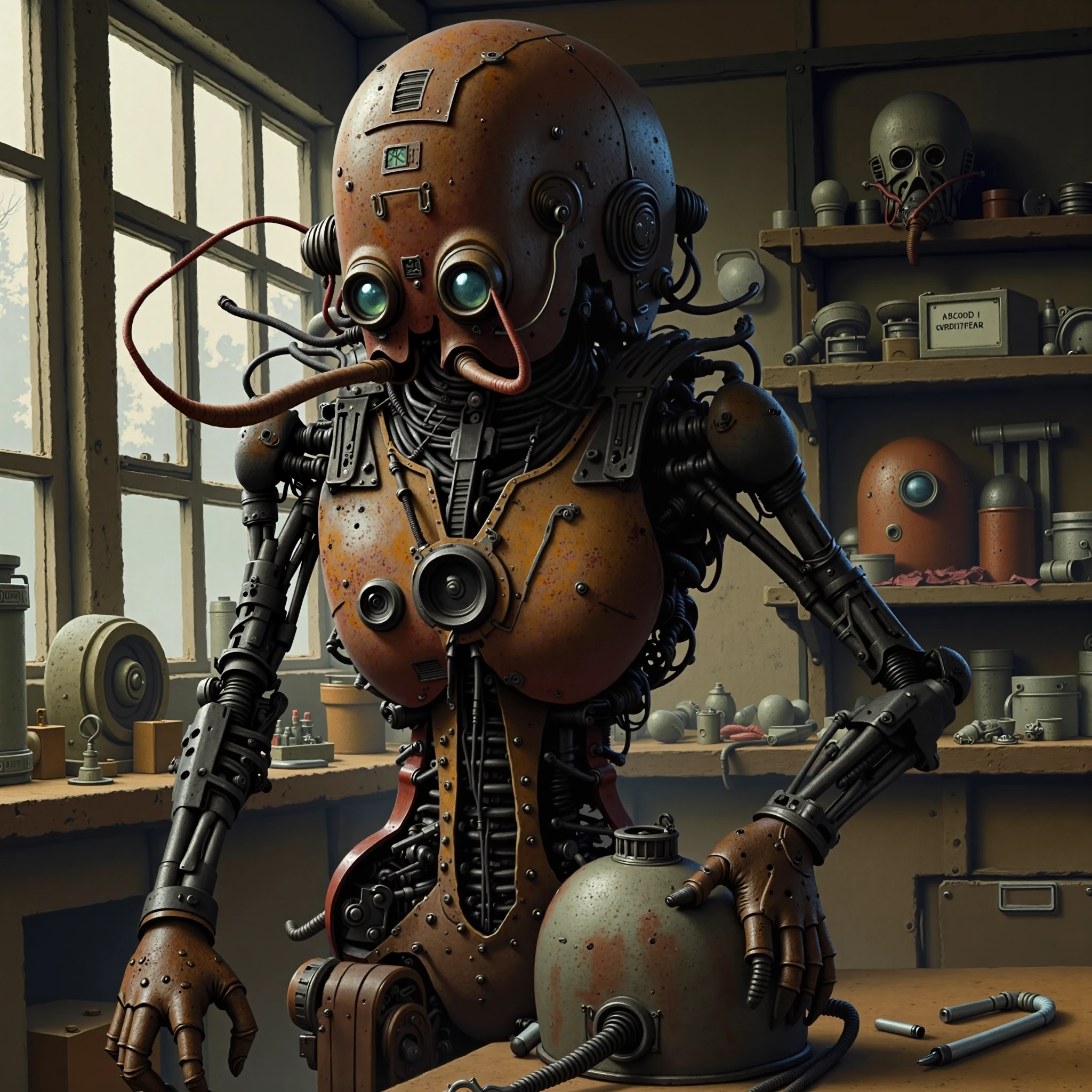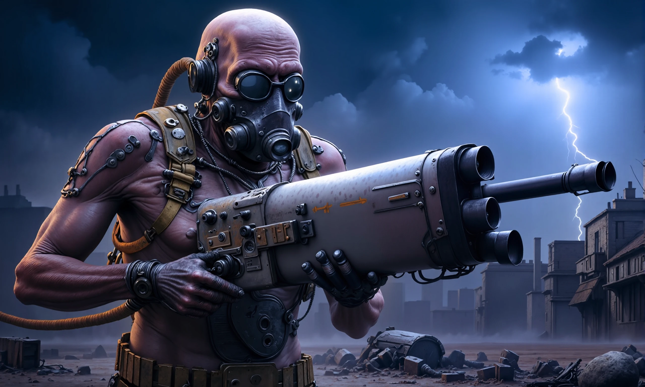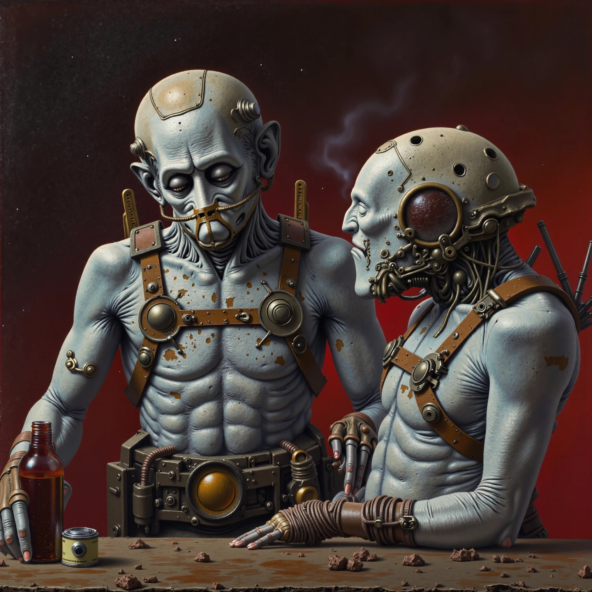 We are in a bleak dystopian world, the human race has declined into bio-mech mutants, the world is mostly desert the atmosphere pure poison, but hey, no reason to get depressed. Trained on wierd deformed creatures so don't expect sexy babes... the ??????? gets pretty funky but mostly makes sense. Promting mutant, bio-mech, post-apocalypse and similar will make it feel right at home