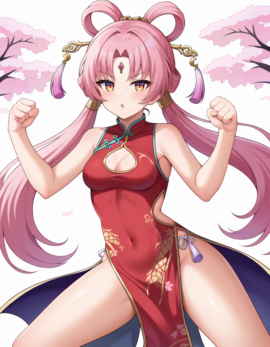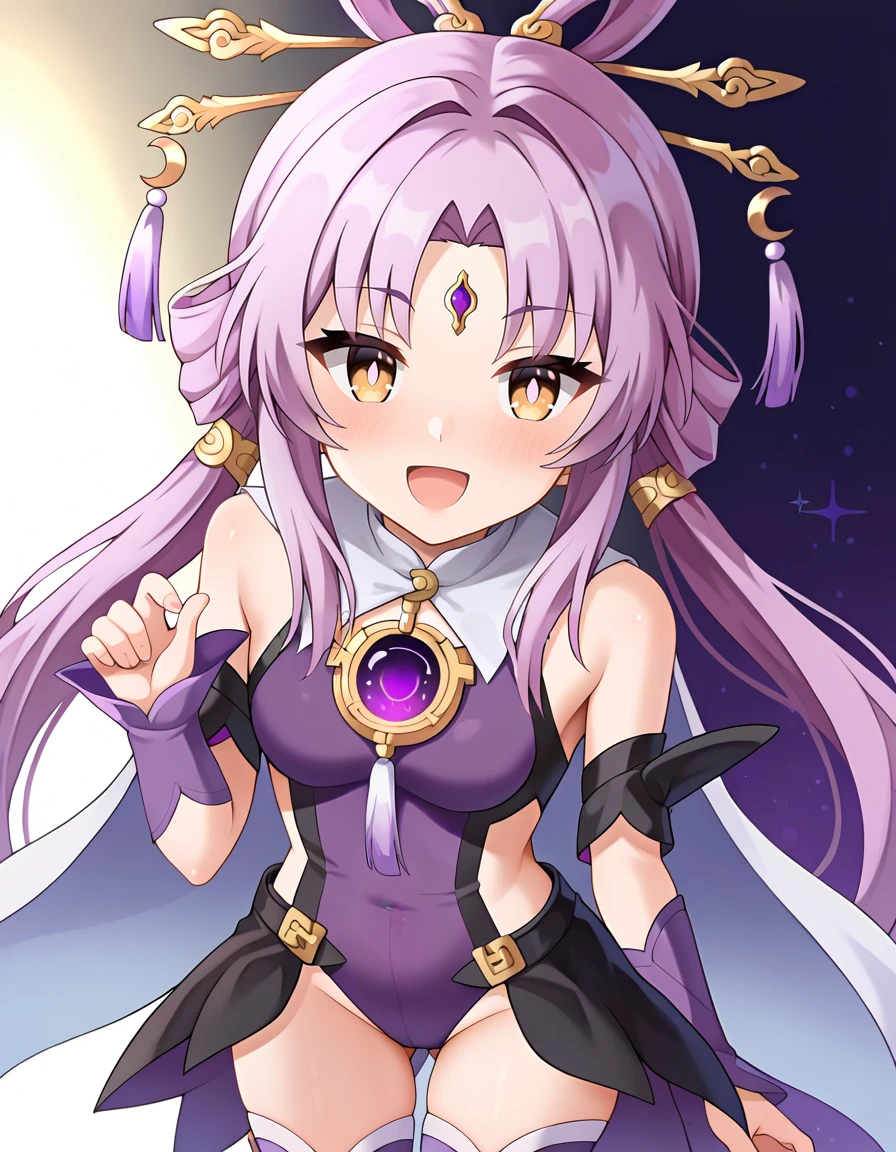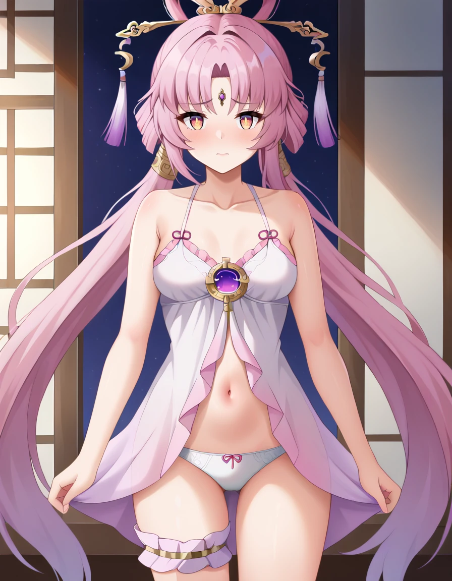fu xuan, long hair, bangs, hair ornament, tassel hair ornament, parted bangs, hair rings, very long hair, forehead mark, forehead jewel, jewelry, facial mark, twintails, detached sleeves, forehead jewel, jewelry, facial mark, twintails, white pantyhose, frills,