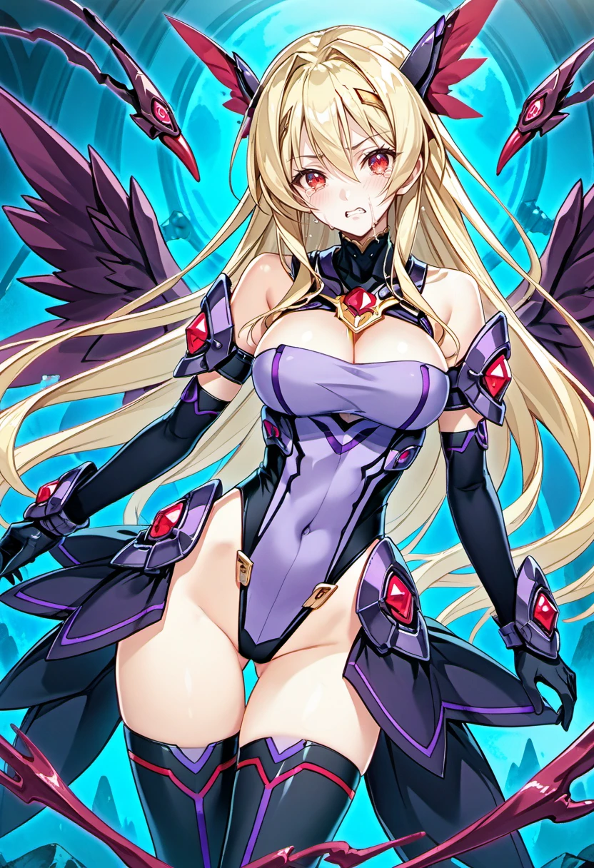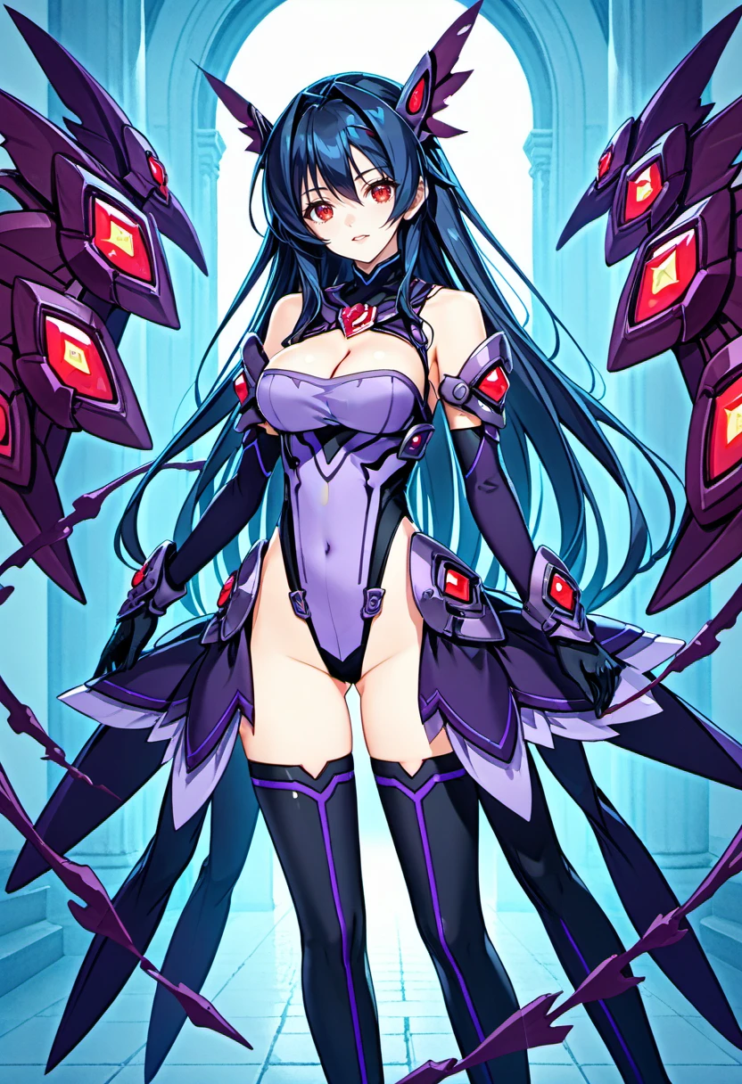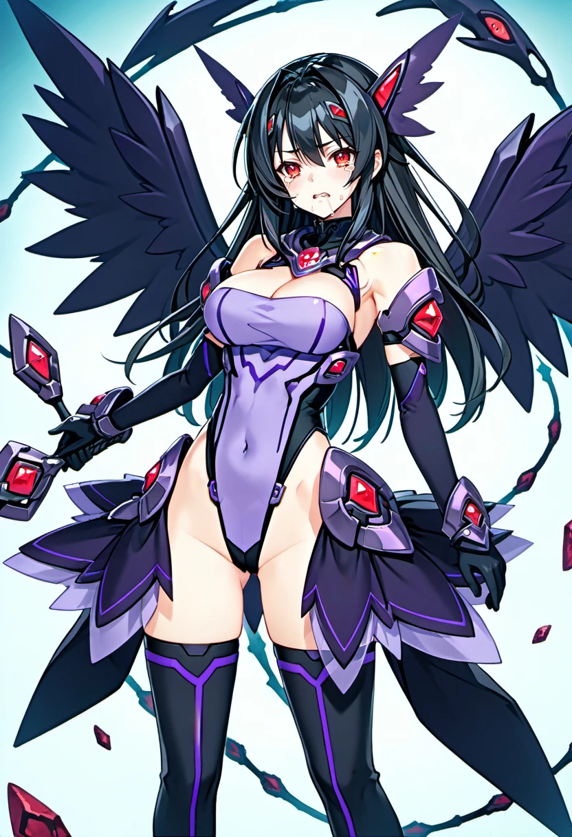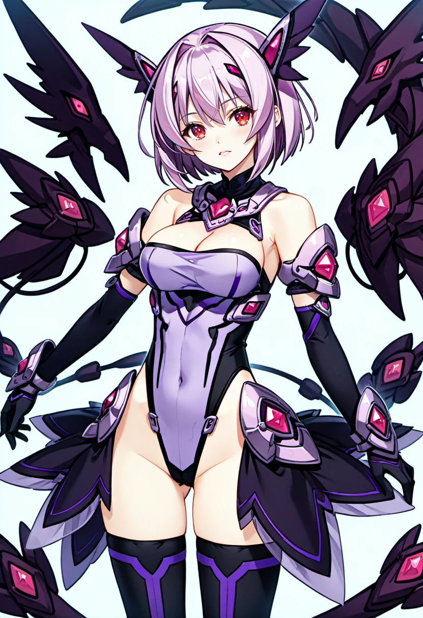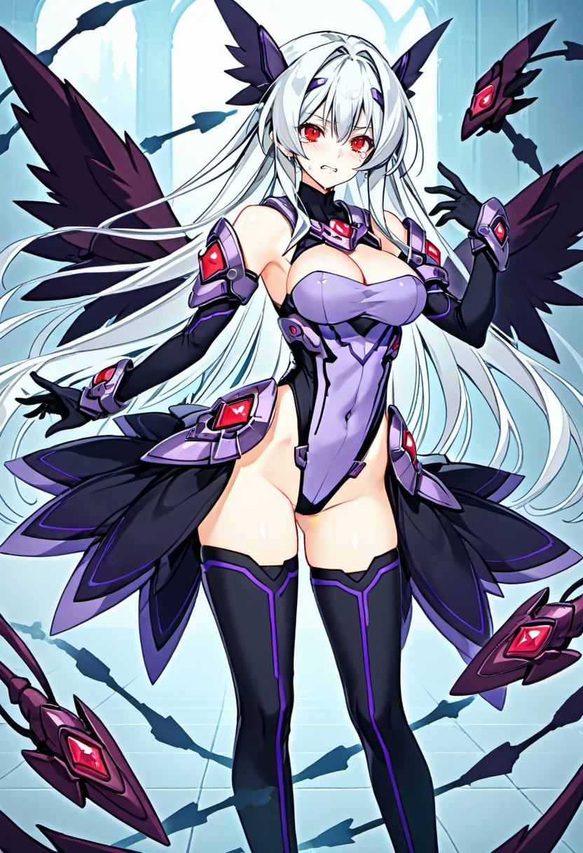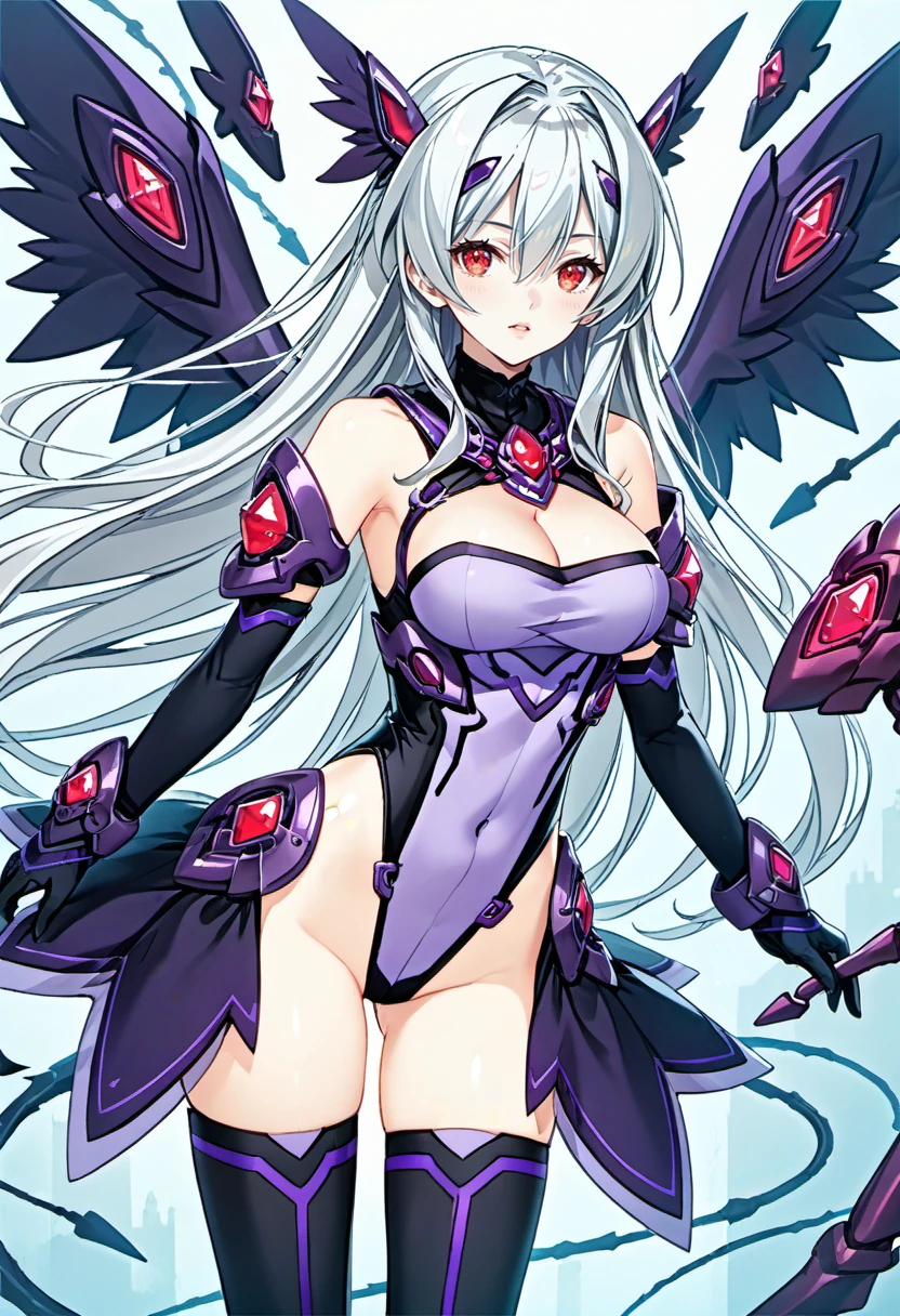 thighhighs,black wing,head wing, gloves, elbow gloves, boots, thigh boots, cleavage,bare shoulders, leotard,mechnaical head gear,(taight leotard),purple leotard,side armor,skirt armor,