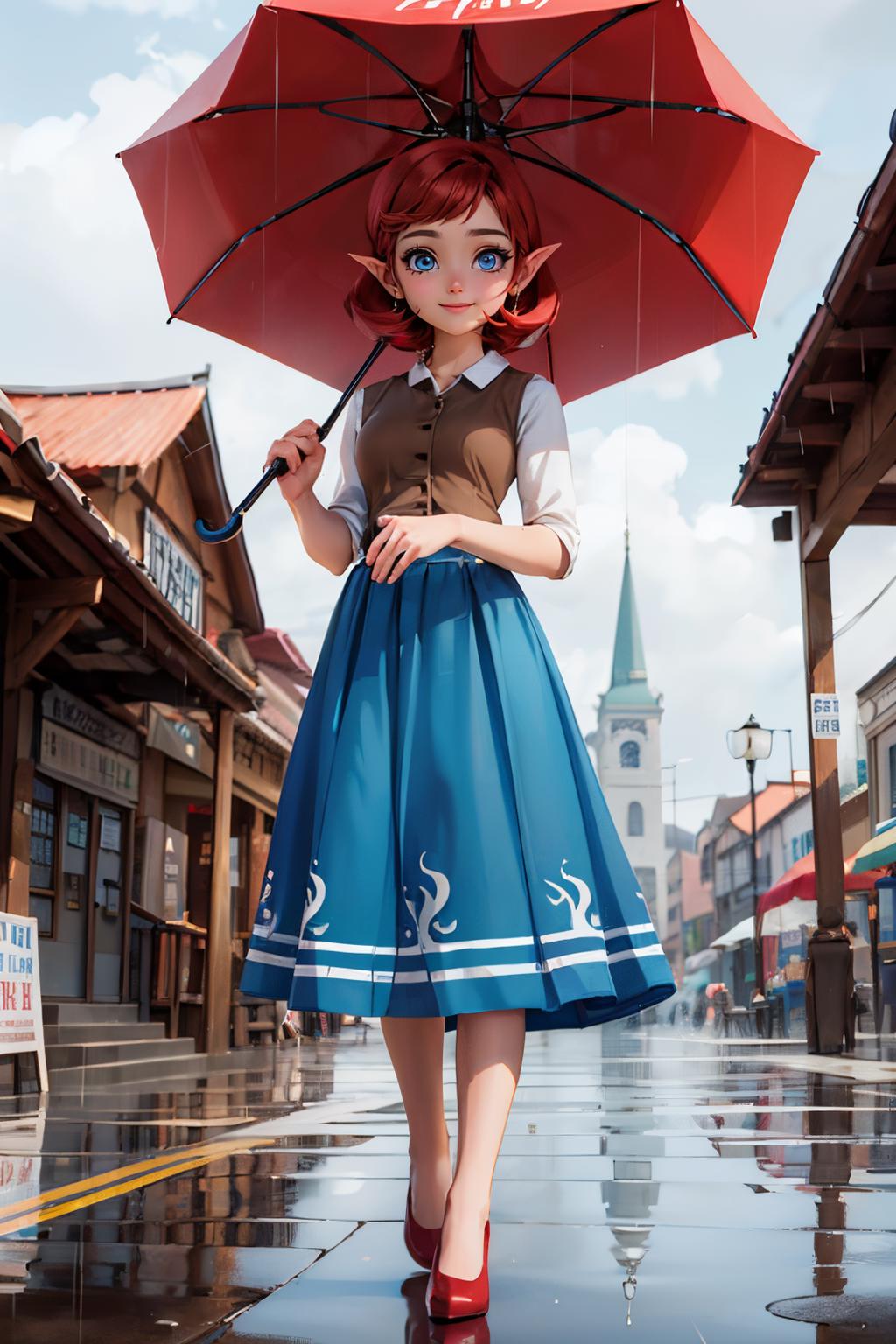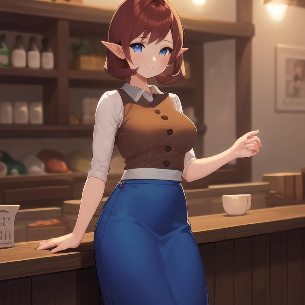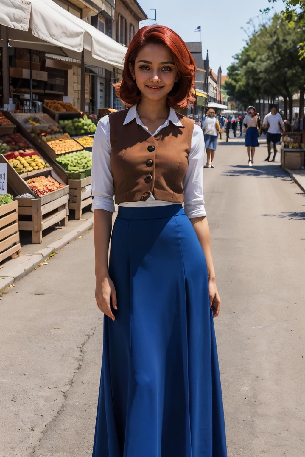 Use the tags: "blue skirt, long skirt, brown vest" to get her normal outfit