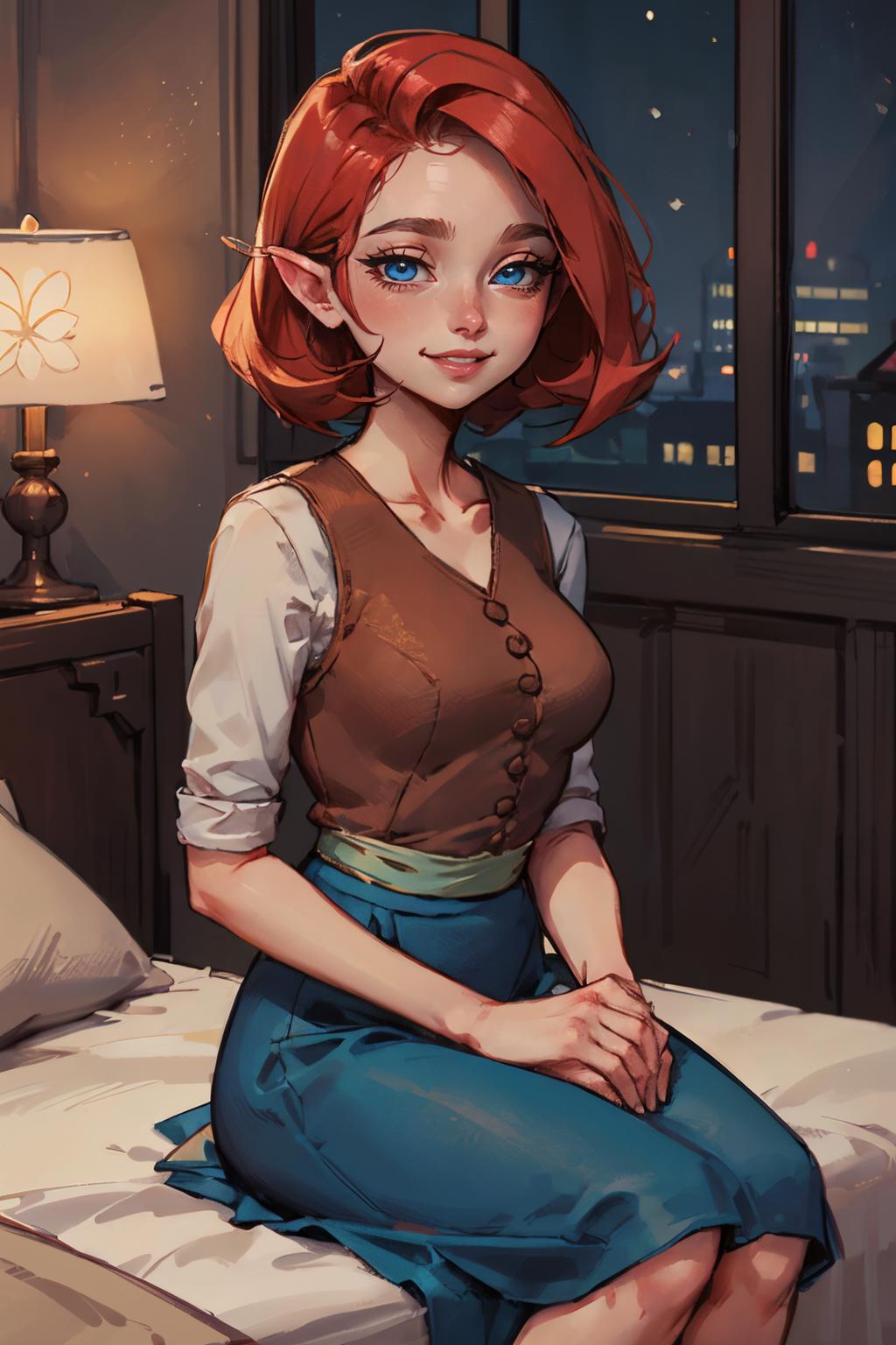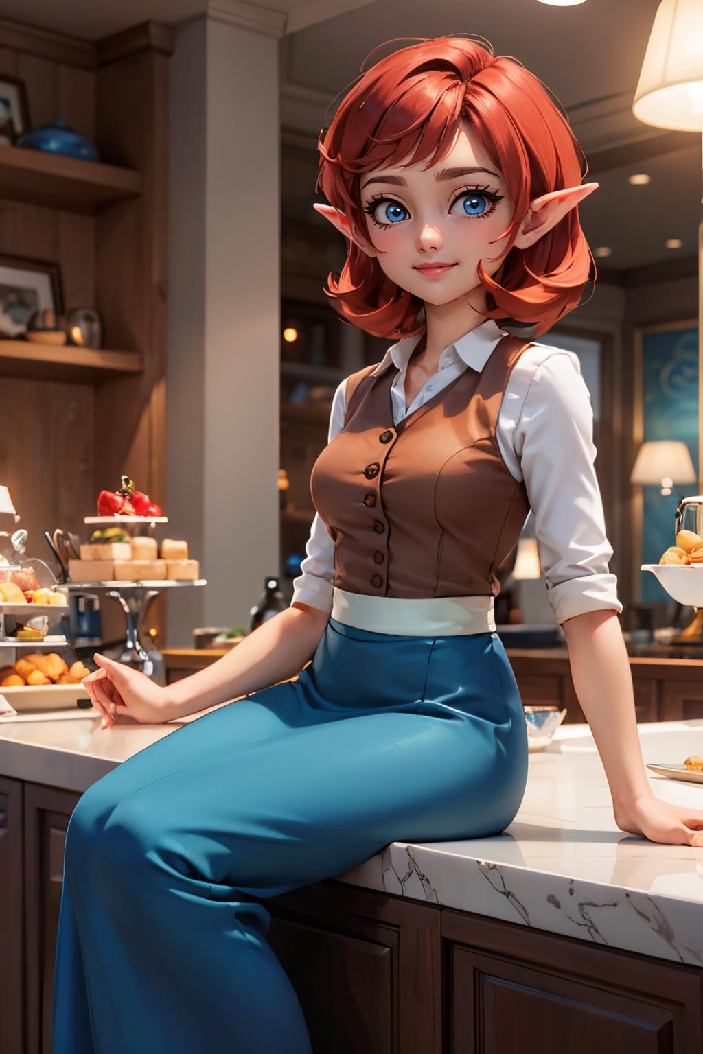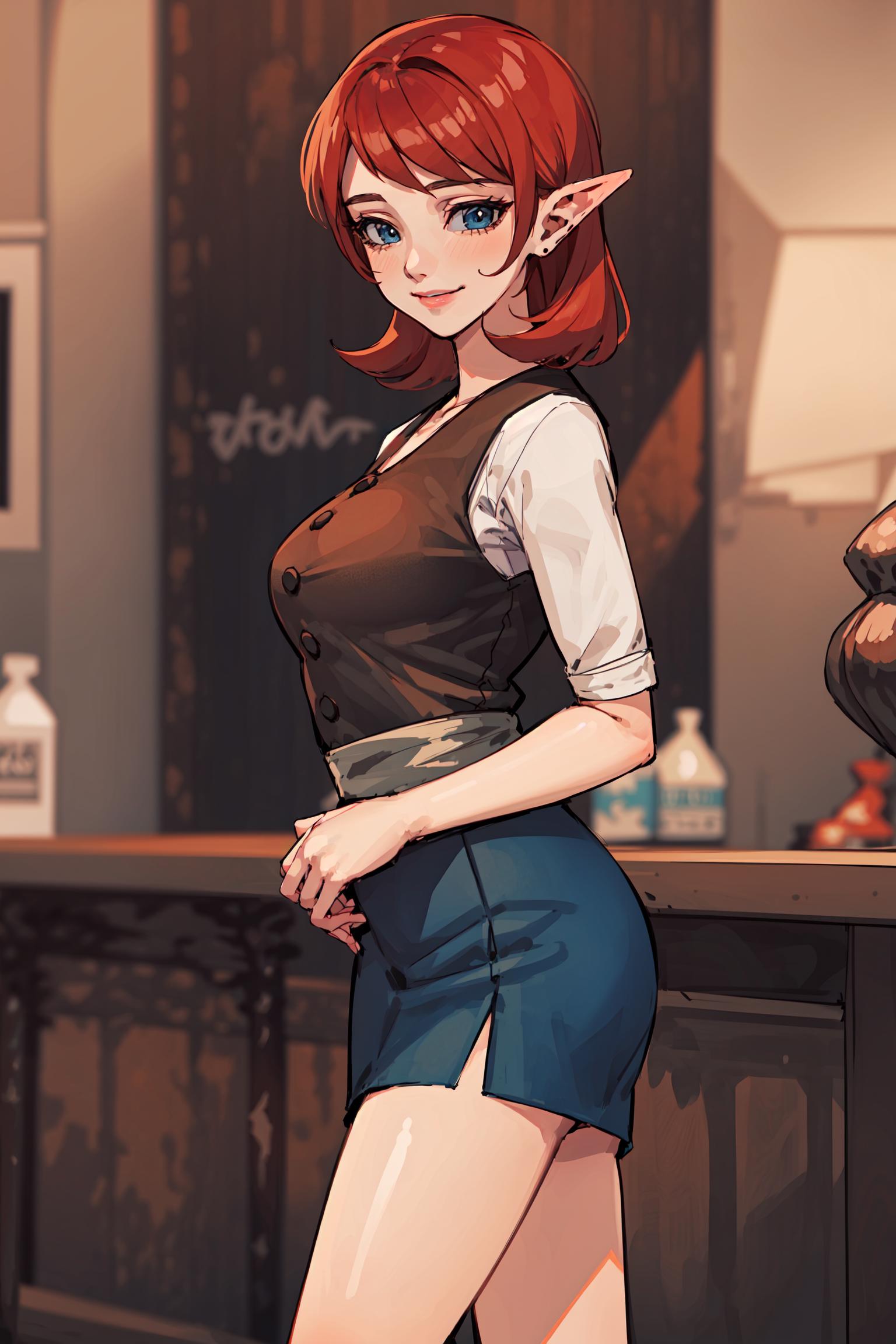 Use the tags: "blue skirt, long skirt, brown vest" to get her normal outfit